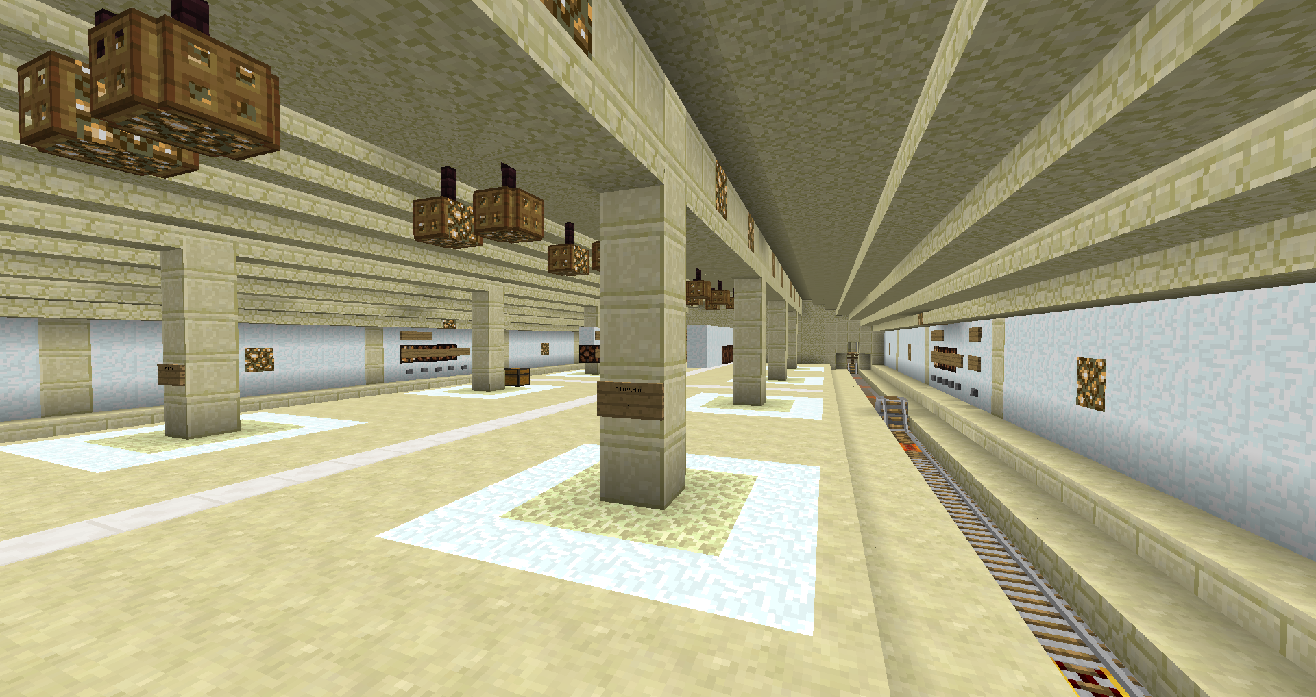 Спасибо за совет. [smile] Собственно сделал тут заново, не на своих наработках, две сороконожки, т.е. типовые сборные колонные трёхпролётные станции неглубокого заложения. Одна - просто раза в полтора длиннее моей первой "типовой" и немного шире. Другая с пропорциями примерно как у реальной сороконожки - ширина 19 блоков, длина 122 блока. В общем, второй вариант отбросил. [smile] С первым не знаю, мои два варианта более уютные что ли... Буду думать.
