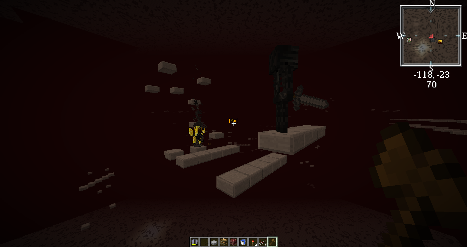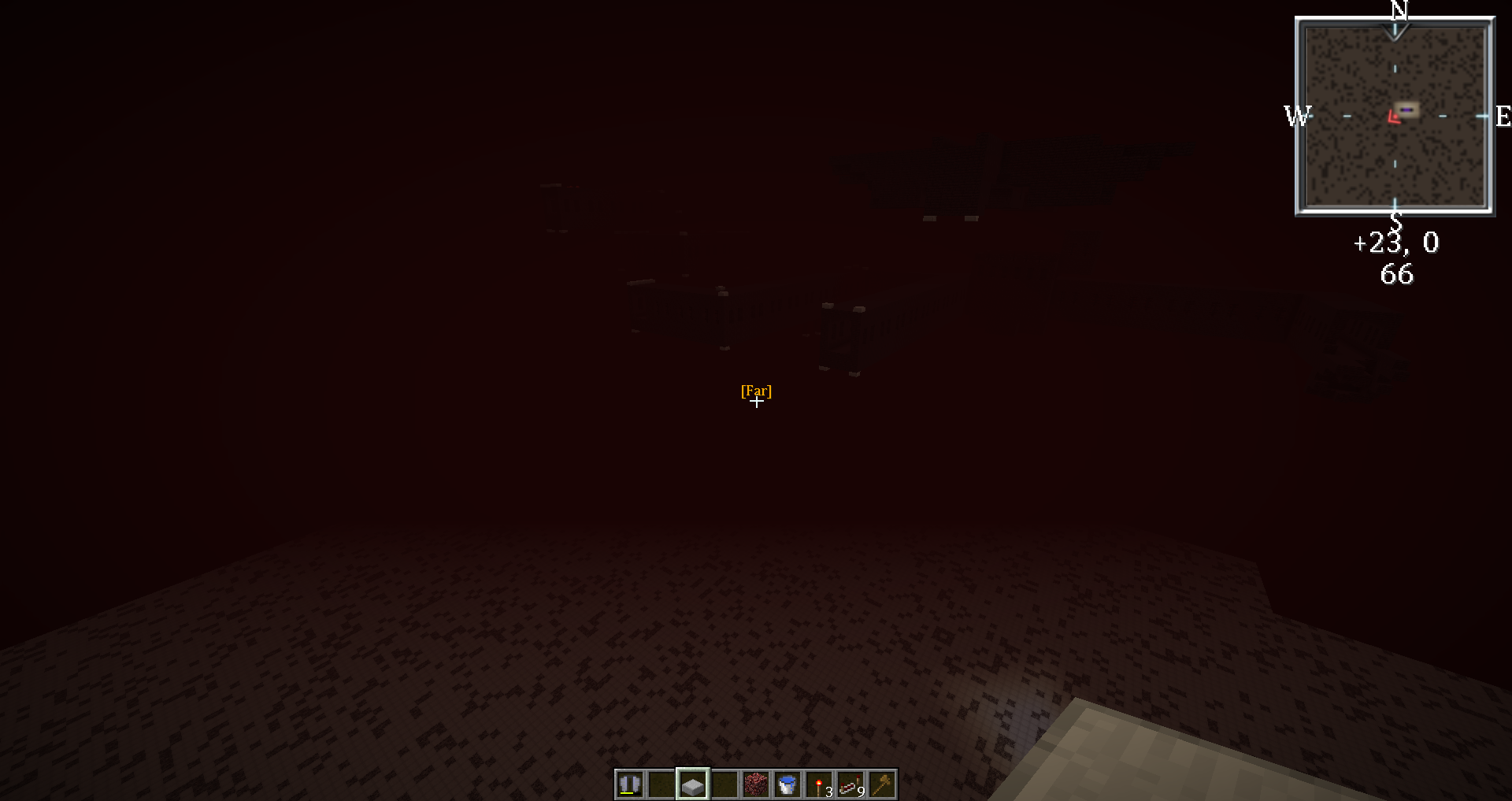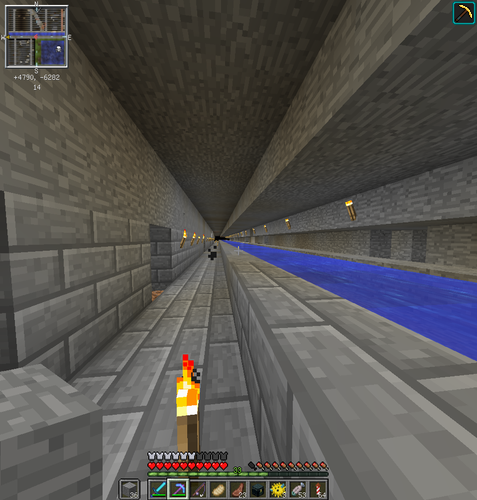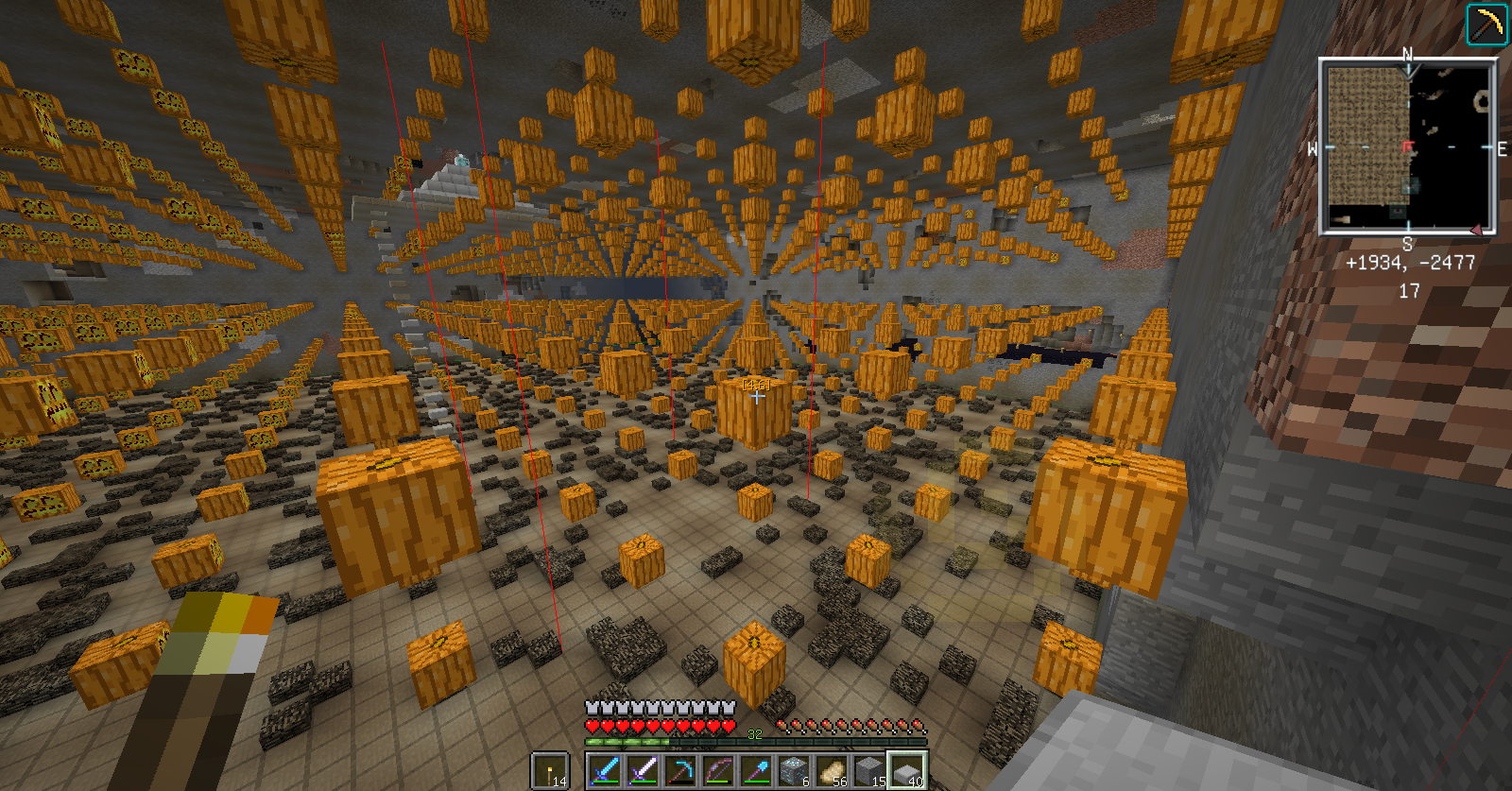 Тут было интереснее как спавнятся мобы, тыквы им не всегда мешают, даже бедрок не помеха. Но это скорее исключения. Плюс, как народ копает? снимая слой за слоем открываются очень интересные туннели. Но то что меня порадовало это портал в ад, как туда не подойду, там обязательно, то корова, то свиньи, то куры, а то зайцы.