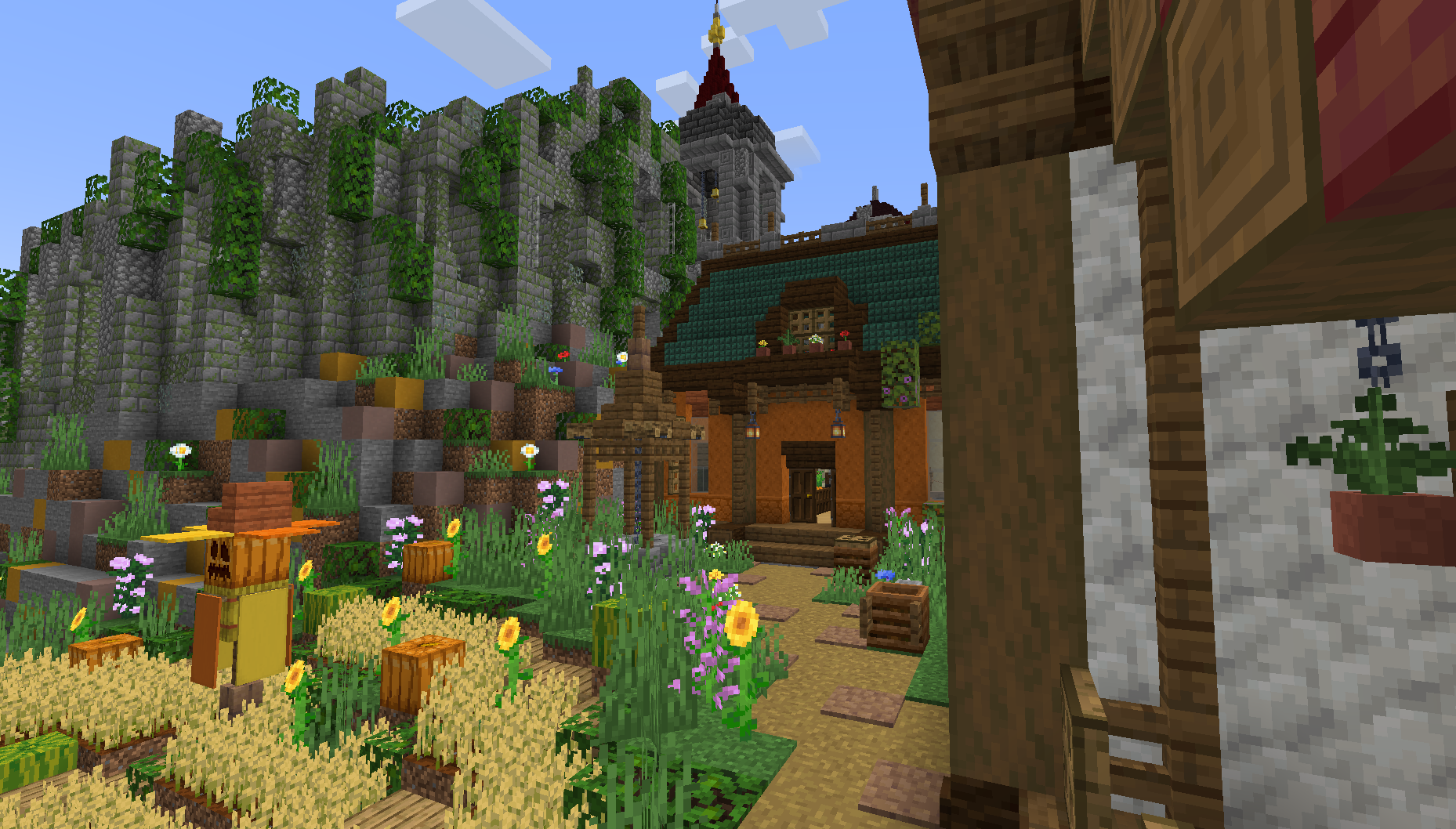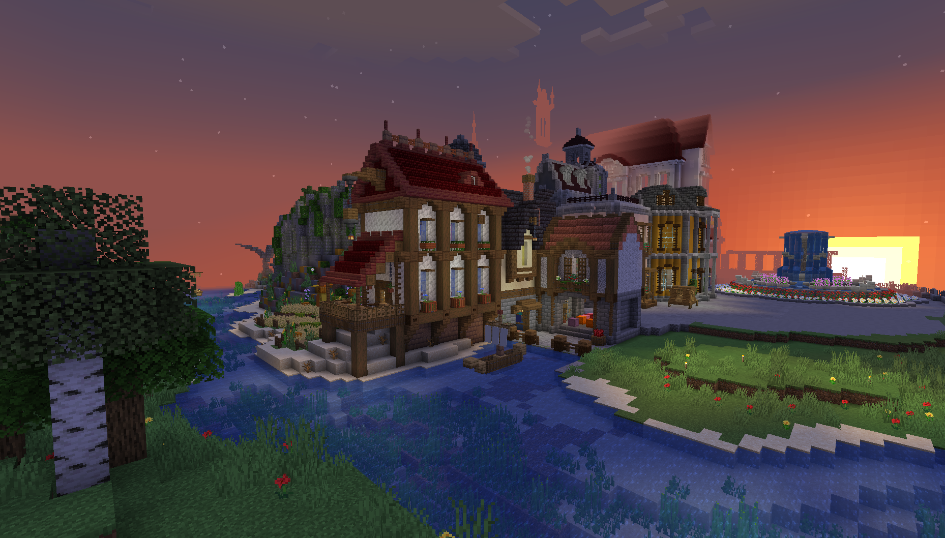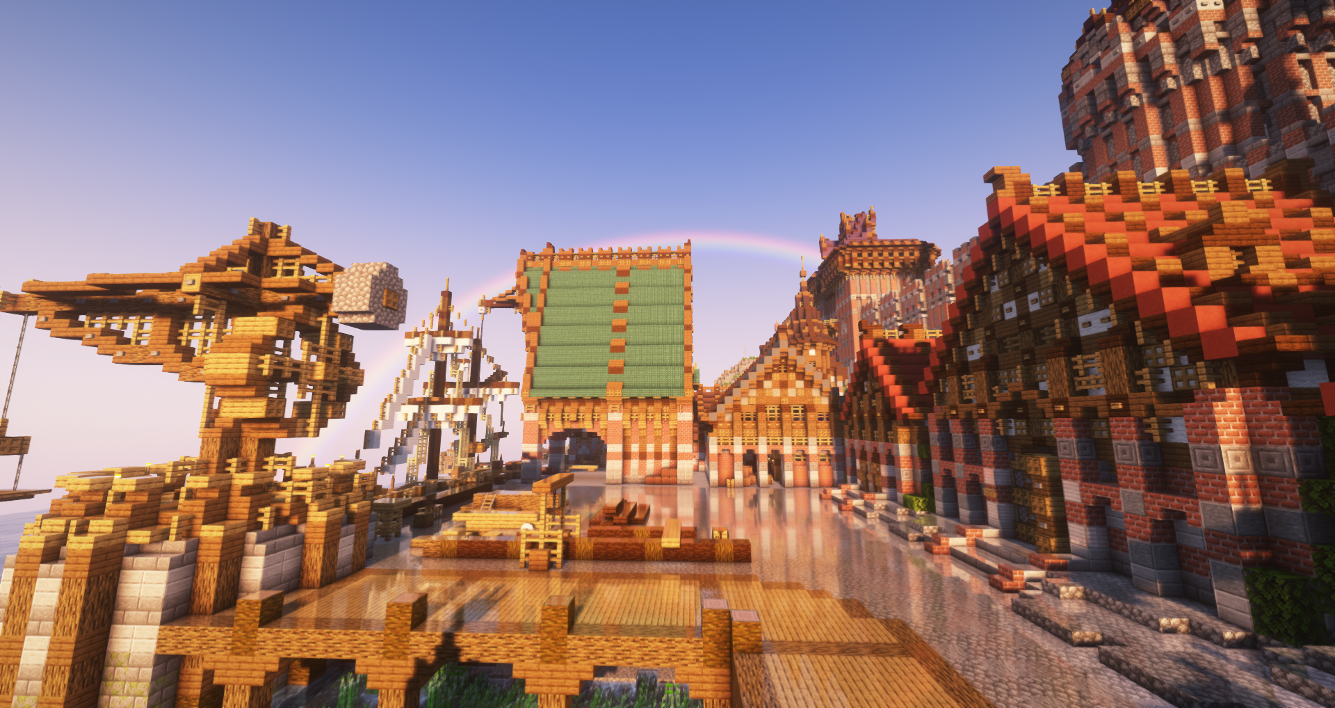 Красивости шейдеров. Только что дождик закончился, радуга в небе и всё мокрое.