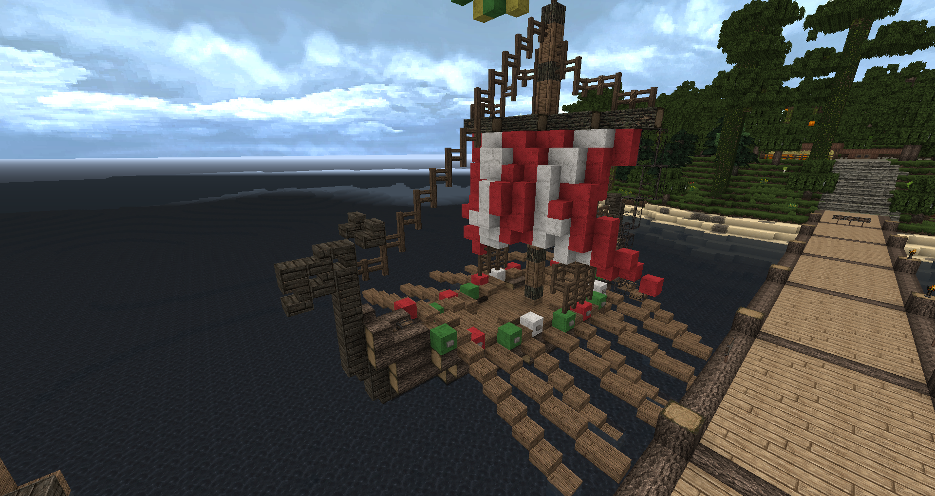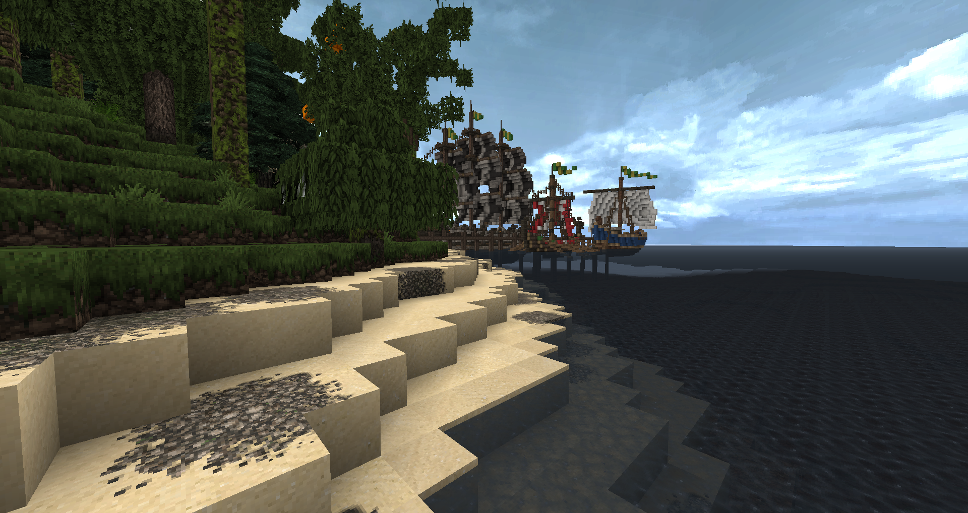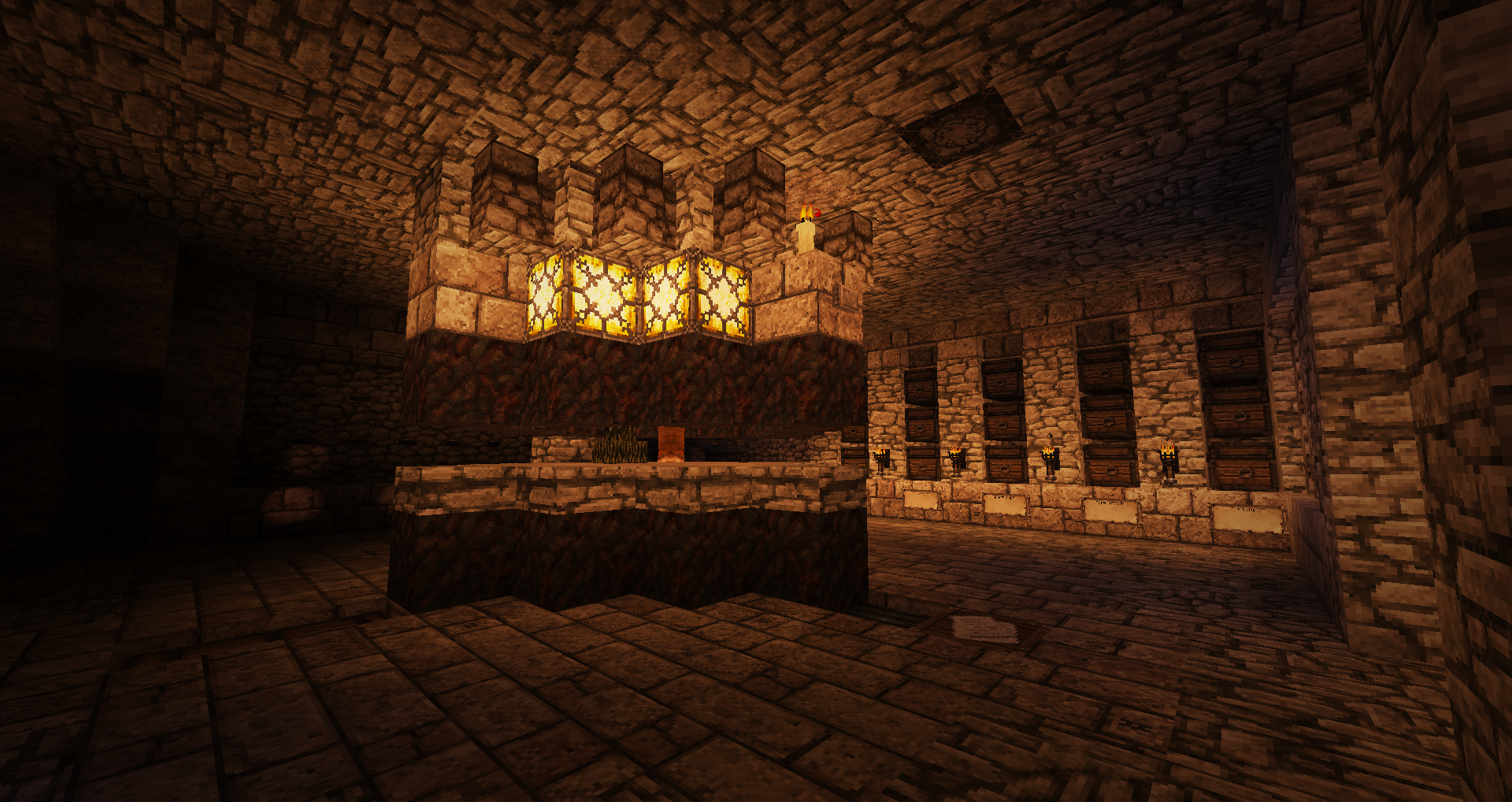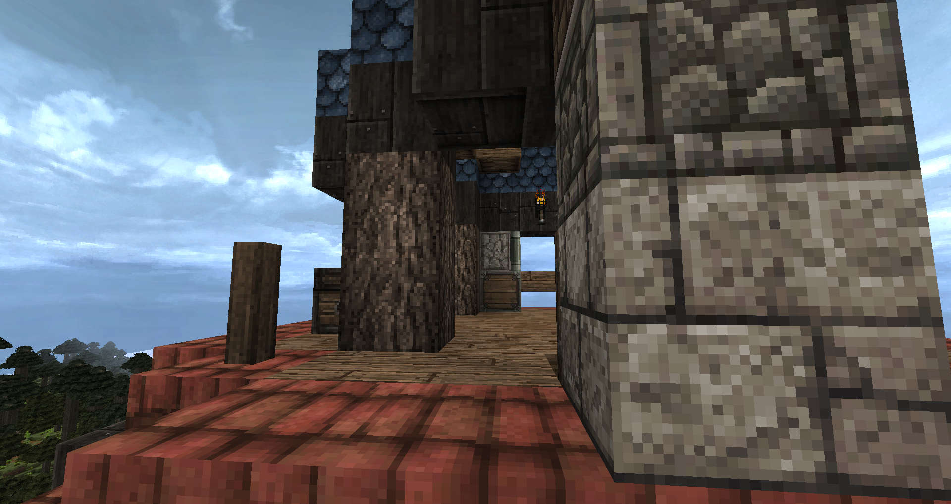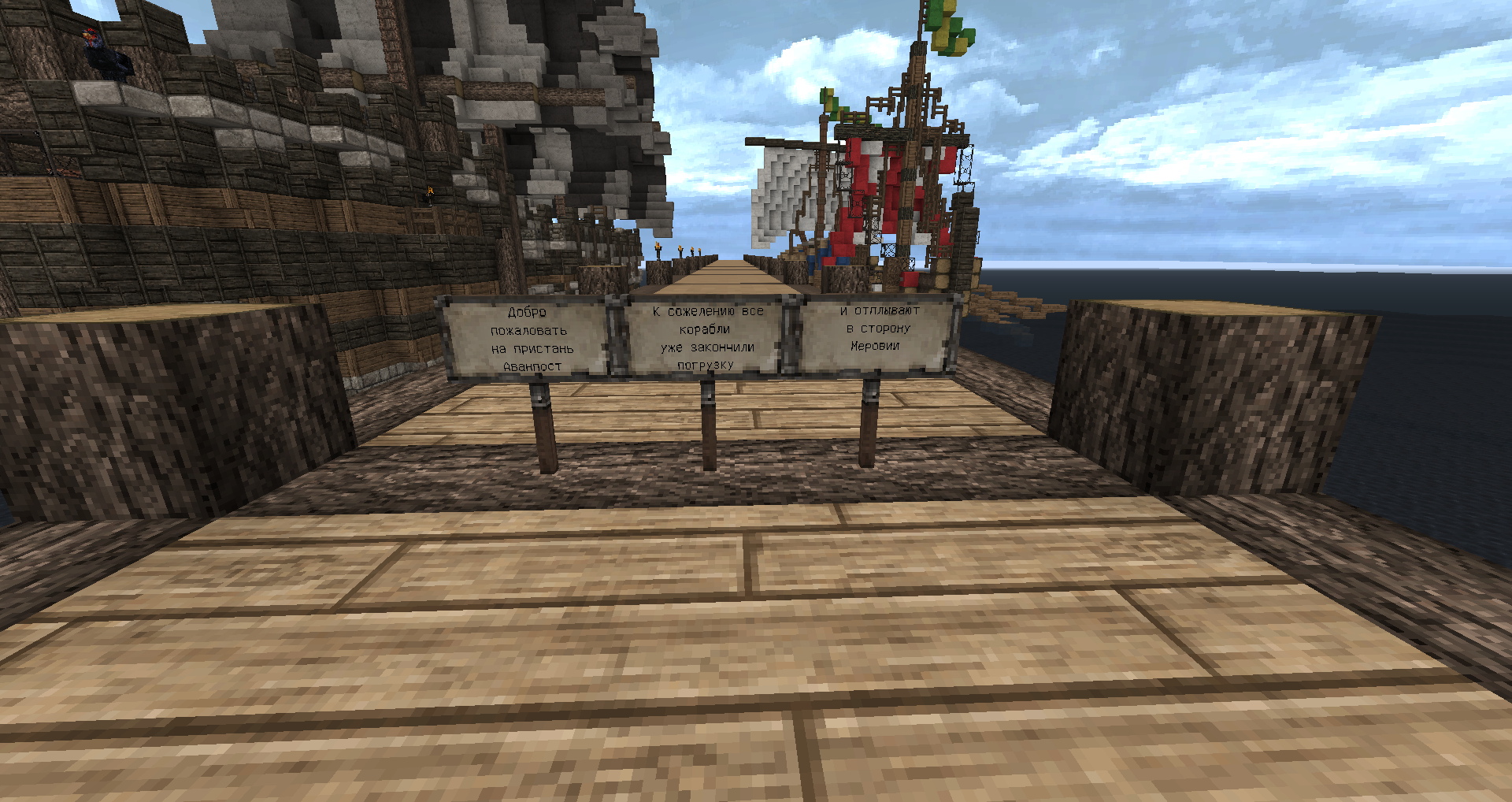 Доброго времени суток, уважаемые читатели! С вами "Вести из Меровии", очередной ленивый выпуск новостей о жизни этого архитектурного проекта. Для тех кто не знает, Меровия - город и окрестности на небольшом острове вулканического происхождения, который строится вот уже шесть лет. Наши примерные координаты +5000 -4000 Владелец и архитектор: angvar. Совладелец keeperd (Эйрин I) Ещё у нас куча жителей и владельцев домов, но перечислять всех слишком долго. Тема города: Меровия Карта Меровии: mrv_map_maintext_16.12.2017.jpg (немного устаревшая, и да, мы такие продвинутые и большие, что без карты никак). 1. Малярные работы. Согласно ещё плану от Сурисо, крыши башен и ворот должны иметь цвет синей глины (т.е. фиолетовые в стандартном текстурпаке, в Conquest с цветом всё в порядке). Новые башни и ворота после строительства замка, строились уже с синими крышами, маяк после передвижения также выстроен с синей крышей. Ира перекрасила то ли 5, то ли 6 башен стены. Далее дело временно приостановилось, но... Но Ангвар подумал, почему бы нет... и в итоге потихоньку всё сделал. Происходило это как-то так. Сейчас стены и замок смотрятся единой архитектурной композицией, а не так, как раньше. Израсходовано около трёх сундуков глины. С виду много - но в Меровии такие расходы - обычное дело. 2. Ферма мобов на темноте Спавнер скелетов погиб при переносе на 1.10, оставив Меровию без качалки. Вроде оно и не так плохо, спавнеров вокруг тыщщи, надо лишь найти нужное количество в прямой видимости и выстроить качалку. Но в первые недели после перехода на 1.12, например, пока её не построили, приходилось чиниться разбивая киркой на удачу, руду. Раз спавнер не починить, мы пойдём другим путём. Долго думали, долго гадали, надо ли оно, решили что не надо - спавн мобов был ужасен, т.е. его толком и не было. Однако, в последние недели спавн наконец нормализовали, и качалки на темноте снова стали эффективны. А раз так, то надо строить. Первоначальный вариант от Птицына, сделанный им за городом ещё в начале года, работает, но плохо - там нет смыва мобов, а сами они бродят мало, поэтому пришлось строить второй вариант. Даже не помню, у кого увидел впервые эту конструкцию, но увидал её на 1.11. Суть - квадратные ярусы с треугольной формы площадками, на которых происходит спавн и на которых растекается вода с раздатчика. Вот для наглядности, скриншот яруса. Мобов смывает вниз, затем они плывут далее к центру и попадают в тоннель, ведущий к месту истребления. На скриншоте в заголовке раздела - это самое место и показано. Кнопка на одном из блоков - включает смыв, решил не делать таймер - нет смысла. Лампа вверху завязана на переключатель, это индикатор растекания воды. Под площадкой полублоков - воронки, они принимают лут в два сундука. Автосорировку тоже не делал за нецелесообразностью. По результатам работы качалки. Чинится с её помощью инструмент на починку за приемлемое время, но спавн зависит от погоды на полюсах Марса и онлайна игроков. Лучше всего работает, когда народу меньше десятка, но и то, бывает что смывается куча, бывает что один-два. В целом, удобная штука получилась. Единственная её проблема - пауки. Они тоже спавнятся, они тоже падают вниз и разбиваются. Но не все. Некоторые как-то цепляются за стенку и падают-поднимаются в тоннеле. Мешается, но иногда попадавшие мобы не дают пауку уйти и он попадает под карающий меч. В ближайшие 