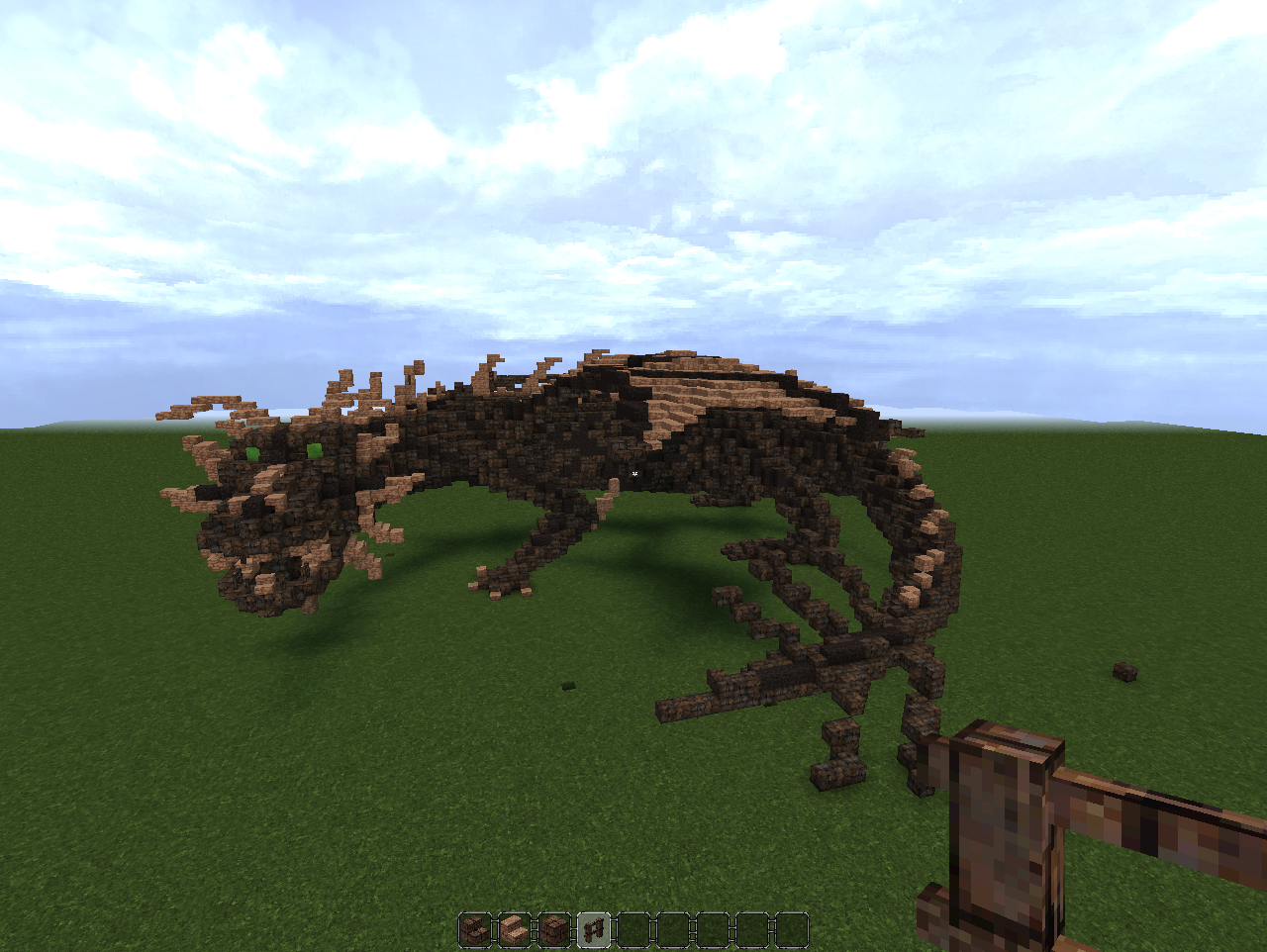 А снизу там трёхблоковая пустота. Почему бы не добыть ценный ресурс в виде дерева и кирпичей, а заодно не срубить пол, получив, таким образом, большую пустоту для какой-нибудь фермы?