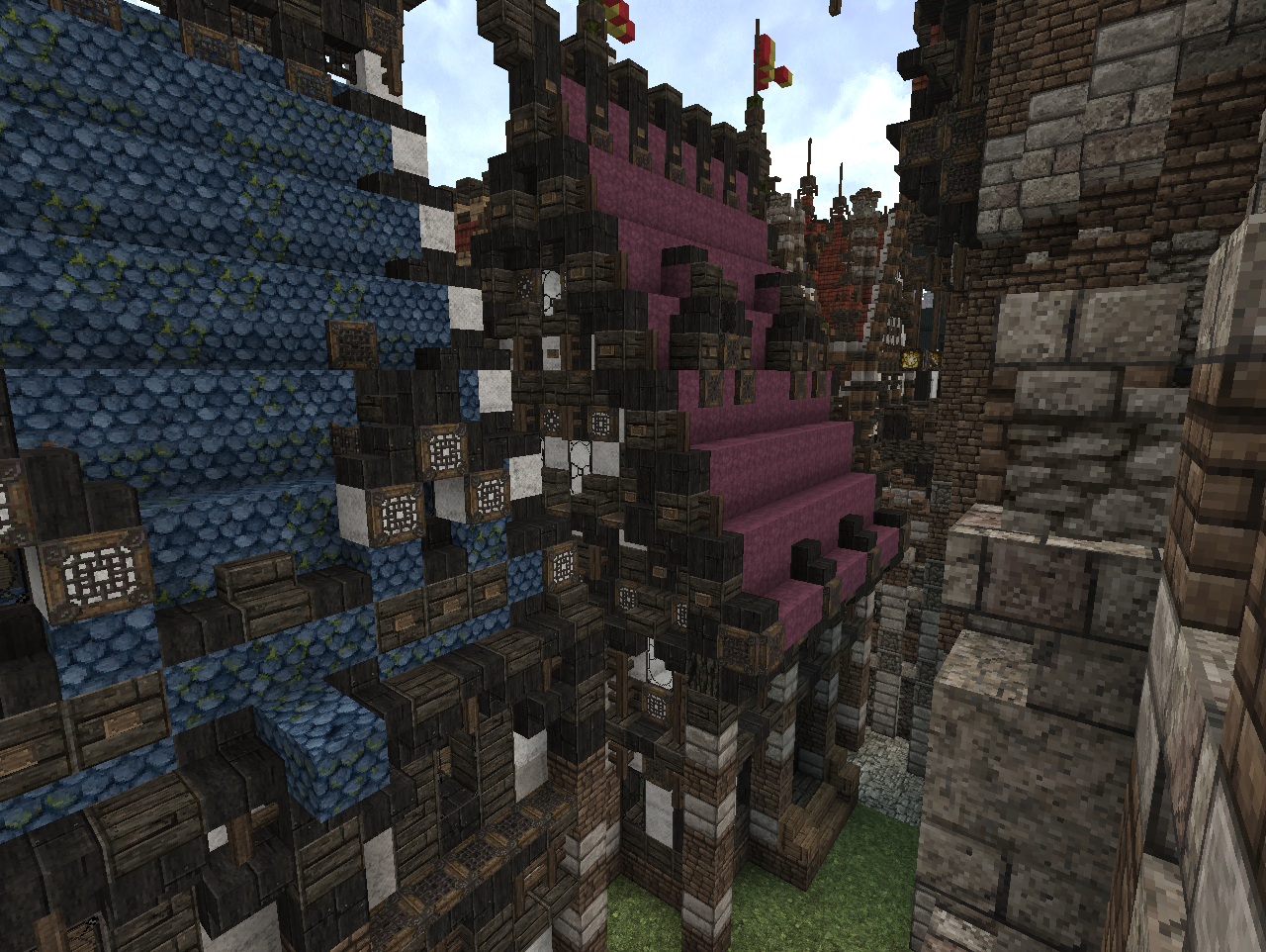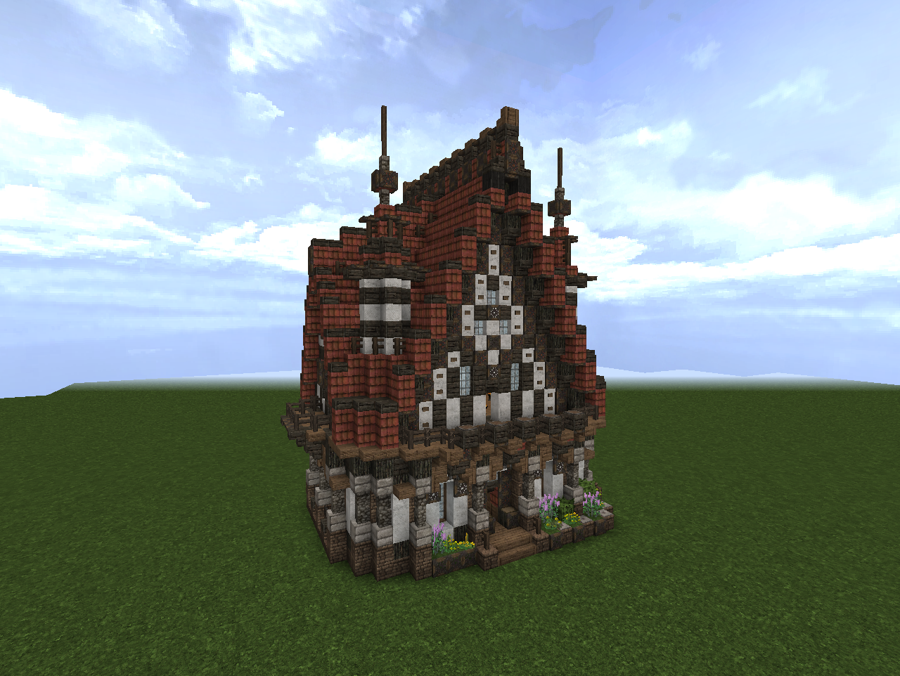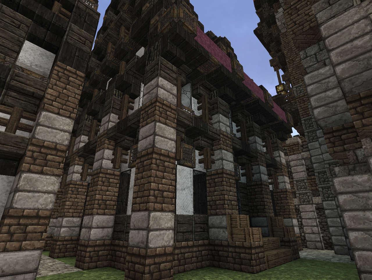 3. Вытянул рёбра по углам, а также относительно симметрично по периметру стен. Первые блоков шесть, то бишь высоту первого этажа, сделал кирпичом, далее деревом, чередуя еловые доски и брёвна тёмного дуба. Связано это с принципом строительства всех зданий Меровии с незапамятных времён: тяжёлый камень снизу, дерево и штукатурка (её изображает шерсть) сверху. Прямо тут же разнообразил кирпич вставками из сдвоенных каменных плит - это сочетание вообще классика из классик для Меровии.