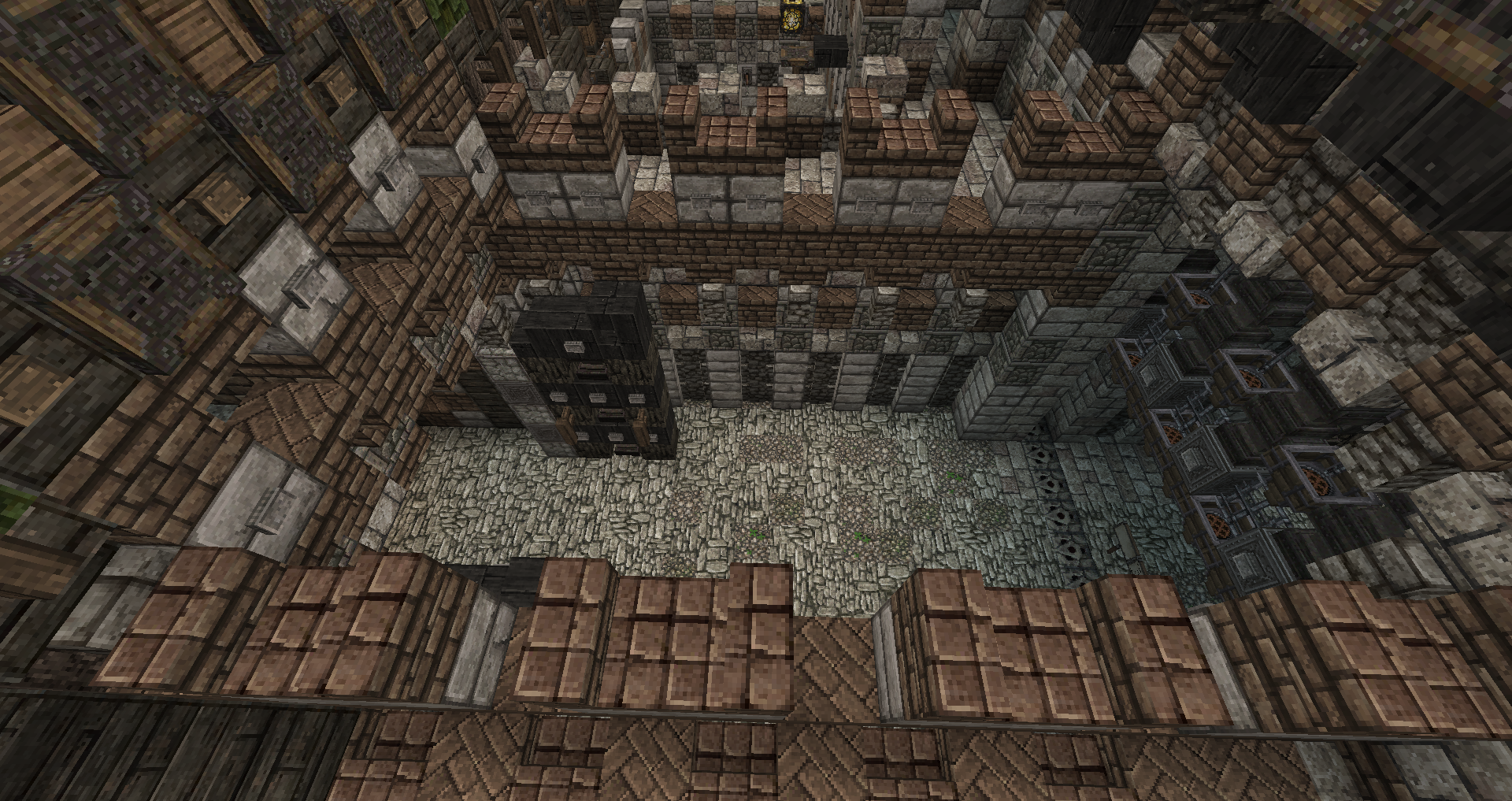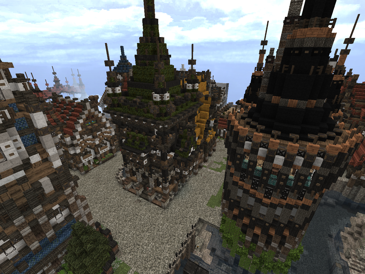 Почему от венца шпилей отказался? Оказывается моя версия стартовой площадки для элитр, в верхушке шатра, не совсем моя - сначала Сурисо думал про такой вариант, но поскольку центральный шатёр башни был не таким высоким как сейчас, то ему казалось что есть риск попасть при старте в один из шпилей вокруг (хотя по мнению Ангвара, это надо умудриться именно случайно влететь в шпиль). В итоге вся верхушка была взорвана, шатёр сделан обычным, а рядом пристроена та "дымовая труба" с маяком на верхушке.