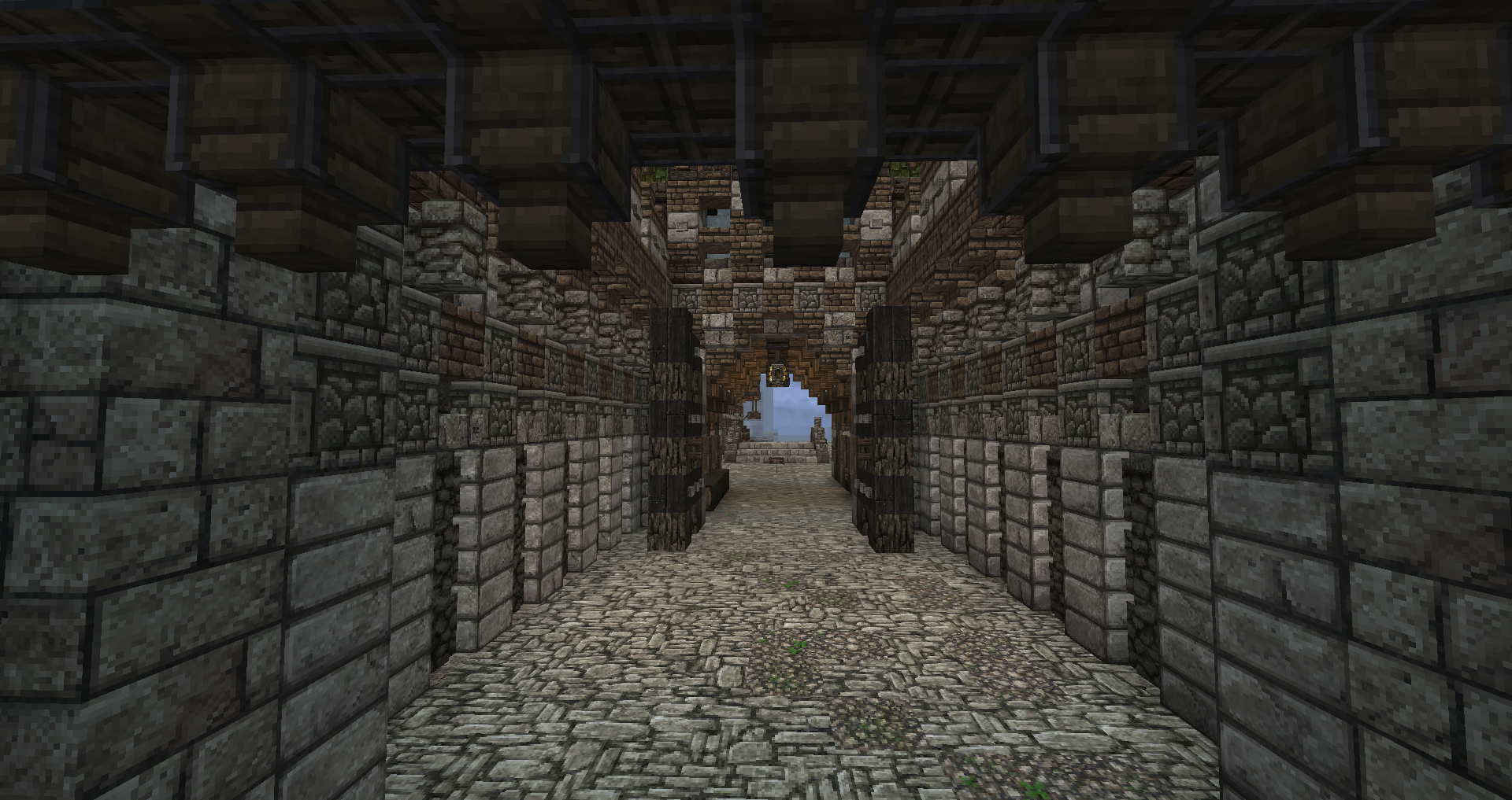 Проходной ярус забавной пристройки к разделительно-подпорной стене. В его пределах есть лестница на верхний двор, лестница к залу с колодцем, и второй вход в подземелья.