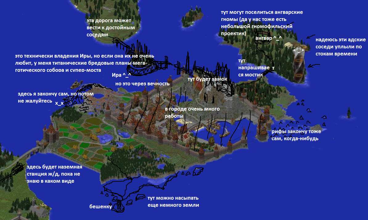 Всем привет. Новости нашей стройки за неделю. I - Гора Ира (keeperd), angvar, Fluke и все остальные, кто помогал трудами и ресурсами, проделали просто титаническую, беспримерную работу с обновлением меровийской горы. Она, в целом, закончена, не считая нескольких мест, где уже требуется стыковка со структурами замка (который пока не начинали). Без преувеличения можно сказать -- это один из самых сложных (как в плане размера, так и детализированности) терраморфов севера. Было: Cтало: Еще до: Еще после: Верхушка, конечно, пока скорбна без замка. Но грядет и он. Впрочем, даже сейчас в игровой реальности штука просто подавляет, желающие могут побродить. II - Прогресс по замку Я тоже старался не терять времени и неплохо продвинулся с некоторыми частями замка (хотя и, как всегда, не совсем теми, что планировал). Почти готова северная сторона. Здесь еще есть небольшая неопределенность с окнами и деталями (некоторые не оформлены и слегка зияют), но это все постепенно обретет свои формы. Детализировал "башню мага" (рабочее название). Мелочь, но все же -- добавил кранеляции вдоль дороги наверх, за барбаканом. Делает вид более законченным. С крышей и двориком пока прогресс, надо признать, скромный. Карала работа эту неделю, было лень делать самые сложные вещи. III - Перенос и железная дорога Грядущий в декабре перенос вызывает много оптимизма и потенциальных перемен. Спойлер: Кхе-кхе Пара мыслей. Во-первых, уже сейчас зарождается новое движение, которого в организованном виде сервер ждал очень давно -- глобальная сеть наземной железной дороги. Что особенно радует, заниматься этим решили взрослые, надежные игроки, следовательно, шансы на успех очень оптимистичны. Меровия, в свою очередь, полностью поддержит эту инициативу с точки зрения лоббирования, популяризации и, главное -- практики. Мы подготовим нашу инфраструктуру к подключения и, по возможности, поможем с возведением ветки до Осгилиата (материалы, проекты мостов и прочее). Скорее всего у нас будет 2 станции, одна у моста, наземная, позволяющая прогуляться по пригородам пешком, вторая после подземного участка, прямо в центре города. В скором времени, думаю, будет какой-то большой анонс и отдельная организационная тема по сюжету. /// Второй вопрос -- география переноса. Мы остаемся на старом месте и, в целом, скорее всего не будет расширяться в смысле привата (кроме отвода, может быть, некоторых дорог и мостов). Слишком много дел внутри текущих владений. Но, хотелось бы попросить всех, кто так или иначе наш сосед или планирует им стать -- будет лучше, если вы предупредите о своих планах. Безусловно, я не могу вам запретить что-либо переносить или строить, но, если вы хотели бы какого-то минимального взаимодействия -- чтобы мы протянули к вам дорогу или как-то агрессивно не огораживались, стоит все немного обсудить. Ниже потенциальные наброски как может за 17 измениться наша конфигурация. Сразу скажу это даже не планы, а супер-дальние-мысли-на-вечность-вперед. Особо впечатлительные читатели и особенно меровийцы -- не мучайте меня : ) IV - Геральдический бонус С кем общаюсь, знаете, что работаю в туризме, в частности, много с Испанией, Каталония-Валенсия. Так вот, обнаружил недавно, что у Валенсии так называемый coat of arms практически идеально наш! Круто, да? В целом же символика Меровии это микс из 3 трех штук. Валлийский (кельтский дракон), 