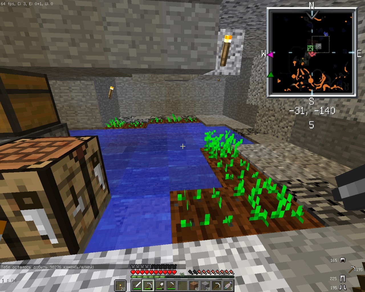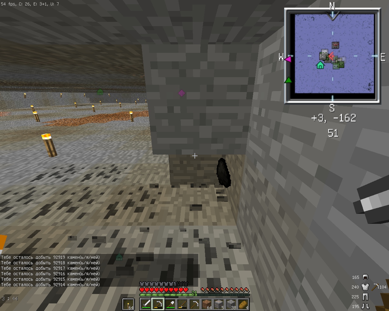 Вот и я побывал на Колыме за свою глупость. В тот день новенькие активно спрашивали разное про то, как играть и в числе вопросов было в том числе и по поводу текстур. Через час после этого у меня закончилась последняя кирка и я вспомнил, что брат моей сестры попадался с одной вещью для добычи алмазов. "Ну я-то умный, меня-то не поймают". А вот и нет, поймали. Молодцы. Приятно осознавать, что наказание неминуемо и за всем внимательно следят. По поводу самой Колымы: да жопа это, скучная, унылая задница, из которой хочется быстрее выбраться. Пока копал, сделал некоторые подсчеты: 100 блоков камня добываются железной киркой за примерно 1,5 минуты. 100,000 блоков - куб примерно 46*46*46. Прочности 1 железной кирки хватает на 250 блоков. 100,000/25=400 кирок 1 кирка - 3 слитка 400*3=1200 железных слитков 1200/64=18.75 стаков слитков Количество чистого времени на добычу только камней 100,000/100=1000 1000*1,5=1500 минут=25 часов Но ведь надо и поесть, и порыбачить (выгодное дело, рыба хорошо восстанавливает здоровье, ловятся книги, которые можно применить на наковальне). И добывается не только камень, но и земля, гравий и прочее "лишнее". В-общем, ну ее нафиг, Колыму эту. Ни с кем не объединялся, просто спрятался и копал. П.С. Еще только в самом конце вспомнил, что шерсть можно скрафтить из ниток, так что кровать появилась поздно, приходилось бегать до дома так.