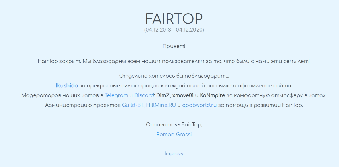 А с какой целью ЕГО теребить? Все эти "рейтинги" рано или поздно "канут в лету" (со слов руководителей более успешных проектов - они в них даже не размещаются, все эти "MC" и всякие "ТОПы" - это "развод" для "школо-серверов" ))) Если только попросить убрать строку FairTop из списка...