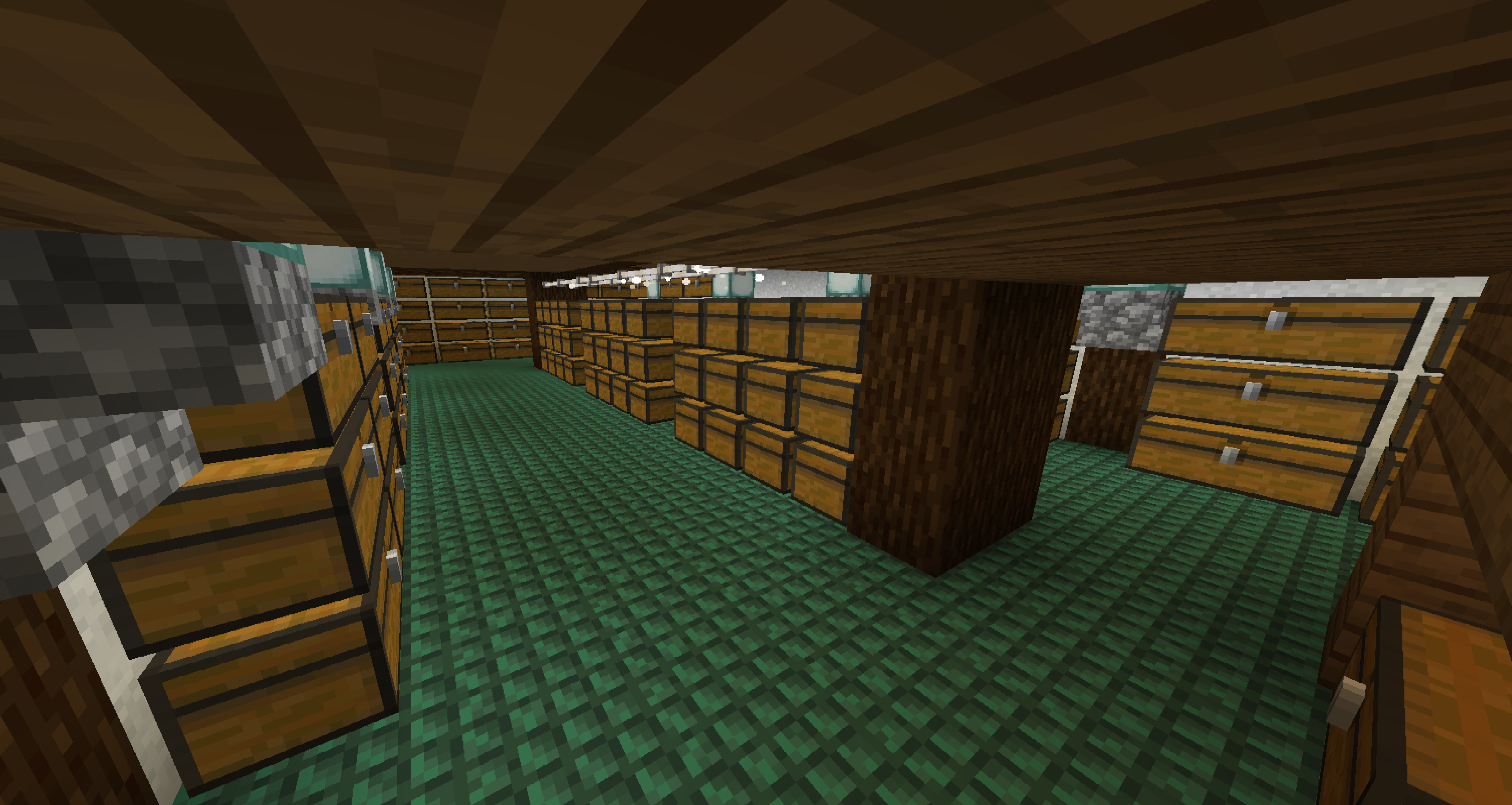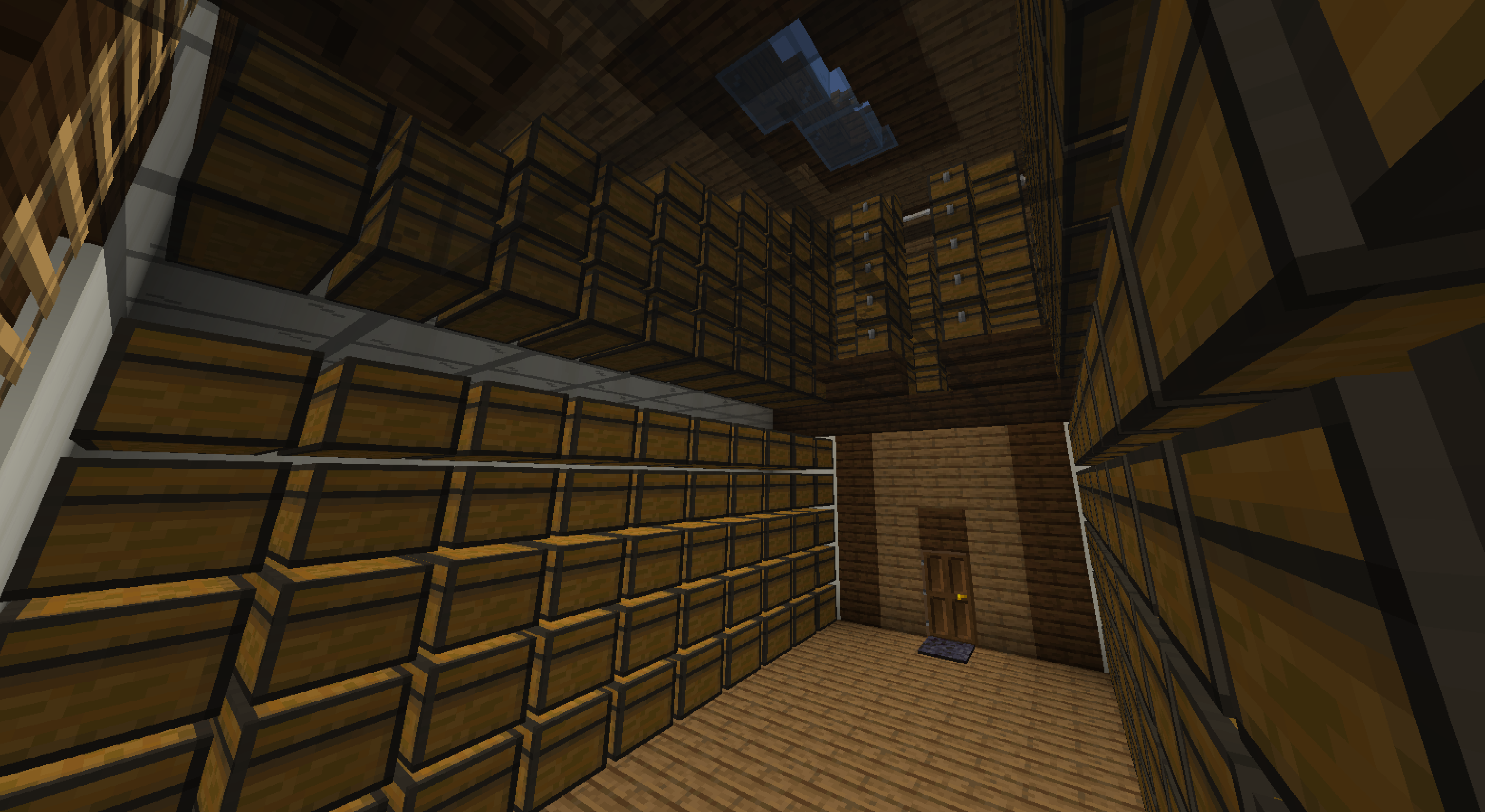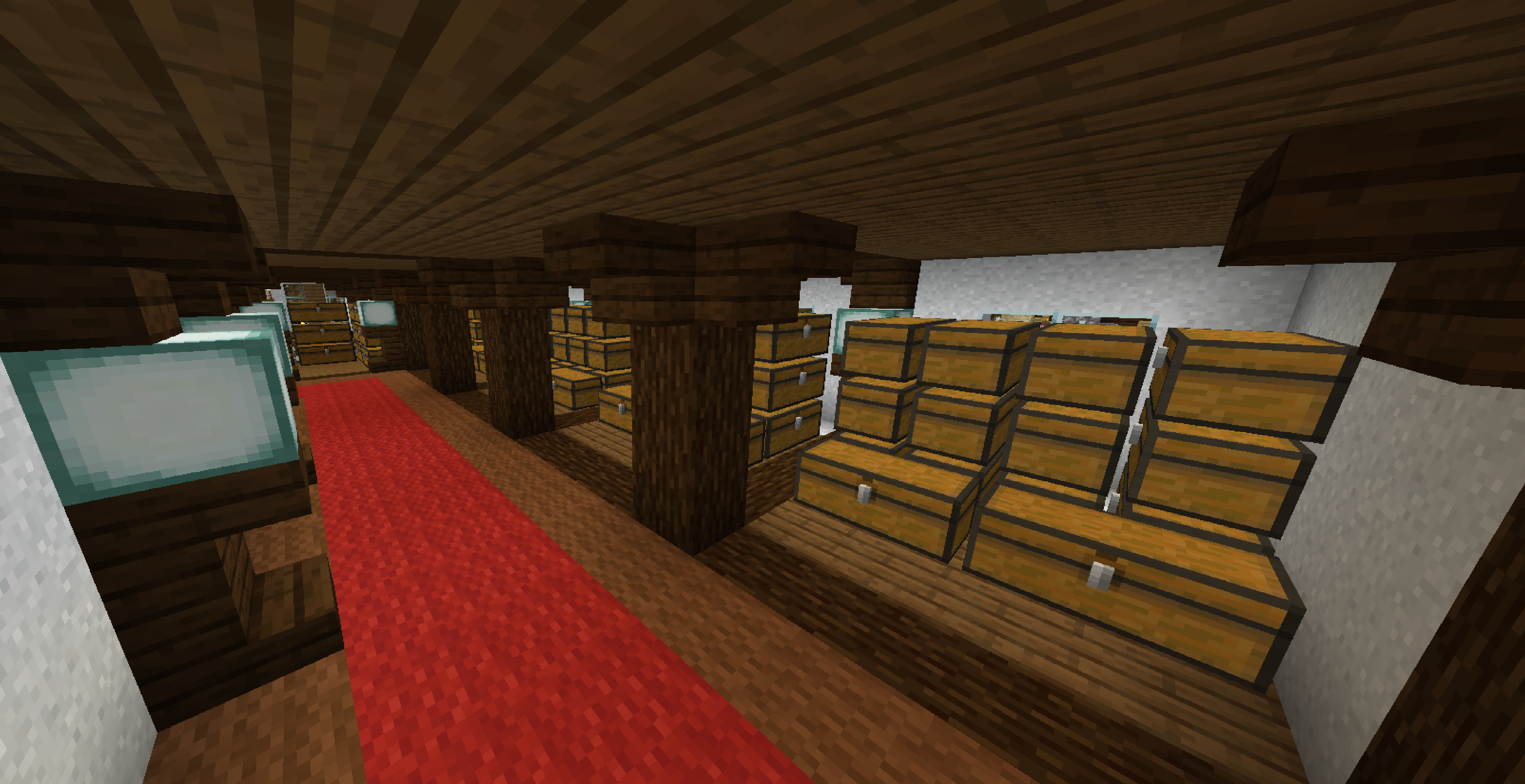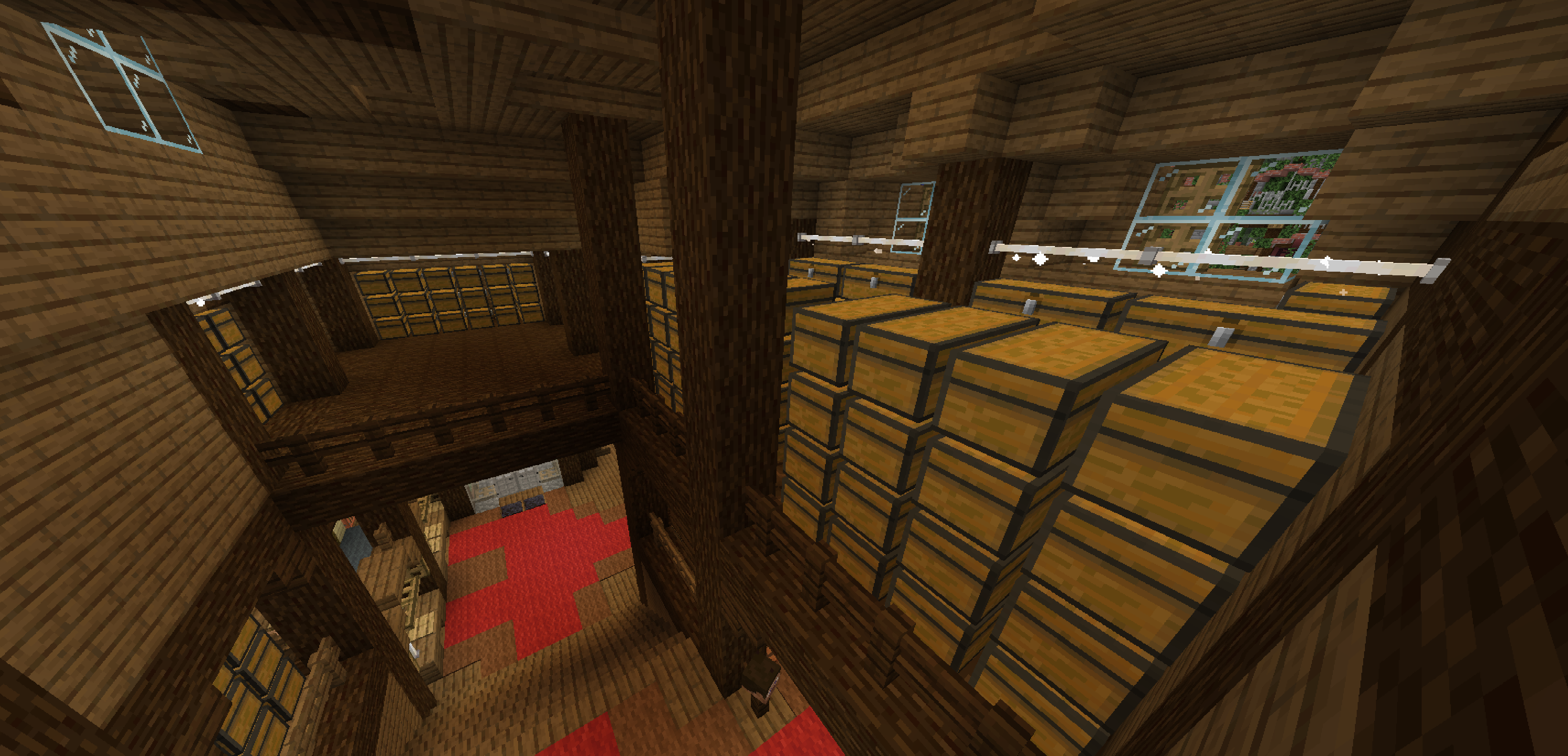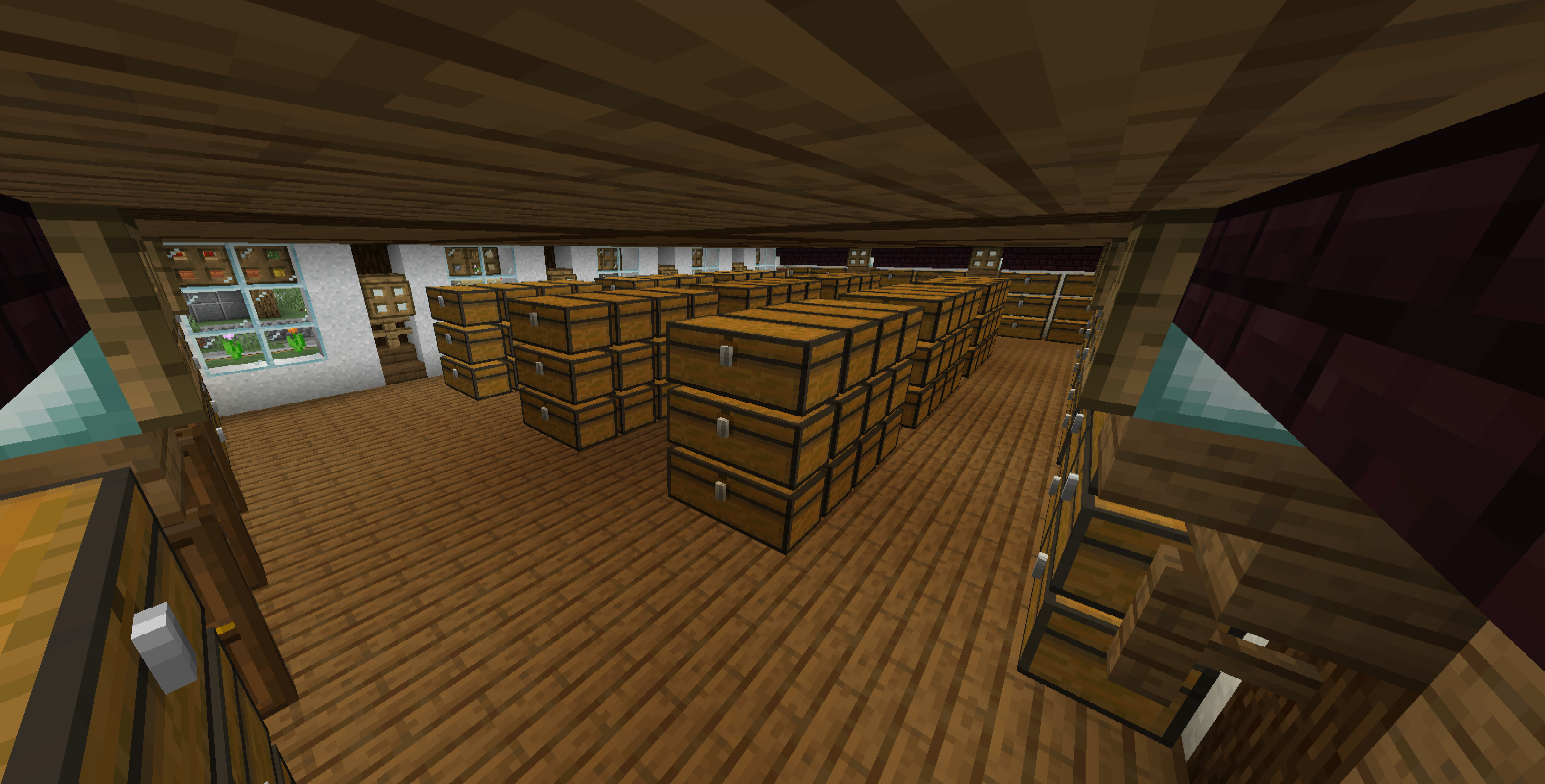 Наконец-то мы выделили место под склад. Никаких разбросанных сундуков по всему городу. Всё в одном месте. Склад получился достаточно вместительным. Распихали все свои сундуки, пока они не кончились) Но мест ещё полно, куда можно поставить новые сундуки!