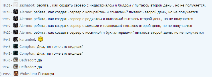 18:38 - sashabot: ребята , как создать сервер с индастриалом и билдом ? пытаюсь второй день , но не получается. 19:18 - Alermo: ребята, как создать сервер с копирайтом и ссылками? пытаюсь второй день, но не получается 19:19 - Alermo: ребята, как создать сервер с редхатом и шлюзами? пытаюсь второй день, но не получается 19:19 - Alermo: ребята, как создать сервер с мемами и плашками? пытаюсь второй день, но не получается 19:20 - Alermo: ребята, как создать сервер с косынкой и бухгалтершами? пытаюсь второй день, но не получается 19:42 - karambol: :eek: 19:45 - Compton: Дим, ты тоже это видишь? Вот так порой достают модераторов однообразные вопросы