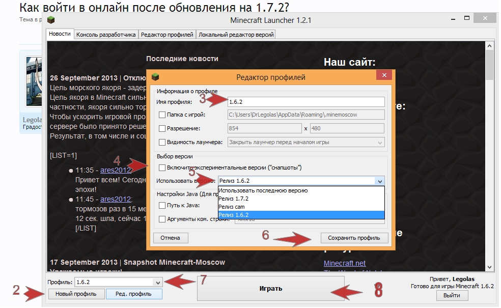 Сейчас у многих начался обновляться клиент. Внимание! Это не переход сервера на новую версию, игра продолжается на версии 1.6.2! После обновления клиента на версию 1.7 нельзя войти на сервера. Как же вернуться в онлайн? Все не так сложно: Запустите лаунчер Нажмите кнопку в левом нижнем углу: Новый профиль Введите имя профиля: 1.6.2 Опускайте глаза ниже и ищите строчку: Выбор версии В выпадающем списке выберите версию: Релиз 1.6.2 Нажмите: Сохранить профиль Теперь взгляните опять в левый нижний угол. В поле "Профиль" выберите созданный вами профиль: 1.6.2 Играйте! Спойлер: Все выше одной картинкой