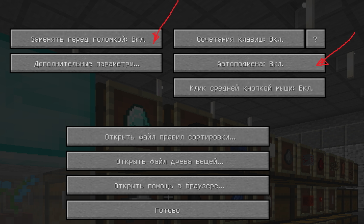 Иногда случается очень неприятная вещь ! В пылу игры совсем забываешь следить за прочностью инструмента . А если инструмент ещё и с починкой то это вдвойне печально ! Так вот мод .. Inventory-Tweaks-Mod-1.12.2.jar .. поможет Вам не профукать Ваш инструмент Нужно просто скачать этот мод . Установить в папку /mods ну и настроить если нужно . Итак мы в игре после установки мода . нажимаем кнопку инвентарь и видим некоторые изменения Нажав на кнопочку ..Параметры инвентаря входим в меню Вот эти менюшки и отвечают за Автозамену . Даже если у Вас нету второго экземпляра инструмента на что заменить - не беда . Мод просто про достижении критической прочности инструмента уберёт из ваших рук инструмент и положит его в инвентарь ( в инвентаре должен быть хотя бы один пустой слот ). Если уж хотите его окончательно сломать то просто возьмите почти убитый инструмент из инвентаря и добейте его до поломки )