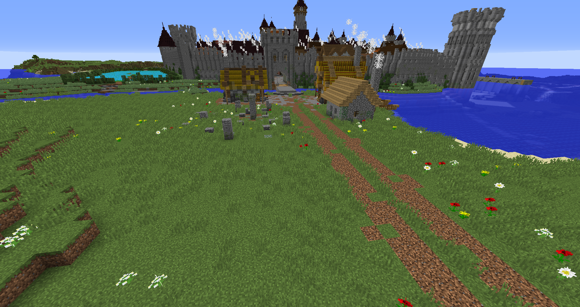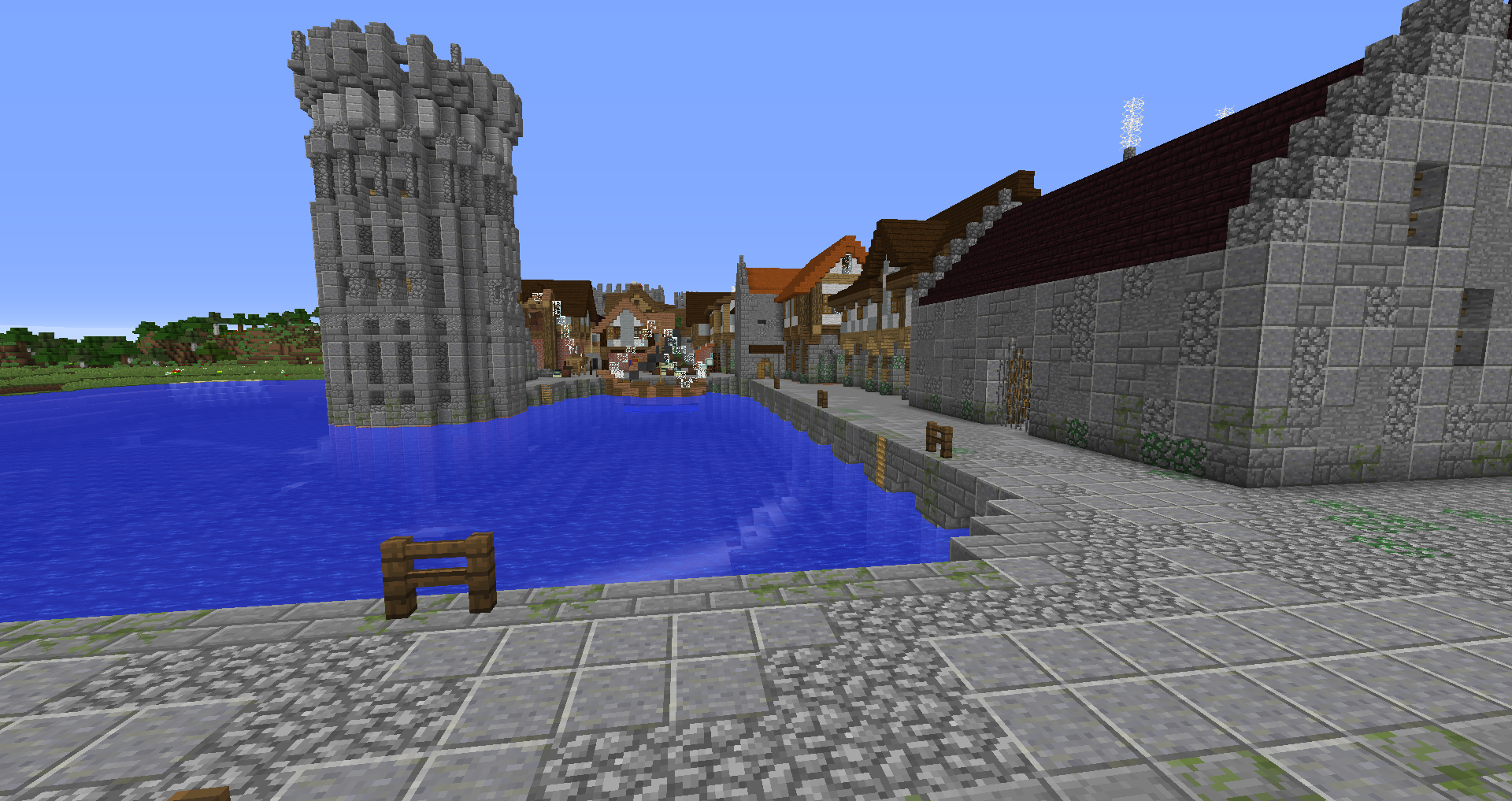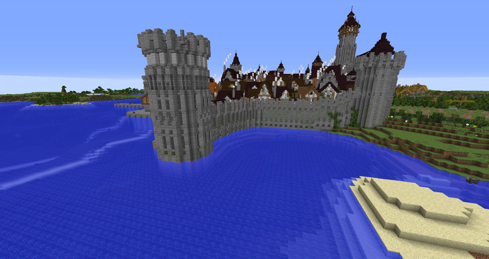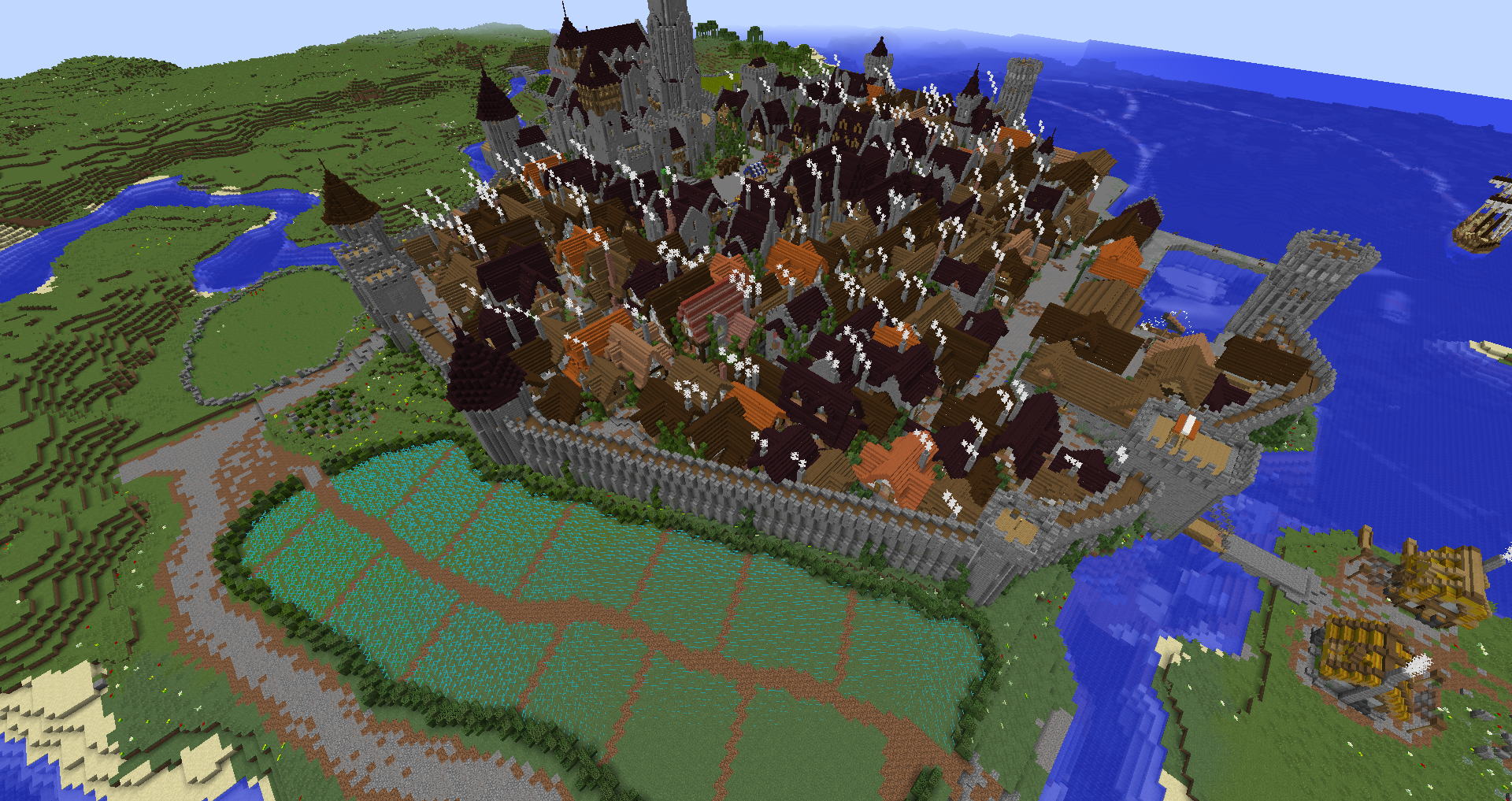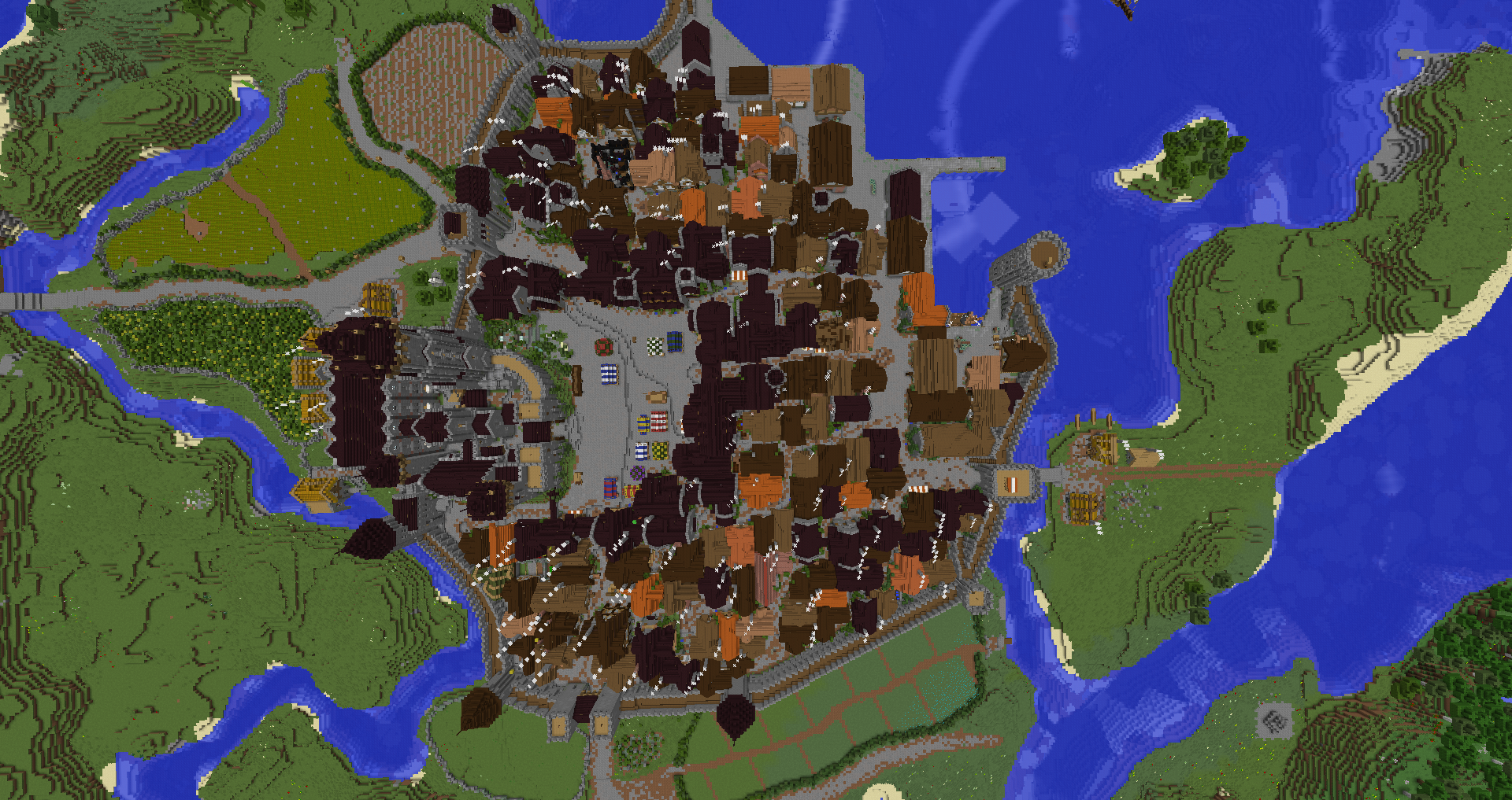 Город спавна который будет на новой карте. Вид с карты. Непосредственно точка спавна (обозначена табличкой), так же видны торговые палатки. Тоже самое, но видны ворота в цитадель (замок) и пустующая доска объявлений Игроков нет, по этому на спавне тусуются зайцы и овцы Будущие порталы, пока только рамки. Улочки московские... Порт. Сгоревший дом. Вид извне. Не знаю что автор (угадайте кто ) хотел этим показать, но да, это горка черепов А это видимо кладбище. С высоты птичьего полета на виверне. *Ландшафт не окончательный! К окончательной версии изменится как линия берега с руслами речек, так и линия горизонта. Данная серия скриншотов сделана на условном ландшафте который в теории может быть, только и исключительно для самих скриншотов, чтобы они смотрелись гармонично. upd: совсем забыл сказать. Все дома рассчитаны так, что они не перекрывают друг друга и в последствии будут распродаваться всем желающим.
