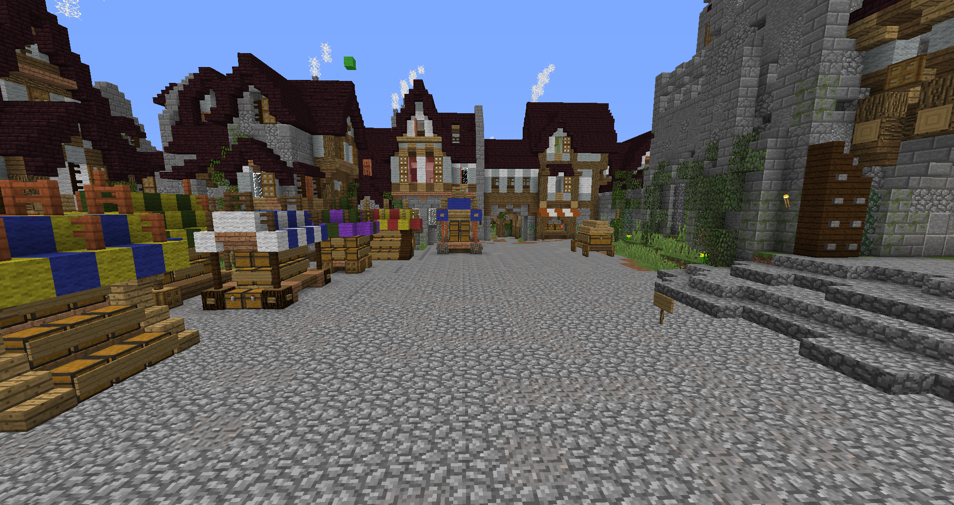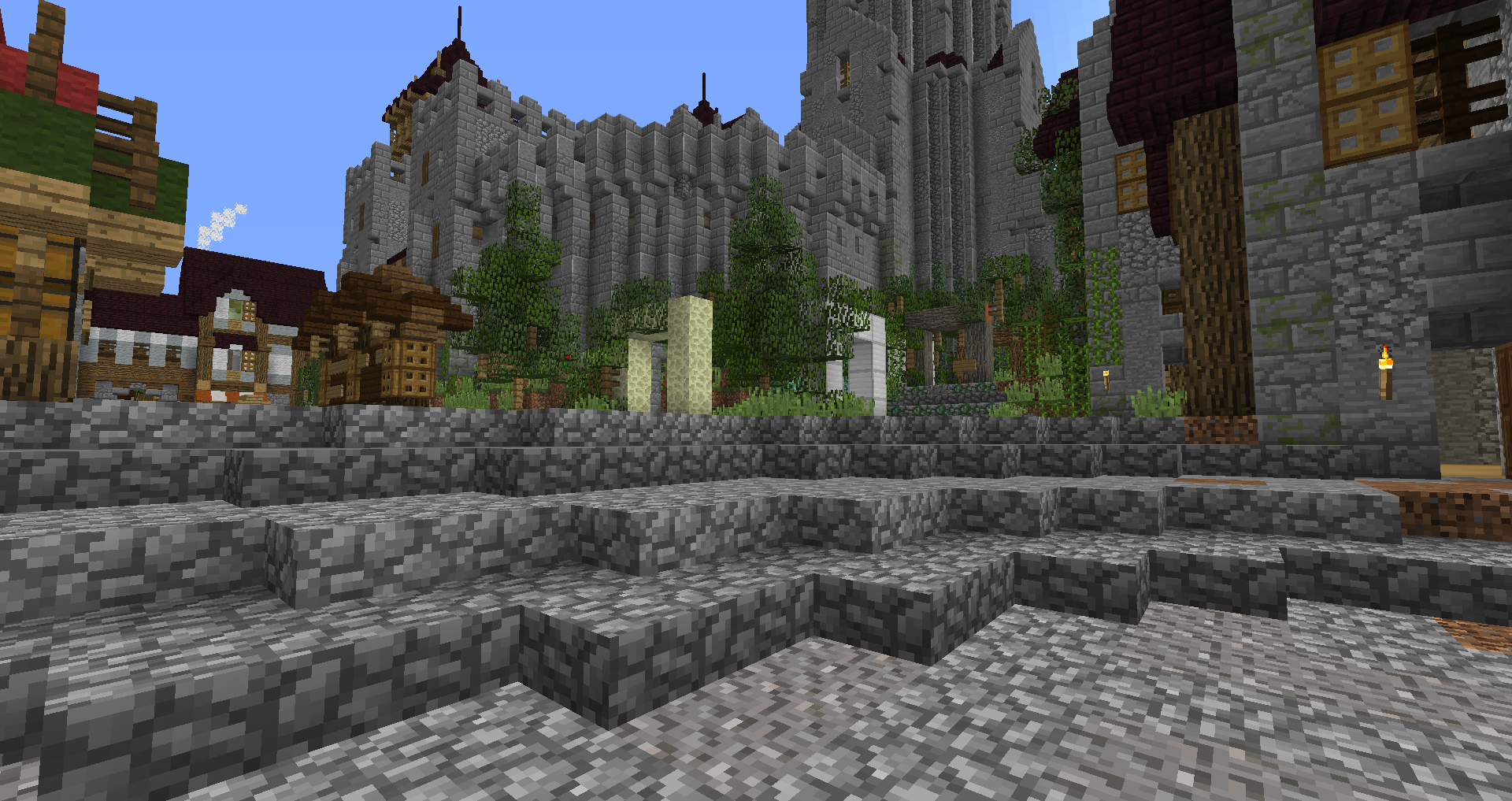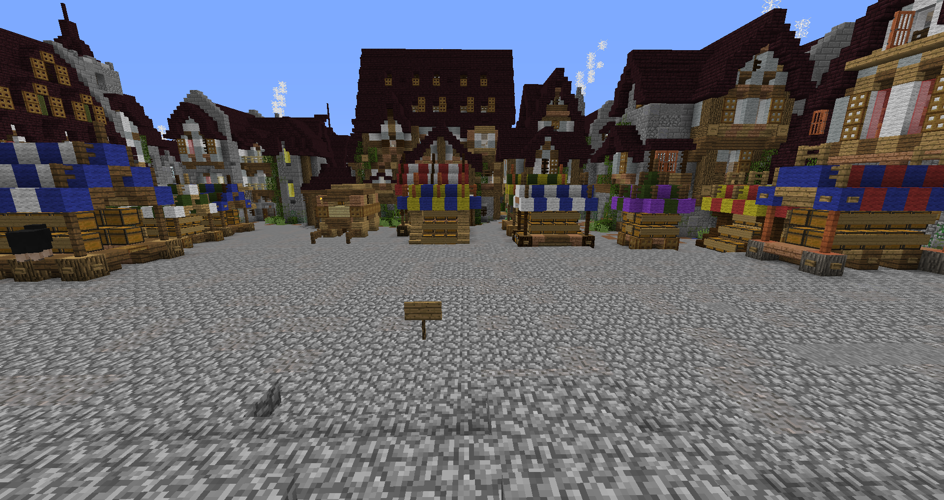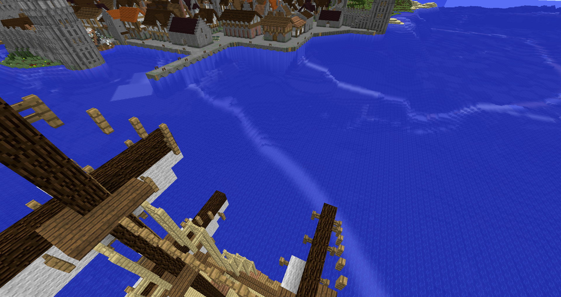 Город спавна который будет на новой карте. Вид с карты. Непосредственно точка спавна (обозначена табличкой), так же видны торговые палатки. Тоже самое, но видны ворота в цитадель (замок) и пустующая доска объявлений Игроков нет, по этому на спавне тусуются зайцы и овцы Будущие порталы, пока только рамки. Улочки московские... Порт. Сгоревший дом. Вид извне. Не знаю что автор (угадайте кто ) хотел этим показать, но да, это горка черепов А это видимо кладбище. С высоты птичьего полета на виверне. *Ландшафт не окончательный! К окончательной версии изменится как линия берега с руслами речек, так и линия горизонта. Данная серия скриншотов сделана на условном ландшафте который в теории может быть, только и исключительно для самих скриншотов, чтобы они смотрелись гармонично. upd: совсем забыл сказать. Все дома рассчитаны так, что они не перекрывают друг друга и в последствии будут распродаваться всем желающим.