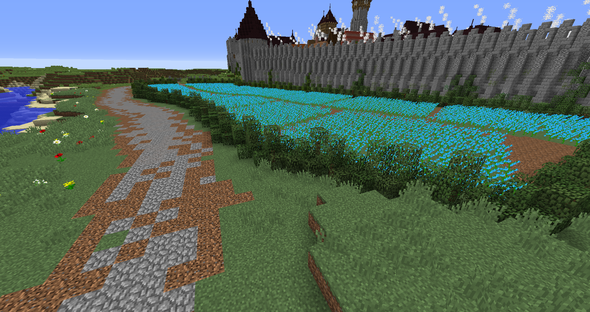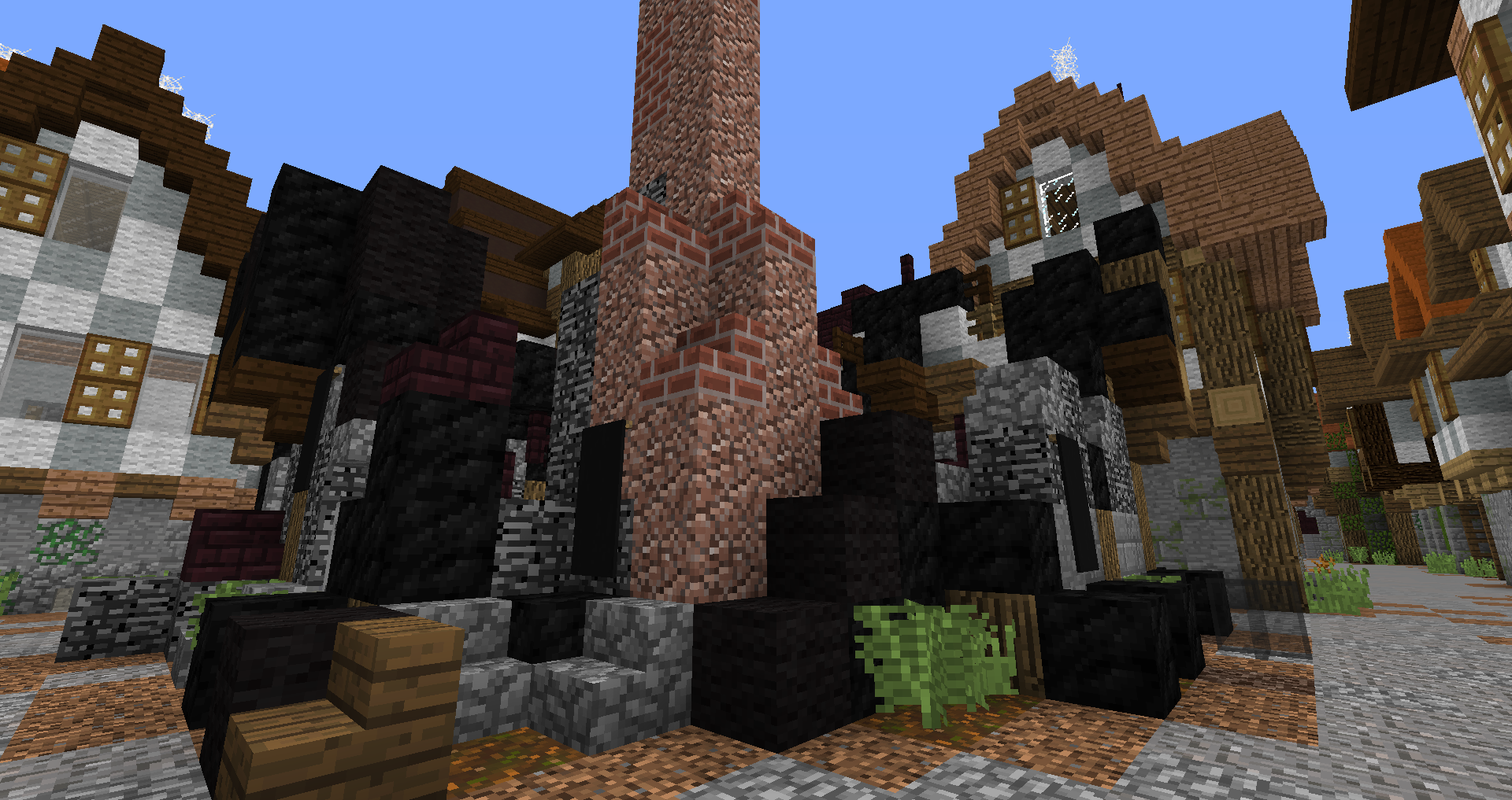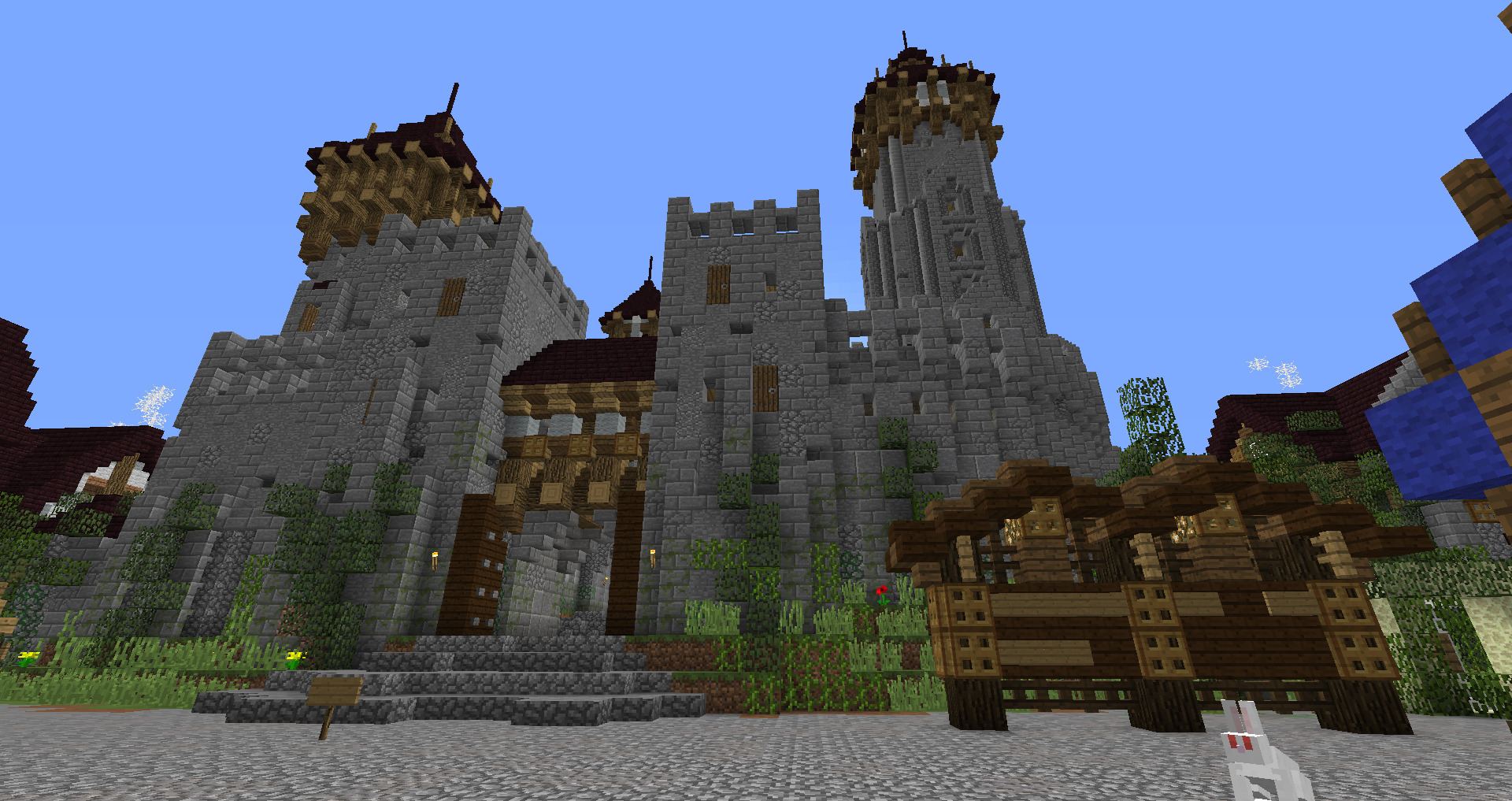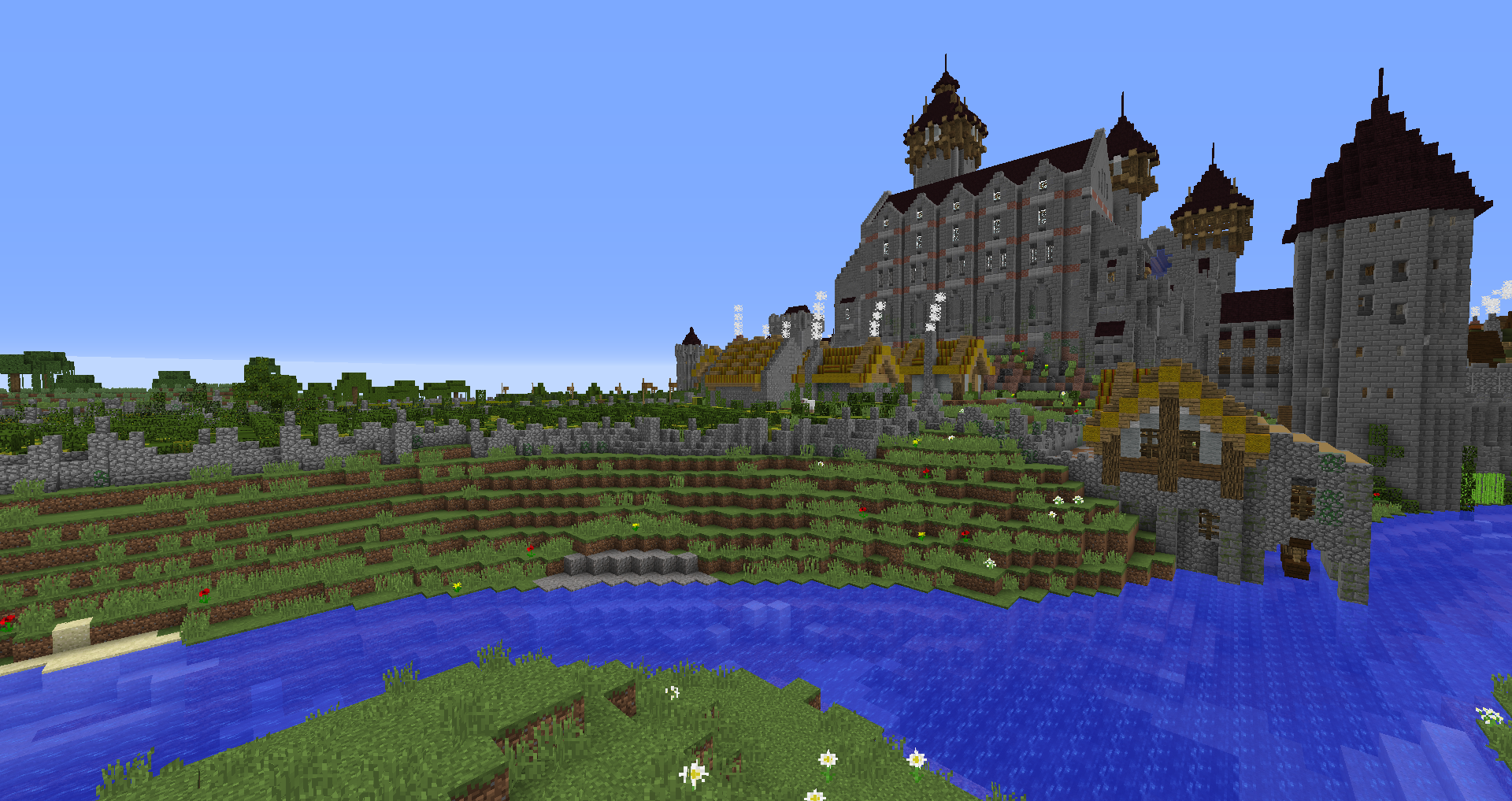 Город спавна который будет на новой карте. Вид с карты. Непосредственно точка спавна (обозначена табличкой), так же видны торговые палатки. Тоже самое, но видны ворота в цитадель (замок) и пустующая доска объявлений Игроков нет, по этому на спавне тусуются зайцы и овцы Будущие порталы, пока только рамки. Улочки московские... Порт. Сгоревший дом. Вид извне. Не знаю что автор (угадайте кто ) хотел этим показать, но да, это горка черепов А это видимо кладбище. С высоты птичьего полета на виверне. *Ландшафт не окончательный! К окончательной версии изменится как линия берега с руслами речек, так и линия горизонта. Данная серия скриншотов сделана на условном ландшафте который в теории может быть, только и исключительно для самих скриншотов, чтобы они смотрелись гармонично. upd: совсем забыл сказать. Все дома рассчитаны так, что они не перекрывают друг друга и в последствии будут распродаваться всем желающим.