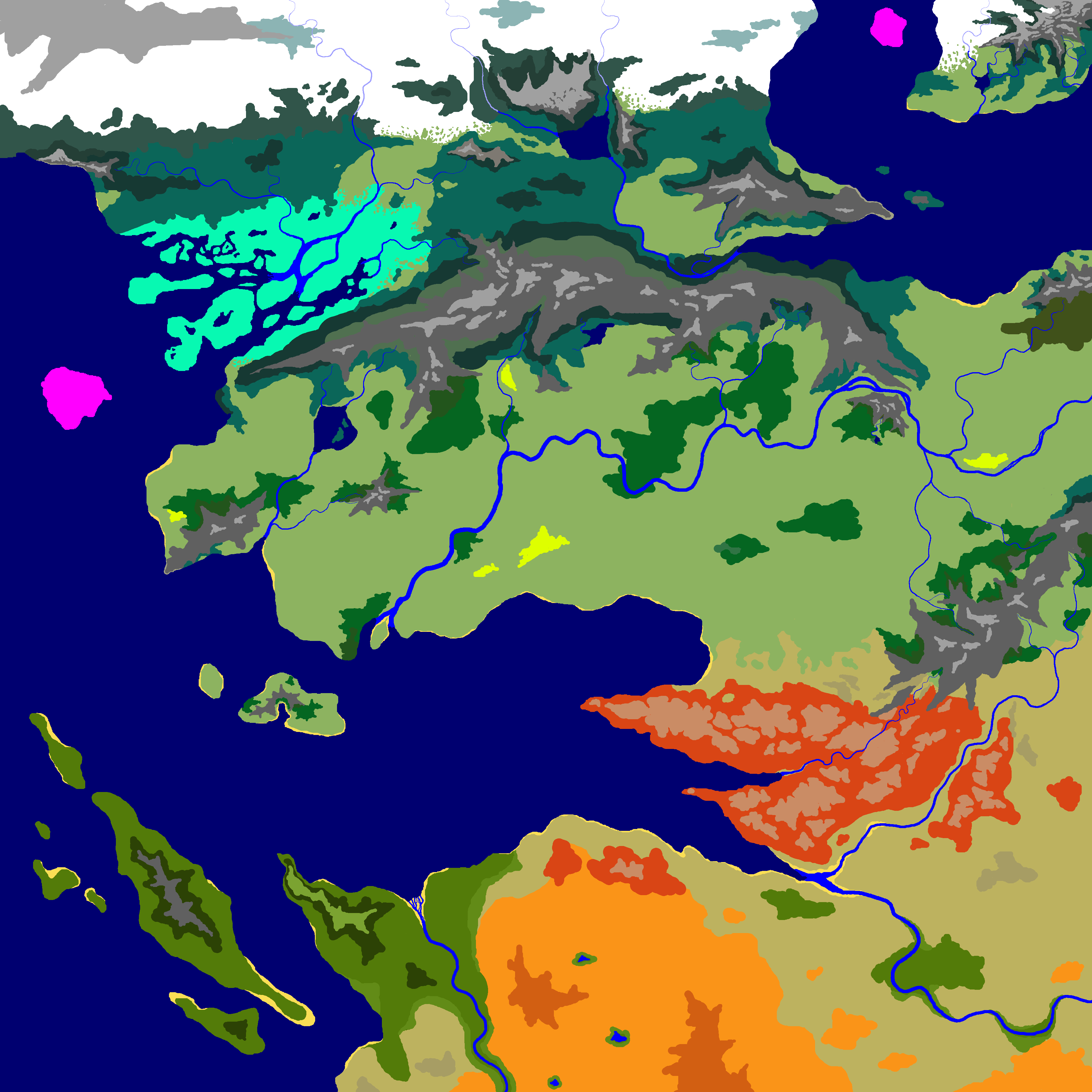 Я в пеинте пока-что это набросал, от руки. Ну это не Европа, но просто "генерик" фентезийный мир, где "все включено" на сравнительно небольшой площади. Я за свою бытность в ролевых кругах нарисовал десятки таких карт и от руки и всякими другими средствами. Но если какие-то области не нравятся, можешь +/- менять. Там проливы делать, острова и т. д.