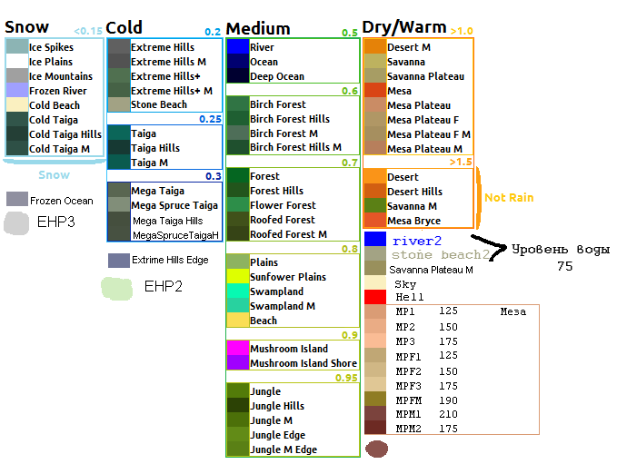 Тут давайте всё же моё мнение учитывать 21х21 это самый оптимальный размер в моей голове, который я уже обсуждал с le_souriceau и конечно ему не хочется такой большой мир, но тут я всё же оставлю право голоса за собой, в виду тех причин которые я ему озвучивал и просто не хочу озвучивать сюда. Картинка карты во вложении, размер 1к4 (1 пиксель 4 куба). За одно, на всякий случай, вдруг пригодится, техническая карта цветов.