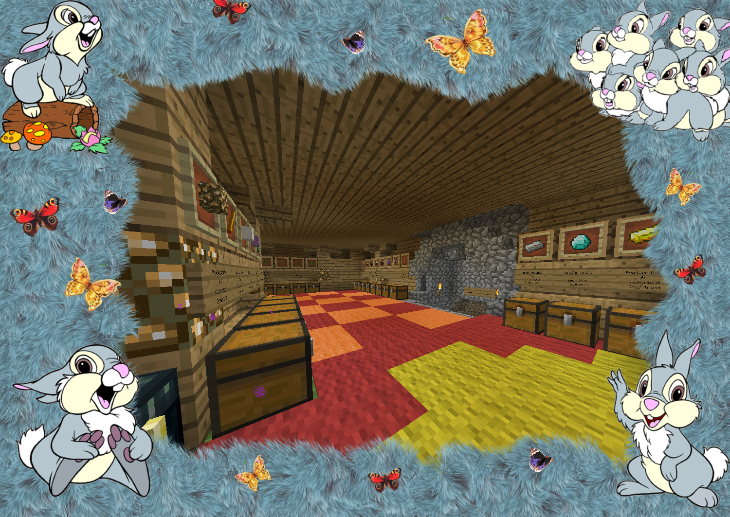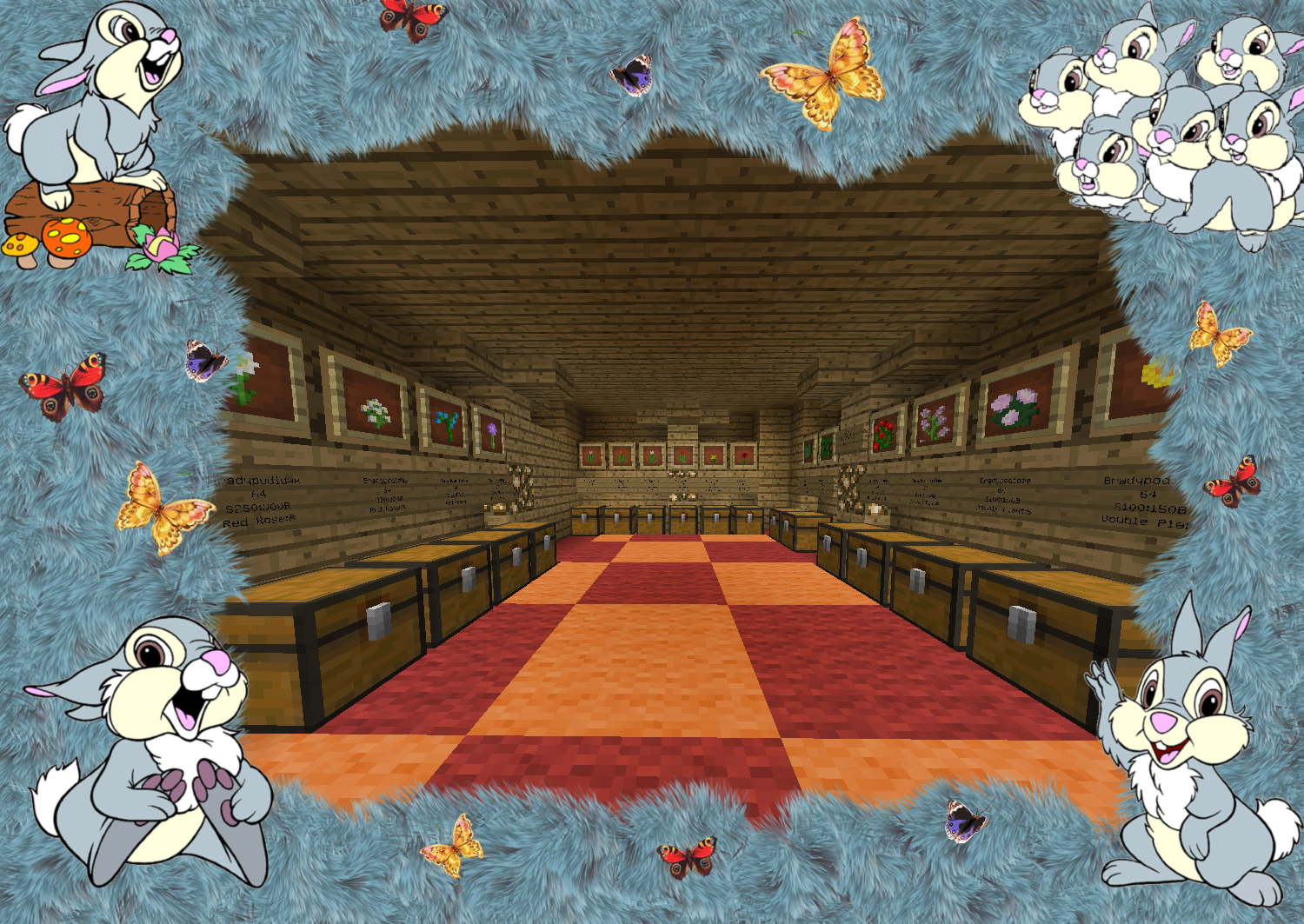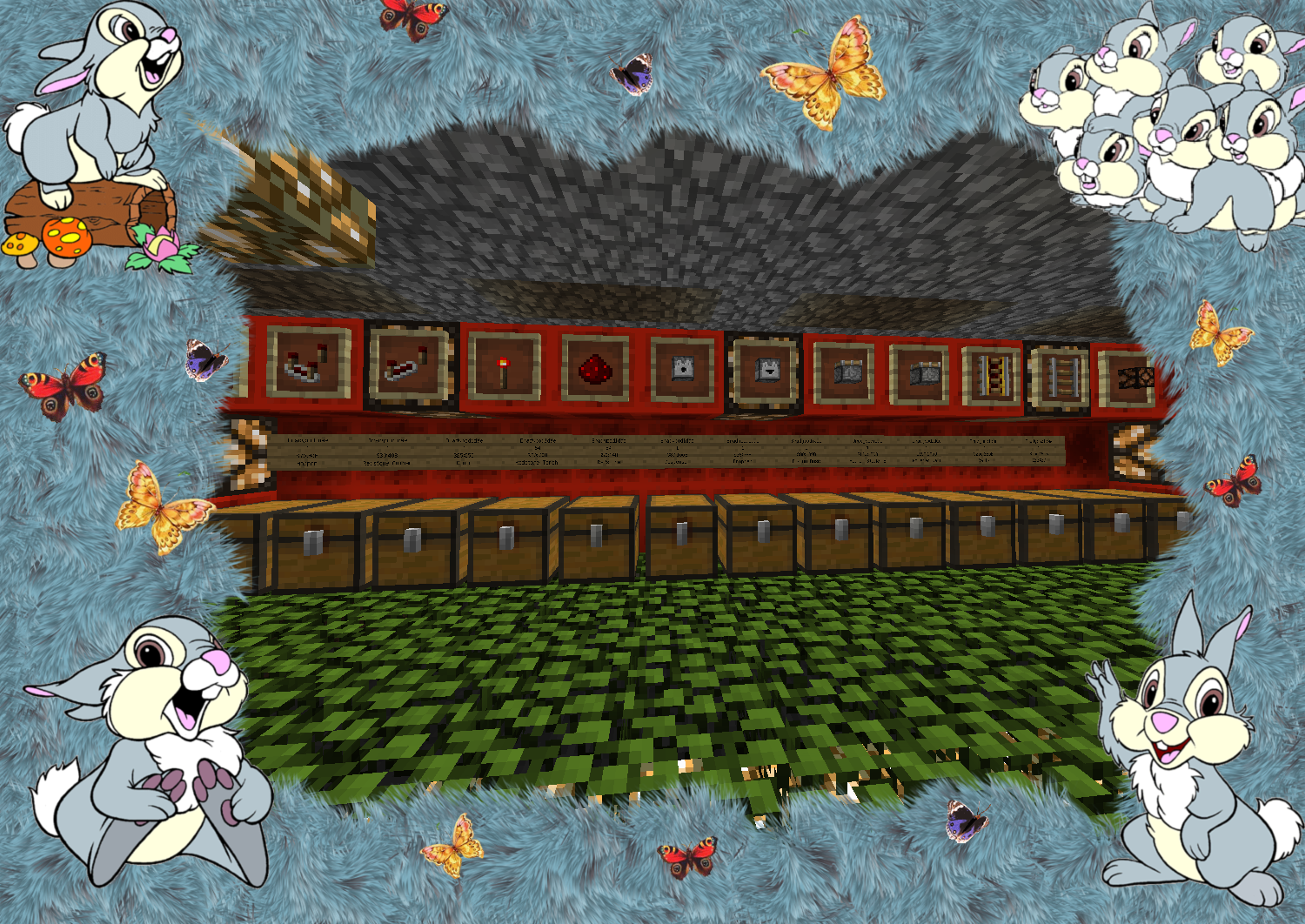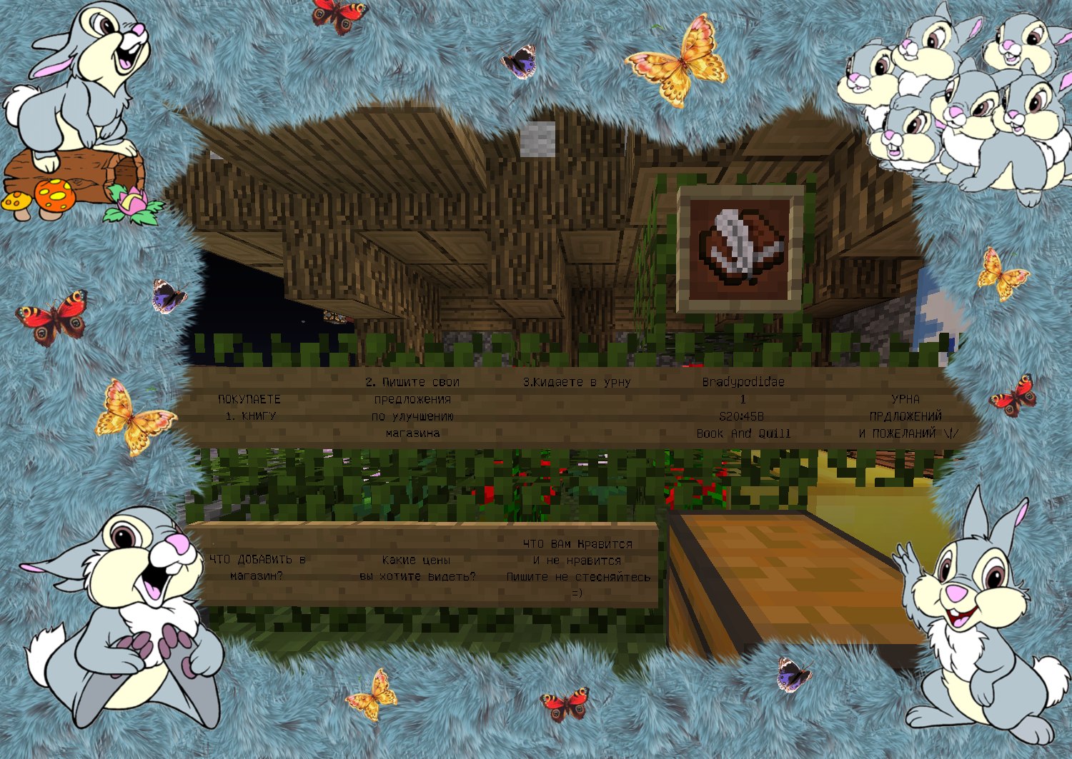 Уютный магазин с товарами по приемлемым ценам! Адрес: /warp shop улица.Синяя Большой ассортимент драгоценных ресурсов Все виды цветов и растений представлены в нашем магазине! В отделе текстиля находится огромный выбор шерсти всех цветов. Для любителей механизмов есть огромный выбор предметов из редстоуна. Хотите помочь в развитие магазина? Есть идеи и предложения? Пишите и кидайте свои книги в урну предложений! МАГАЗИН ЗАЙЧИК Мы всегда рады вам! Наш адрес: /shop улица Синяя.