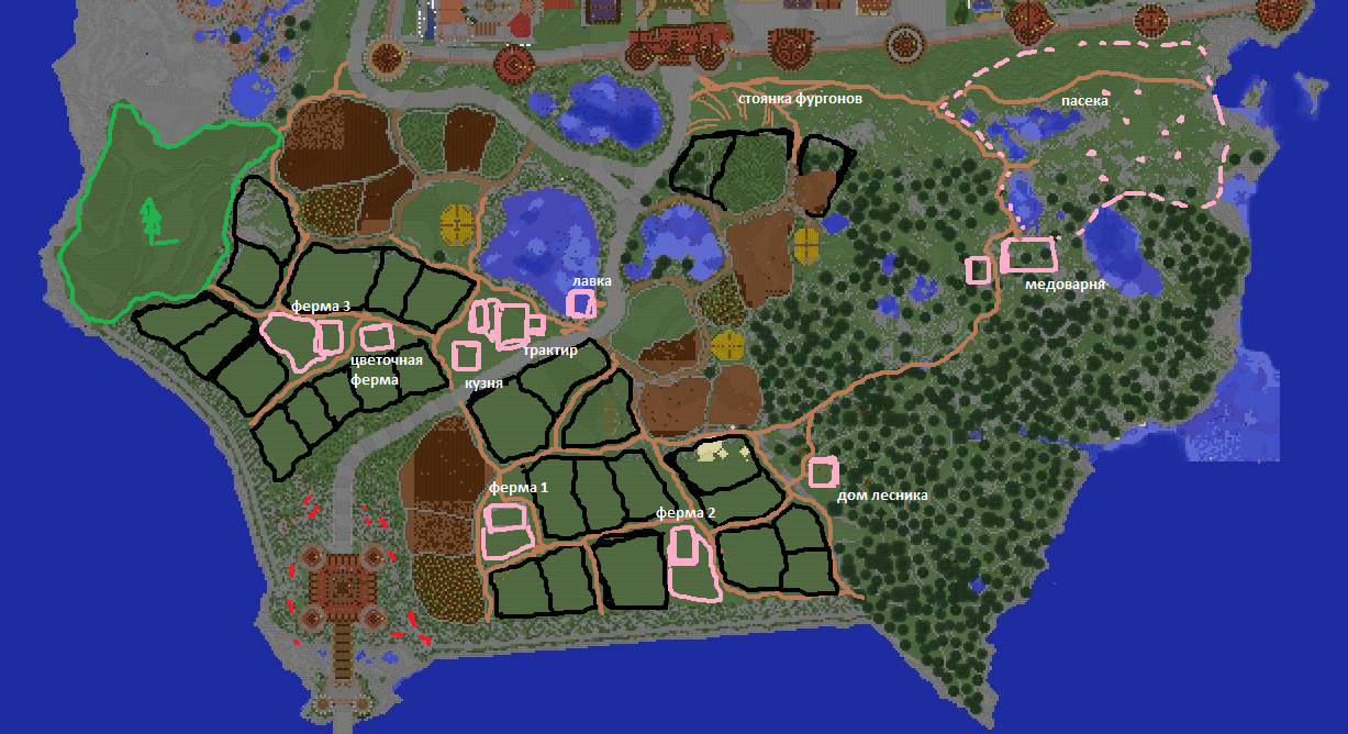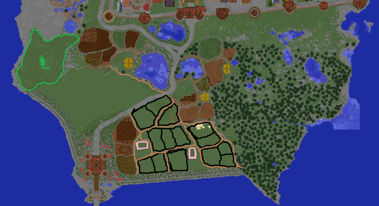 Так, ребята, вот расширенный план освоения окрестностей. В креативном сейве есть 2 фермы готовые из 3 (построить можно в любом порядке (где фермы 1-2-3), остальные постройки как-то буду постепенно поступать. Дороги-поля, в целом, уже можно разметить/построить и, если все сходится, засевать.