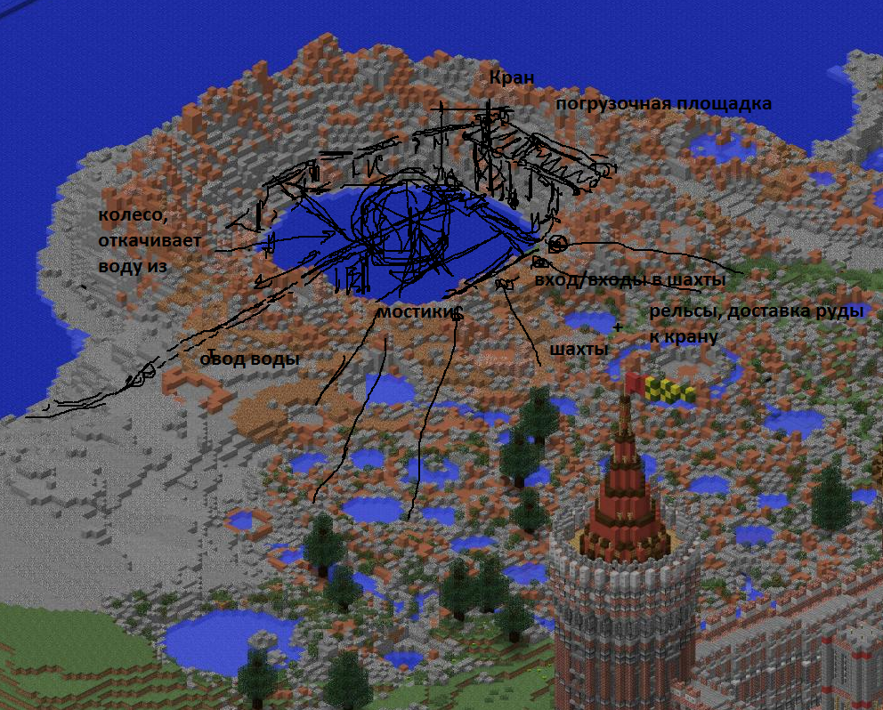Так, по делам. --- Ира там уже очень славно продвинулась с полями в предместьях, но если на кого нападает трудолюбие и желание покопаться на грядках, высаживать -- можете к ней обращаться за трудоустройством. --- Gallen почти сделал оформление внутри мостового замка, можете там зайти. Потусить, покритиковать его, мешать делать : ) Шучу. --- angvar, для тебя отдельное задание, если будет время-желание. Можешь кого-то в помощь взять, если это не приведет к безумному результату. Шахта в кратере. Я тут набросал примерную идею, но нужен кто-то на исполнение, так как у самого меня с новым замком и прочими критическими вещами в самом городе, руки дойдут примерно никогда. Т.е. подразумевается оформить все деревянными мостиками-переходами, сделать на нижнем уровне входы в шахты, с выведенными рельсами до крана. Там какую-то погрузочную площадку. Есть логика посвятить шахту просто железной руде, учитывая окружение это будет актуально. Но можно изумруды или что-то более экзотичное, можно подумать. Колесо для откачки воды, с выводом через пробитый туннель в сторону от кратера. Но если еще какое-то оборудование/решения придут в голову в разумных масштабах к пространству -- вэлком. Очень примерно можно вдохновиться по одной из локаций в ведьмаке, там что-то вроде шахты-карьера, переделанной в разбойничий лагерь. Но, понятно, что у нас без укреплений и масштаб куда меньше. Речь об общем принципе-ощущение что ли. В теории за краном можно втиснуть пару зданий небольших, типо склада и управления, но это тоже надо отдельно как-то. И можно добавить потом. Главное сейчас промышленную, сказать, часть. --- Новый замок -- подвигаюсь -- медленно. Нудная часть планировки непростых частей.