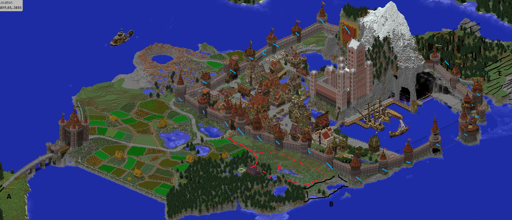 Пока я тут слегка в ауте, чем можно заняться (помимо ваших подземных приключений). А - довести немного дорогу от моста в глубь континента, в пределах хотя бы резервных приватов. B - тут хорошо бы бы вдоль берега немного поднять уровень, хотя бы до 5-6 (потому что это наша последняя дыра в плане низкого уровня моря). Минимальная доля художественности приветствуется. C - башни остаются непочатым краем работы, если их пообставлять, поукрашать, где-то поосвещать может даже. D - немного сократите там плаху, выведите дорогу (достаточно грунтовой, как между фермами), к медоварне. Конкретный маршрут за вами, по местности. Еще можно привести в порядок там цветочную поляну, может быть как-то красиво огородить ее деревянным забором (посложнее, в стиле как бывший зоопарк/свадебное место, но можно более легкий) E - здесь можно озеленить берега, где они еще облезлые, засадить деревья, приведя к более густому лесу. Ира, понятно, за главную на поле, но, надеюсь она не будет делать все сама, а как-то распределит между добровольцами, героями, переполненными энергией : ) Хотя, наверное, можно и за плату, если сердца в наши дни поросли мхом корысти. Отдельным пунктом все еще наш вечный вопрос гейзеров, но я уже наверное несколько месяце не могу никого на них заманить.