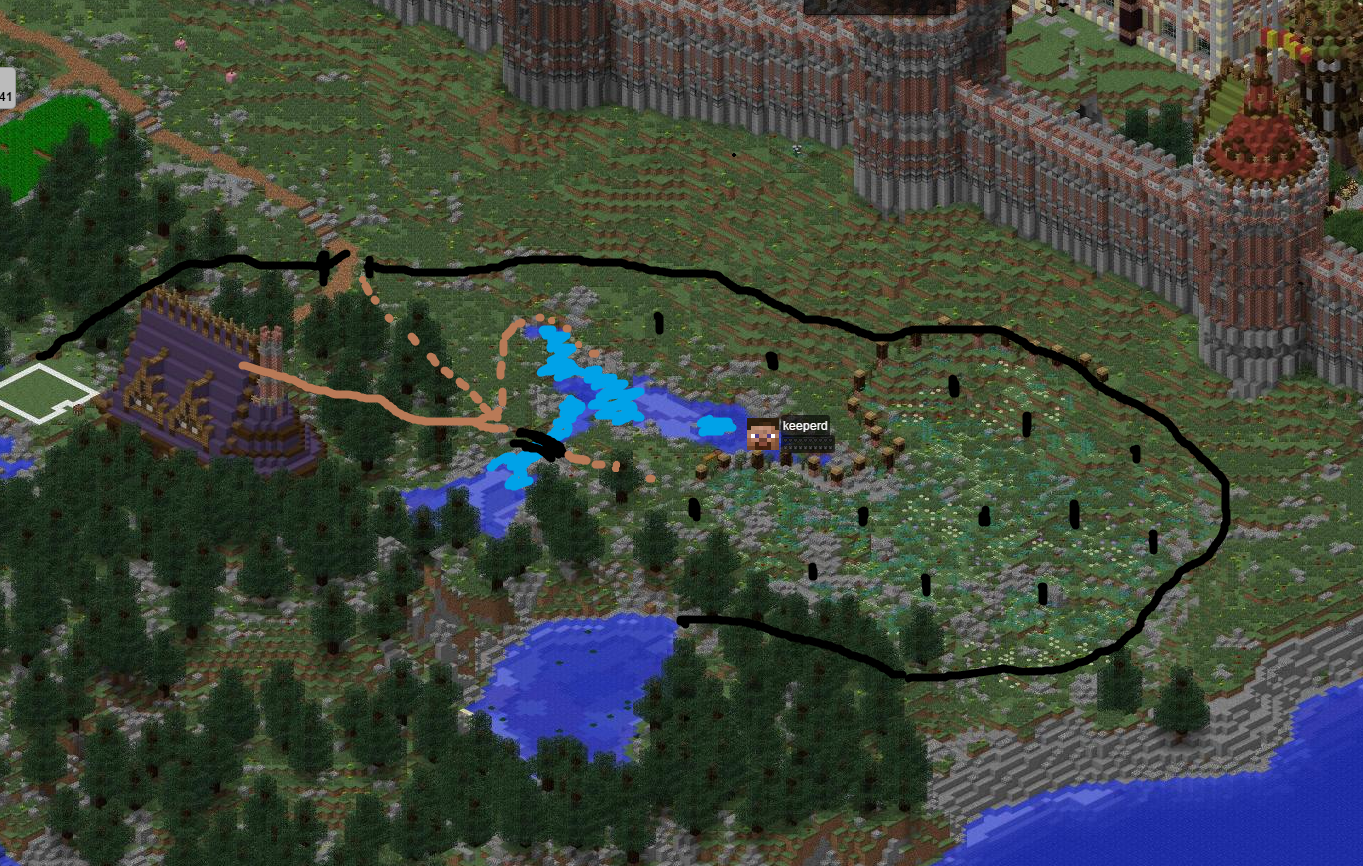 Тро, вот вариант с двумя ножками то что надо, отличная идея. Так видимо и пустим в дело, спасибо. Я еще вижу, что начали делать забор. Пока не сделали много -- не туда завернули. Берите намного шире, потому что там все равно ничего кроме этой медоварни не втиснуть и пустыри будут некрасиво по композиции. Примерно так. ПРИМЕРНО, понятно, что надо по ландшафту делать, но если не надо -- не стесняйтесь где скопать/насыпать, это нормально. Т.е. 1) забор шире; 2) там где микро-озера, можно их чуть подкопать и сделать более прудообразными, убрать чуть чуть каменистость, небольшой мостик (деревянный, узкий); может придать пруду какую-то форму поприятнее/ 3) насадить цветов еще каких найдем, у нас вроде бы был запас в замке, но Ира сможет сказать точнее в плане знания складов; 4) где логично -- следать вроде тропинок; 5) часть деревьев можно срубить перед основным зданием -- не беда; По самому забору -- неплохо, но я бы отказался от кирпичных оснований (они слегка неуместно в таком "сельском" стиле) + сделал все же более насыщенной середину между столбиками, потому как сейчас слегка жидковато, этой палочки + блока травы маловато в таком масштабе. P.S. Прудик и мостик и дорожки за Ирой, с такими вещами нужна нежная рука : )