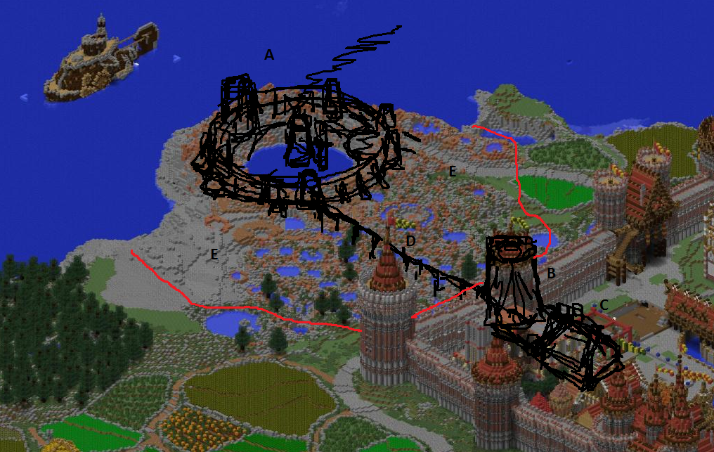 Большая важная тема про развитие и стройки. Тема гномов/дворфов традиционно популярна среди игроков майн. И постоянно у кого-то из горожан нынешних или потенциальных случаются приступы острой подземнофилии : ) Они углубляются под землю, в одержимости алчут перекопать все под городом, не останавливаются даже перед нарушением закона! и если бы я их не останавливал, наш город давно бы провалился под землю от их шалостей ниже уровне мостовой. Меж тем у нас есть старый "дворфийский квартал" девелопмент которого, в силу разных и сложных причин (тут я могу исписать несколько страниц), зашел в прискорбный тупик. И из-за этого "пар" из маленьких демонов с квадратными бородами и кирками вместо рук никак не выпускается. Есть еще третья проблемная точка - район гейзеров с большим кратером. Где никто не хочет работать, словно что-то зная о том секретном докладе о повышенном содержании оксида железа в воздухе... Мне кажется настало время положить этому конец, связать все 3 проблемы в одну и решить ее. Идея следующая. Построить в районе кратера что-то вроде дворфийского форта-шахты (А). Одну из городских башен стилизовать под гномскую (B) На месте старого гномского квартала сделать "Дворфийский рынок" - большое крытое здание, где будут лавки и склады, вроде такого подгорного ТЦ с фирменными товарами. (C) Это будет так сказать отображать их экономическую интеграцию с городом и миром. Все это связать железной дорогой (D) Все в +/- одном стиле. При этом выделить гномам под подземное баловство район гейзеров (Е). Хотя сам кратер слегка на воде, большая часть зоны стоит на твердой земле (там были натуальные холмы) и там есть куда покопать. Соотвественно, что мне нужны: Trololochan как формальный глава/владелец старого гномского квартала. angvar как самый копающий и подземный и неуемный житель по таким вопросам. + волонтеры ужасно трудиться в поте лица и не только : ) + полезные идеи и мысли/если у кого есть по теме и вопросам.