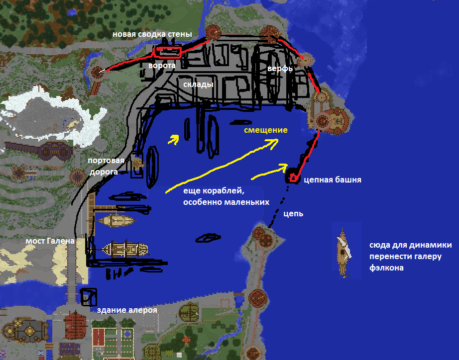 Там, где продлён текущий пирс, соответственно, ничего не будет, и третий большой корабль просто не к чему швартовать. Предлагаю вместо него под частью берега, поворачивающей к крану, сделать обычный заниженный до блока-двух причал для всяких посудин малого водоизмещения (то, что нарисовано под новым пирсом). Разгружающейся барже они точно не будут мешать. Второй пирс, вертикальный, пусть так и будет. Акваторию между Sea Falcon и южной набережной вообще лучше держать свободной от капитальных сооружений (водоплавающие сколько угодно) - чтобы было место для манёвра. Галера - да, согласен, пусть будет на внешнем рейде, либо вообще идущей своим курсом.