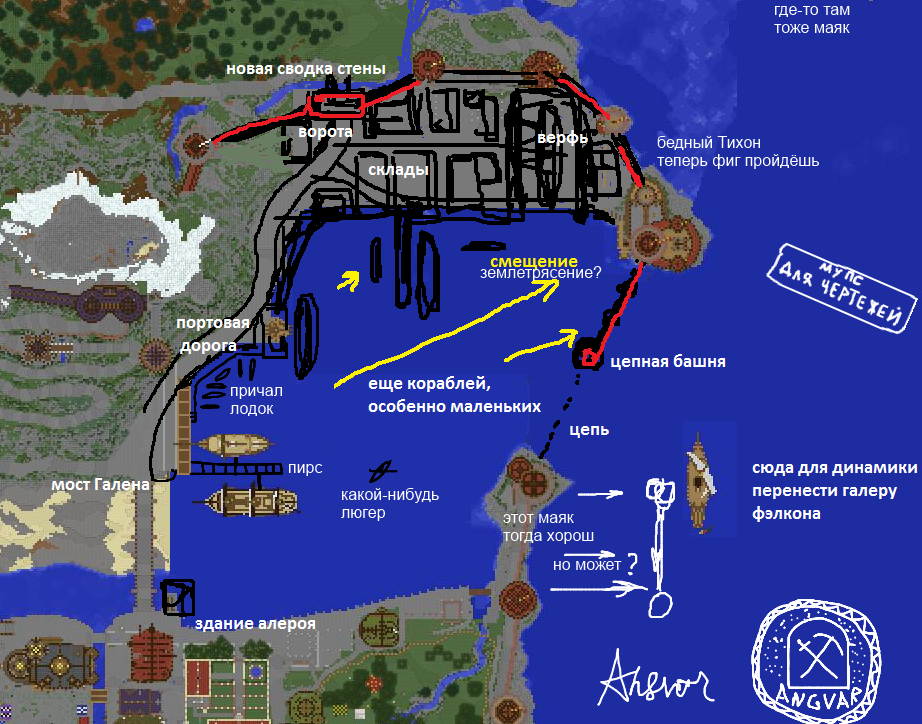 Верфь сухим доком планируешь? Так-то идея стоящая. Кусок с мостиком действительно странно смотрится на фоне остальных укреплений. Русалочья или как там ее башня за рифами в планах еще стоит?