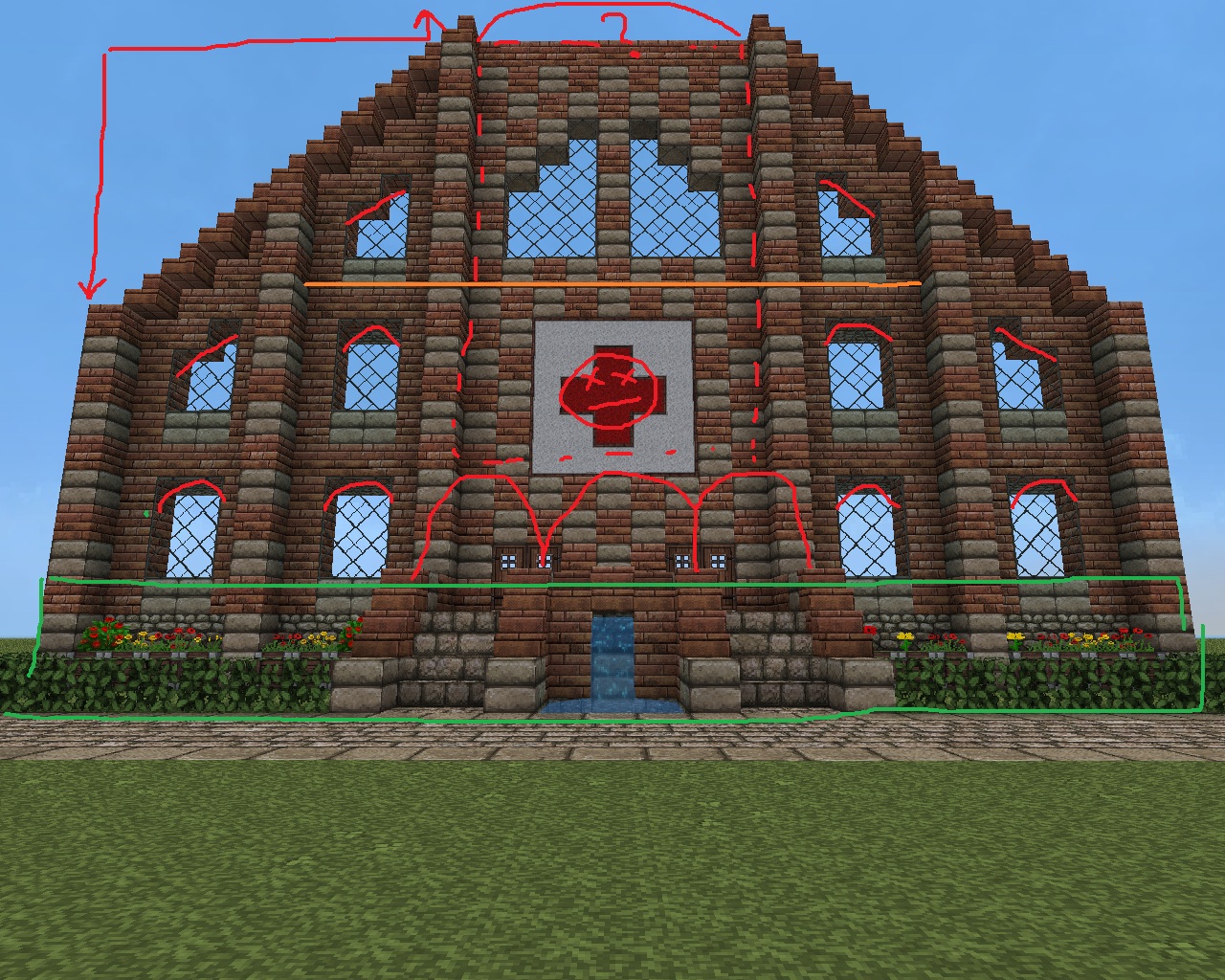 Ну начало неплохое, но для приготовления торта из этого коржа нам придется поработать : ) Низ - хорошо то что ждешь от больницы, вступая на ее порог. Особенно порадовал лечебный фонтан, для тех кто ползет внутрь и умирает от жажды : ) Проблемы дальше. С выбранным углом крыши некоторые проблемы по балансу (или пропорциям/или как это еще назвать). Если наверху то, что ты оставил под купол, то это очень мало. Сносный купол надо начинать намного ниже (оранжевая линия). Вся центральная часть (красный пунктир) страдает от черезмерной плоскости бытия. Красный крест забавен как пасхалка, но я еще морально не готов : ) Вместо него можно попробовать изобразить витраж. Окна все же стоит наверное округлить лесенками поверх, тем самым слегка углубив их. Сам фасад нужно хотя бы слегка разнообразить белой/серой шерстью, деревом, каким-то более экзотическими элементами. Еще можно - как-то развить тему крыльца/козырька, чтобы двери не торчали среди плоской стены. Поковыряй еще сам, если зайдешь в тупик - скинь сейв креатива, я набросаю прямо поверх.