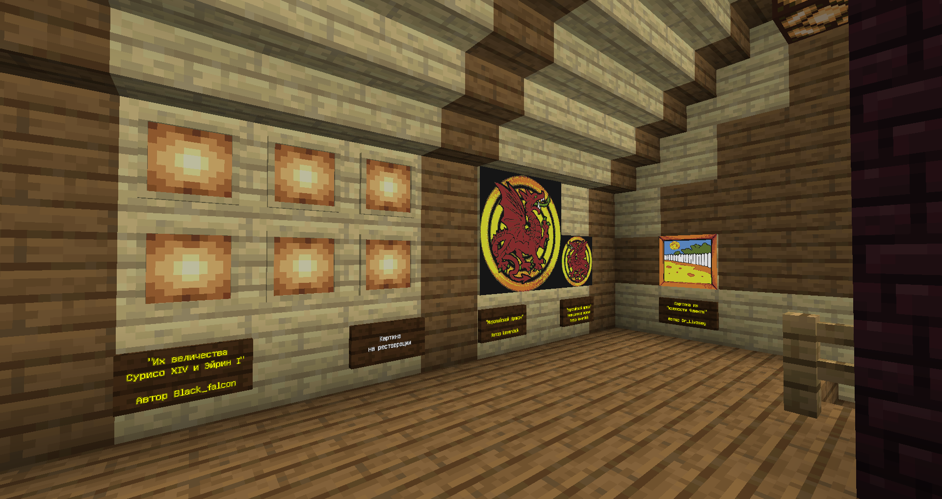 В городе добавилось два объекта культуры. 1. Выставка керамических ваз всех существующих рисунков. За черепки спасибо sergej888. 2. Выставка картин. Именно внутриигровых картин, а не пикселартов игроков. Представлены абсолютно все варианты, включая четыре секретных и добавленных моджанг зачем-то без возможности их получения обычным игрокам. Всё это находится в клановом доме, который так и не стал клановым домом. Путь: вдоль южной набережной гавани на восток, сначала мимо домиков с зелёными крышами, затем мимо дома с жёлтой крышей, затем повернуть в калитку и войти в здание, дальше всё будет понятно.