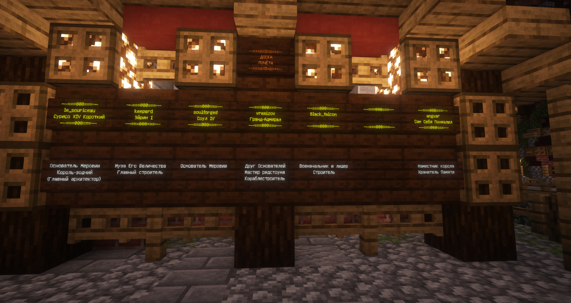 Себя я воткнул в конец потому что пришёл почти на готовенькое, что-то там доделываю зачастую на основе уже имеющихся образцов и переношу с версии на версию. Не такой-то уж и великий вклад. Но я подумаю, может перемещусь и правда. Ну и пустое место... я пока не знаю, кто там должен быть. Птиц же тут потому, что он реально был движущей силой на куче эвентов, а Меровия - это не только город, но и клан и люди. А так есть дофига кандидатов. Храмовник, строитель первых стен. Галлен, первый житель и организатор игровой жизни Меровии как поселения ещё в снегах. Трололочан, такой же массовик-затейник. Великий сслаа он же понятно, кто, помощь ресурсами делами и советами. Бонд, дофига всего строитель. Фрозен, сделал несколько очень масштабных и значимых дел вроде дна водоёмов и западных гор. Короче говоря, Фэлкона я выбрал как наиболее компромиссную фигуру из тех, кого лично знал. Я же говорил, выбирать было очень сложно из-за малых размеров доски)