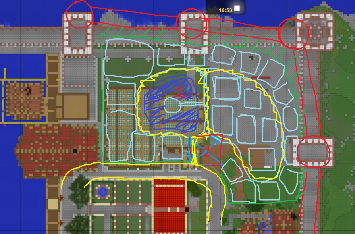 Шикарно! С возвращением. Надеюсь еще Гару утрясет. --- С островом. Думал об этом. Есть несколько проблем. а) собственно его насыпать/строить, он выйдет очень немаленьким, чтобы добиться сопоставимого размера с доступным внутри стен; б) все же этой городской зоопарк и его вынос будет слегка... спорным, нужно будет строить какой-то мост или что-то такое для доступа (не бултыхаться же каждый раз по воде); в) связано с предыдущим пунктом - нелепо, что город весь за стенами, а тут высунут беззащитный зоопарк, если еще и вокруг него городить стену отдельную -- еще нелепей. Поэтому все же лучше сделать внутри. --- Вот, кстати апдейт по градостроительному плану. Я тут уже выделил наш Zoo, апдейт по кварталу гномов (с ним правда меня отвлек зоопарк) + разметке кварталов. Так как изначально я все разметил/разместил все довольно тупо, сейчас приходится очень изощрятся чтобы компенсировать. Планы глобальнее. май-июнь будет достраивать дома, сколько успеем + зоопарк + расширение квартала гномов + где надо терраморф и более опрятные улицы; июль я возьму что-то вроде реального отпуска, но буду готовить проекты стены; август - кровь из носа надо обновить стены, это довольно чудовищная задача; сентябрь - условно я бы назвал месяцем приборки-ревизии, так как к тому времени возможно уже будет анонсирован перенос на 1.8, надо будет решать вопросы по подготовке терр/складов к переносу и, не исключено, встанет вопрос по финансам. + из фриковых новостей Последнее время на меня уже несколько раз обрушивались люди полные фантастических идей по тому как мне нужно все делать в городе. Я с ними поругался в стиле кровавого диктатора с манией величия, так как не люблю авторитетов из пустоты. Но если у кого есть какие-то идеи как нам жить веселей с точки зрения РПГ или экономики, колитесь. C поправкой на реальность, конечно.