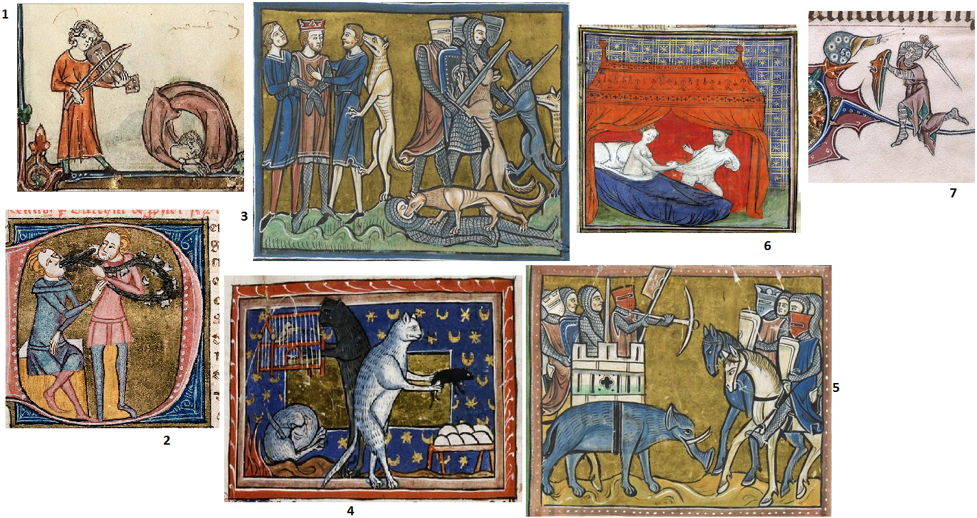 Хоть я не охотник, но вот что вижу я: 1) 1273 год. Шоу "Минута Славы". А вообще просто кто-то танцует под скрипку. Не более. 2) Поход к стоматологу 3) Соглашусь с Кирой. Но думаю этим хотели показать дружбу человека и собаки. 4) Типичные москвичи готовят шаурму. Москва, 1459 год. Ну а если без гоблина, то вот. 5) Первые кемперы. 1288 год. Может быть древние мысли о черепахах, китах,слонах? 6) бордель69. Ничего странного не вижу. 7) "отпусти, отпусти меня ... спайс". Может быть считалось, что улитка - это что-то плохое. Вроде чёрной кошки.