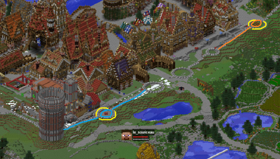 Так, ребята, я подготовил участки. Оранжевым - @Garou_notrdamm, пока 1 секцию, разомни кости после отсутствия : ) Бирюзовым - @Black_falcon, как ветерану 100500 строек, сразу 2 секции. Отрезки я отметил красной шерстью и факелами (включительно с ними). В кружочках соотвественного цвета ваши склады. Это с запасом, чтобы потом еще на башни, старайтесь экономнее, в плане что используйте готовые элементы до перекрафта цельных блоков. Желтым я отметил башни, они на подходе в пределах пары дней, кто там будет свободен, постепенно распределим. Стена по базе несложная, представляет собой повторы секций по 5-6 блоков. Мизер сложности только в "переходах" по X и Y со смещением в 1 блок. Но примеры переходов уже все отработаны -- можете их подглядывать на готовых секциях, благо они буквально рядом. То что стоит - это не только разметка, но уже 1 уровень блоков. Спасибо что взялись. По срокам -- за неделю-полторы сделаете, и славно. Если забуксуете, но обижусь, но передам кому шустрее.