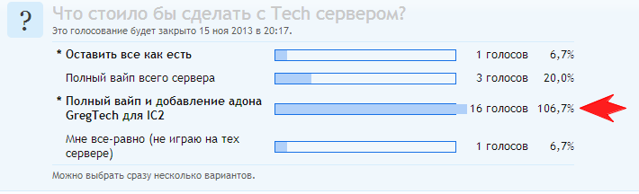 В связи с последними событиями на Тех сервере, а именно крупным откатом на несколько месяцев, прошу всех участников проголосовать и проявить желание в выборе того, чего бы ему хотелось видеть на сервере. Опрос простой, мы не хотим давить на администрацию, а просим прислушаться. P.S.:Ведь вайп можно произвести с переносом построек, но без оборудования (машин BK, RP, IC и CompactSolars)