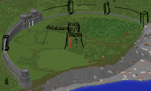 У меня, ребята, появилось несколько соображений по поводу ваших стен. Сужу по тому что вижу построенное и разметке. 1) Я бы предложил сделать больше башен, это улучшит эстетику, голый круг стены почти сдобренный башням -- сиротливо. Панорама выиграет. Будет и реалистичнее, так как такие выпуклости стен без усиления башнями уязвимы. 2) Башни (хотя бы некоторые) ЛУЧШЕ делать разными, да, это больше работы, смотреться будет серьезнее, чем 100% повтор как сейчас. Если я правильно понял намерение. По крайней мере ворота и башни примыкающие в воде заслуживают индивидуальности, башни по стене уж можно повторить. Просто у вас и так очень правильная стена, овал, если еще ее покрыть 100% одинаковыми башнями, будет скучновато. 3) Самое что меня смущает -- площадки на башнях НИЖЕ основной стены. Это имеет немного смысла. Традиционно башни -- это сильная, дорогая часть укреплений (когда стена дешевая, более уязвимая, но перекрывающая пространство). Так вы просто дарите врагами изи доступ : ) Зачем экономите оркам работу с длинной лестниц и высотой осадных башен? : )