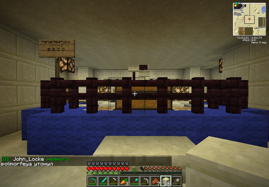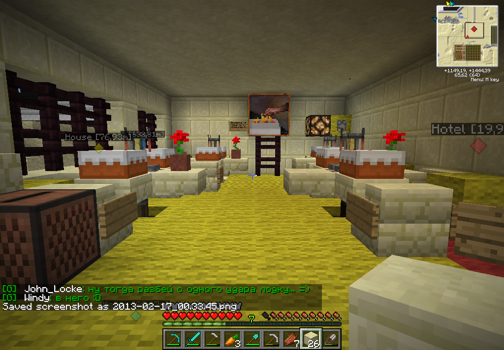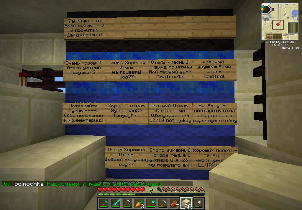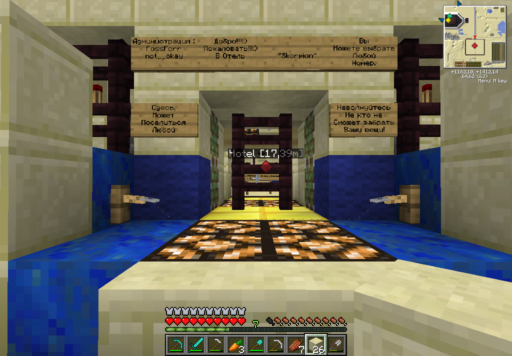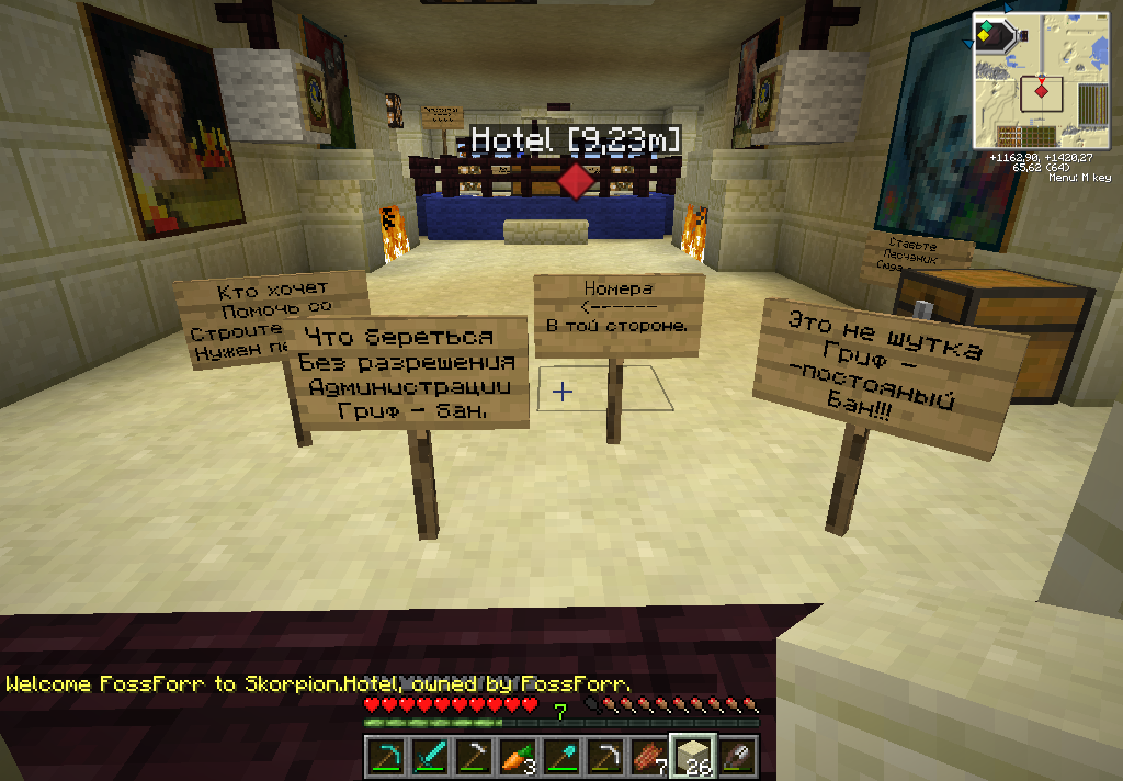 Всем привет!!!Хочу сообщить вам об моем Отеле для новичков, которые недавно на Private сервере или игроки которые пока не имеют дома. В Отеле есть достаточно номеров, в которых есть: сундук края, кровать, камин, печки с углем и стол зачарования.Номера с хорошим оформлением, пол сделанный из красной шерсти, лампа, которую вы можете включать, выключать по Вашему усмотрению. Координаты Отеля x: +1150 z: +1120.Так же в Отеле есть много развлечении: комната отдыха, кофе с бесплатной едой, тир, чаровальня в которой вы можете зачаровать нужные вам инструменты на 30 ур. и разные и т.п. В Отеле будут появляться, новые развлечения и т.п. Все вопросы Вы можете задать в этой теме или в ЛС FossForr или not__okay.Поселиться в Отеле, Вы можете когда нас нету в игре. Огромная просьба!!!Читайте внимательно все что написано на табличках и выполняйте их требования. Отель далековато, но есть водяная дорожка с warp spawn-а до Отеля, на которой вы можете без лагов доплыть до Отеля.Спасибо за внимание! ( FossForr. )