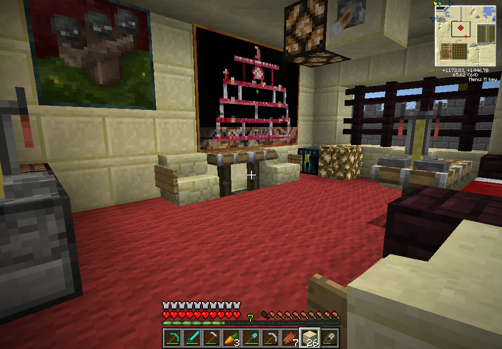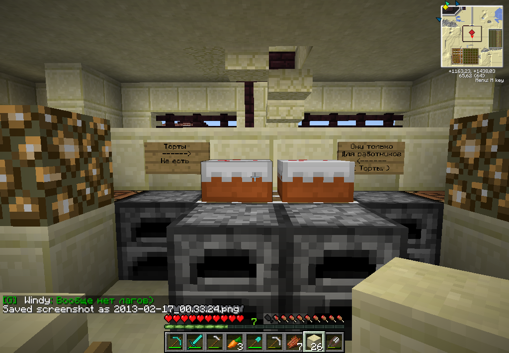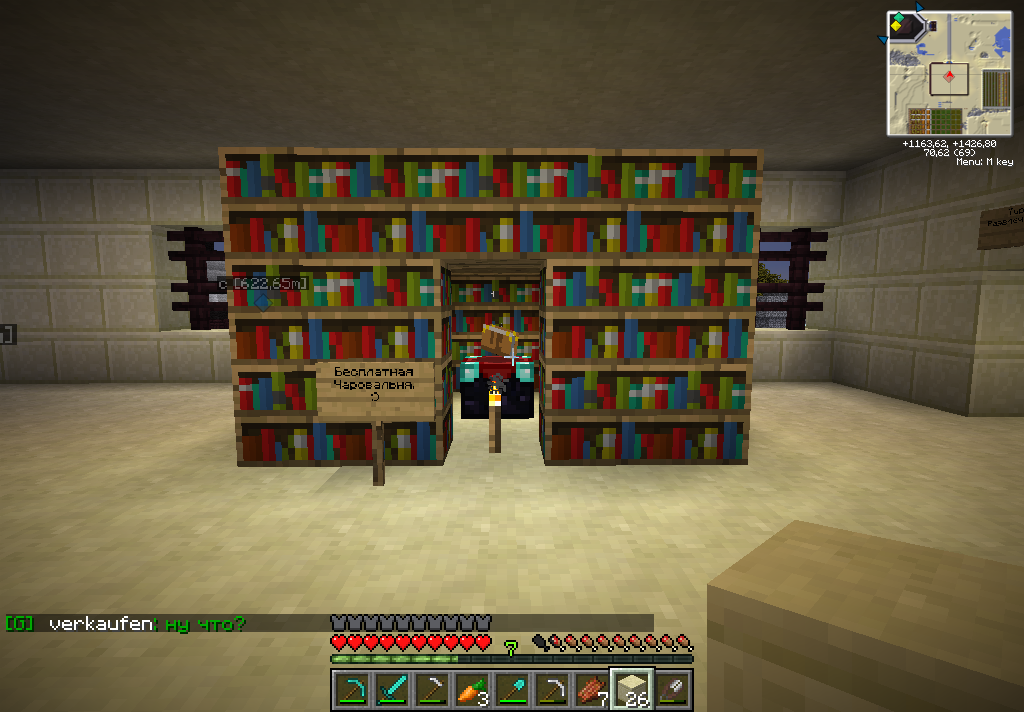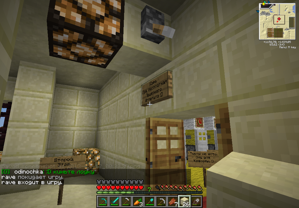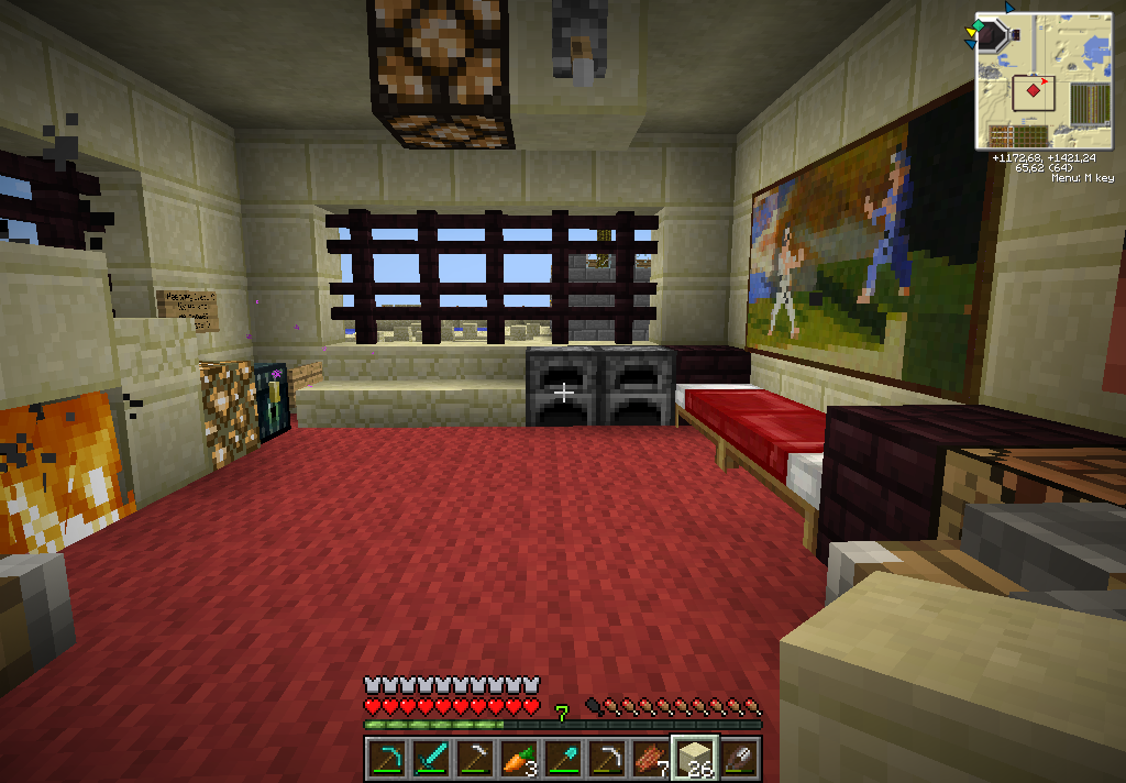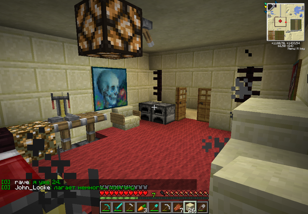 Всем привет!!!Хочу сообщить вам об моем Отеле для новичков, которые недавно на Private сервере или игроки которые пока не имеют дома. В Отеле есть достаточно номеров, в которых есть: сундук края, кровать, камин, печки с углем и стол зачарования.Номера с хорошим оформлением, пол сделанный из красной шерсти, лампа, которую вы можете включать, выключать по Вашему усмотрению. Координаты Отеля x: +1150 z: +1120.Так же в Отеле есть много развлечении: комната отдыха, кофе с бесплатной едой, тир, чаровальня в которой вы можете зачаровать нужные вам инструменты на 30 ур. и разные и т.п. В Отеле будут появляться, новые развлечения и т.п. Все вопросы Вы можете задать в этой теме или в ЛС FossForr или not__okay.Поселиться в Отеле, Вы можете когда нас нету в игре. Огромная просьба!!!Читайте внимательно все что написано на табличках и выполняйте их требования. Отель далековато, но есть водяная дорожка с warp spawn-а до Отеля, на которой вы можете без лагов доплыть до Отеля.Спасибо за внимание! ( FossForr. )