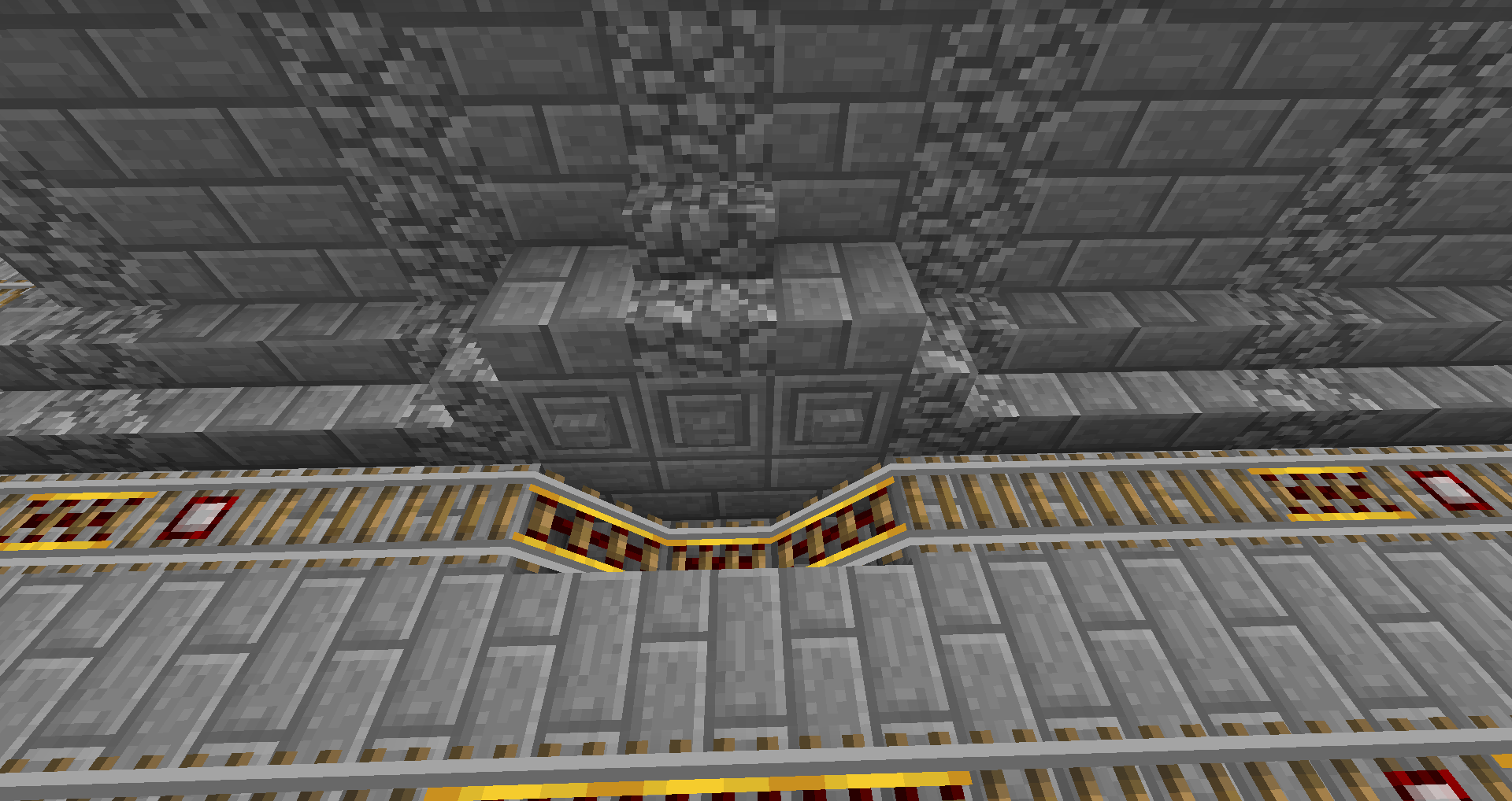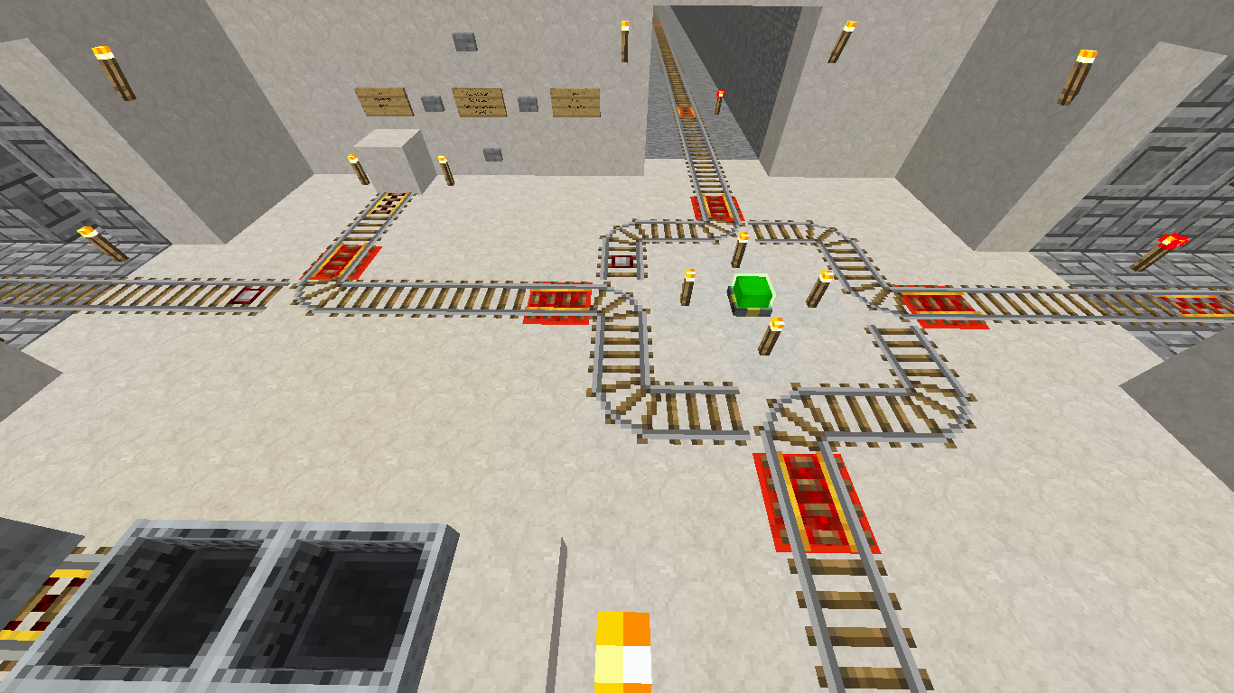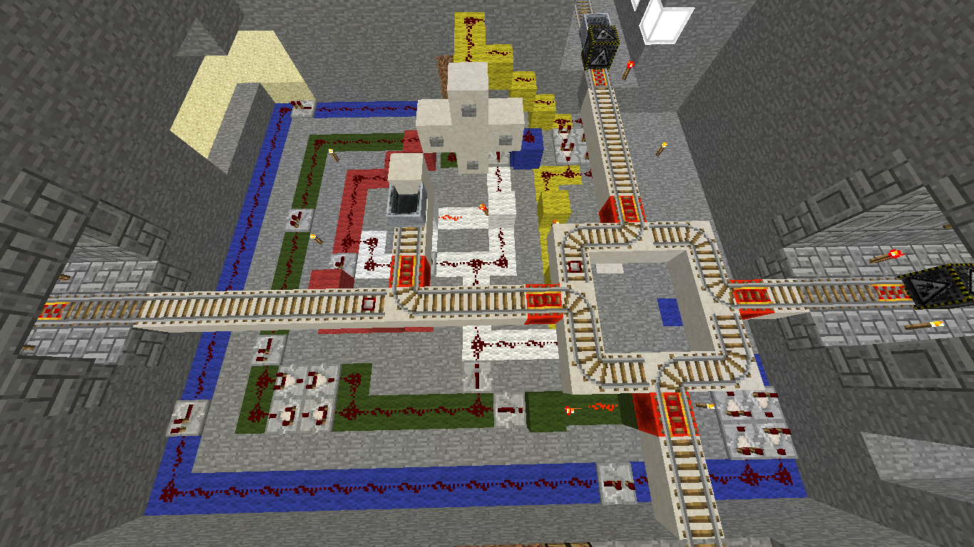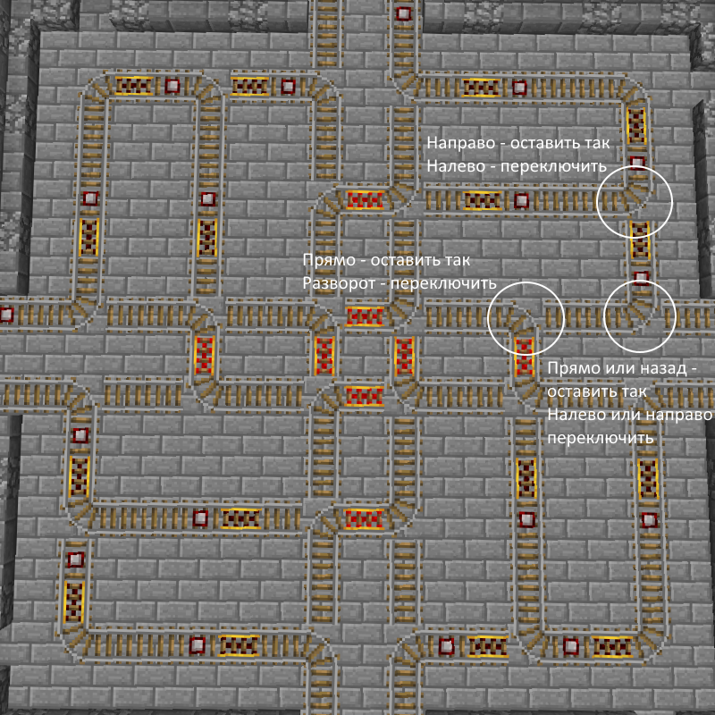 angvar, Большое спасибо за помощь Для повторения я выбрал однопутную станцию, так как из-за небольшой загруженности и других причин метро на техе однопутное. Алгоритм работы следующий: вагонетка приезжая на станцию с любого направления, попадает на приёмный путь где и останавливается, а при нажатию на кнопку едет в выбранном направлении. Т.е. пути приёмопередающие и равноправные. Благодаря твоим идеям, получилось так как я хотел - визуально-компактно, лаконично, и функционально В процессе решил проверить свои силы, и сделать всё на ванили. Возможно кому-то будет интересно: Спойлер Почти собранная станция без декоративных стен: Для большего удобства, цветом промаркировал какая линия редстоуна за что отвечает: желтая, зелёная, синяя, и красная отвечают за соответствующие стрелки, а белая отвечает за запуск рельс приёмного тупичка, (эта цепь зажигается при нажатии любой кнопки, правило ИЛИ) Цепочки компараторов поддерживают управляющий сигнал на стрелках, чтобы вагонетка успела проехать - обычного времени удержания кнопки нажатой, увы, недостаточно. Поставить ещё несколько факелов для запитывания энергорельс возле кольца оказалось нереально, поэтому пришлось использовать блоки красного камня. Ориентация по сторонам света на скринах: слева запад, справа восток. На скриншотах ниже есть небольшая неточность - на один блок левее "желтой" стрелки, красный провод лежащий на белой шерсти был впоследствии сдвинут на 1 блок вниз (на юг), чтобы его не запитывал блок красного камня. (окончательное расположение - как на 1-ом скриншоте). Она же без рельс и кнопок: