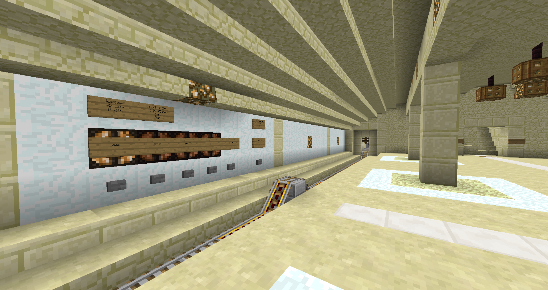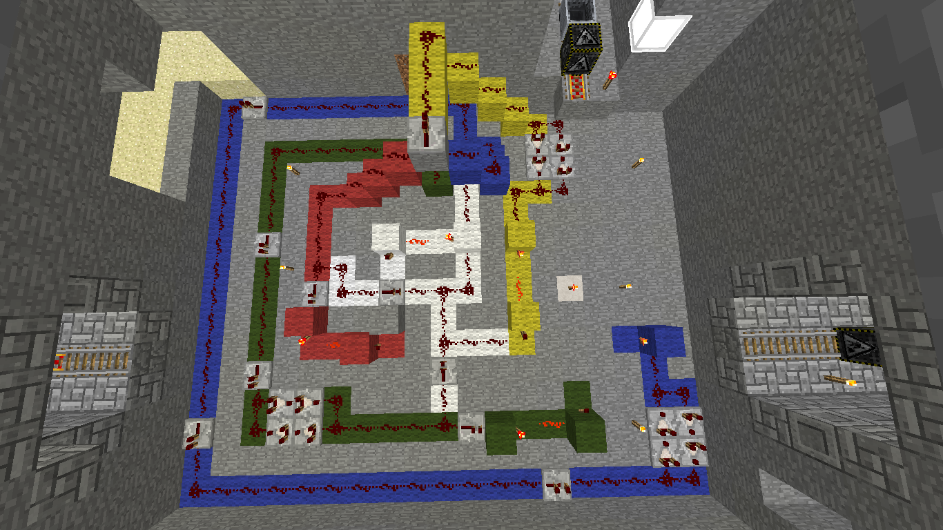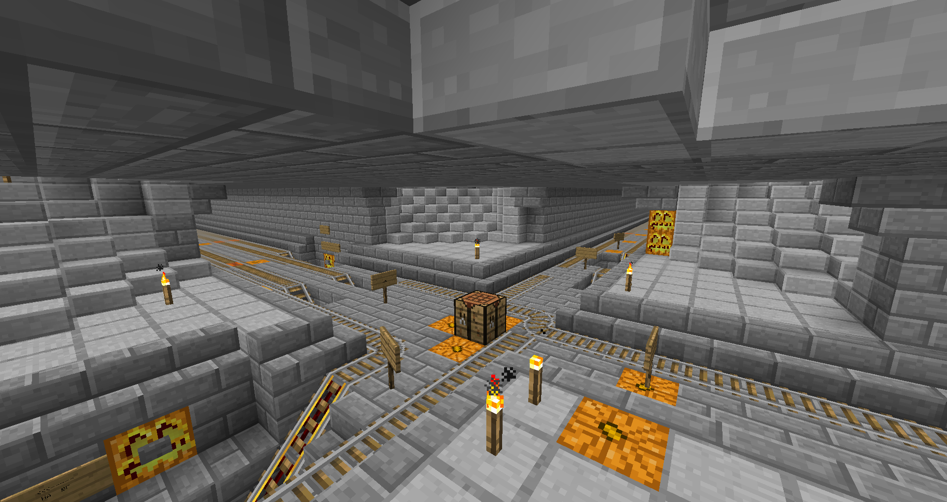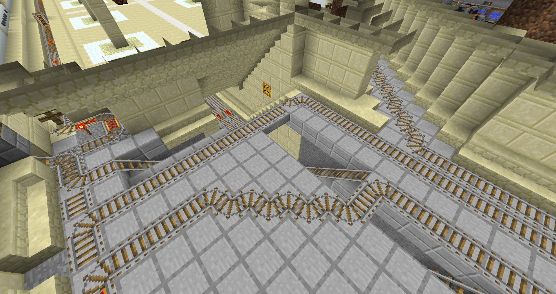 angvar, Большое спасибо за помощь Для повторения я выбрал однопутную станцию, так как из-за небольшой загруженности и других причин метро на техе однопутное. Алгоритм работы следующий: вагонетка приезжая на станцию с любого направления, попадает на приёмный путь где и останавливается, а при нажатию на кнопку едет в выбранном направлении. Т.е. пути приёмопередающие и равноправные. Благодаря твоим идеям, получилось так как я хотел - визуально-компактно, лаконично, и функционально В процессе решил проверить свои силы, и сделать всё на ванили. Возможно кому-то будет интересно: Спойлер Почти собранная станция без декоративных стен: Для большего удобства, цветом промаркировал какая линия редстоуна за что отвечает: желтая, зелёная, синяя, и красная отвечают за соответствующие стрелки, а белая отвечает за запуск рельс приёмного тупичка, (эта цепь зажигается при нажатии любой кнопки, правило ИЛИ) Цепочки компараторов поддерживают управляющий сигнал на стрелках, чтобы вагонетка успела проехать - обычного времени удержания кнопки нажатой, увы, недостаточно. Поставить ещё несколько факелов для запитывания энергорельс возле кольца оказалось нереально, поэтому пришлось использовать блоки красного камня. Ориентация по сторонам света на скринах: слева запад, справа восток. На скриншотах ниже есть небольшая неточность - на один блок левее "желтой" стрелки, красный провод лежащий на белой шерсти был впоследствии сдвинут на 1 блок вниз (на юг), чтобы его не запитывал блок красного камня. (окончательное расположение - как на 1-ом скриншоте). Она же без рельс и кнопок: