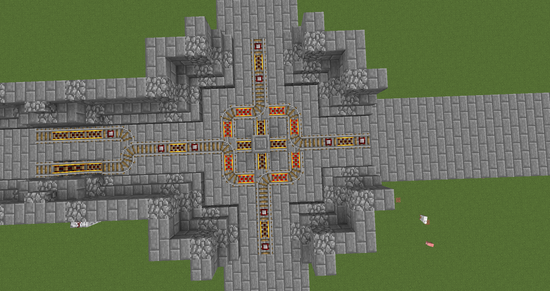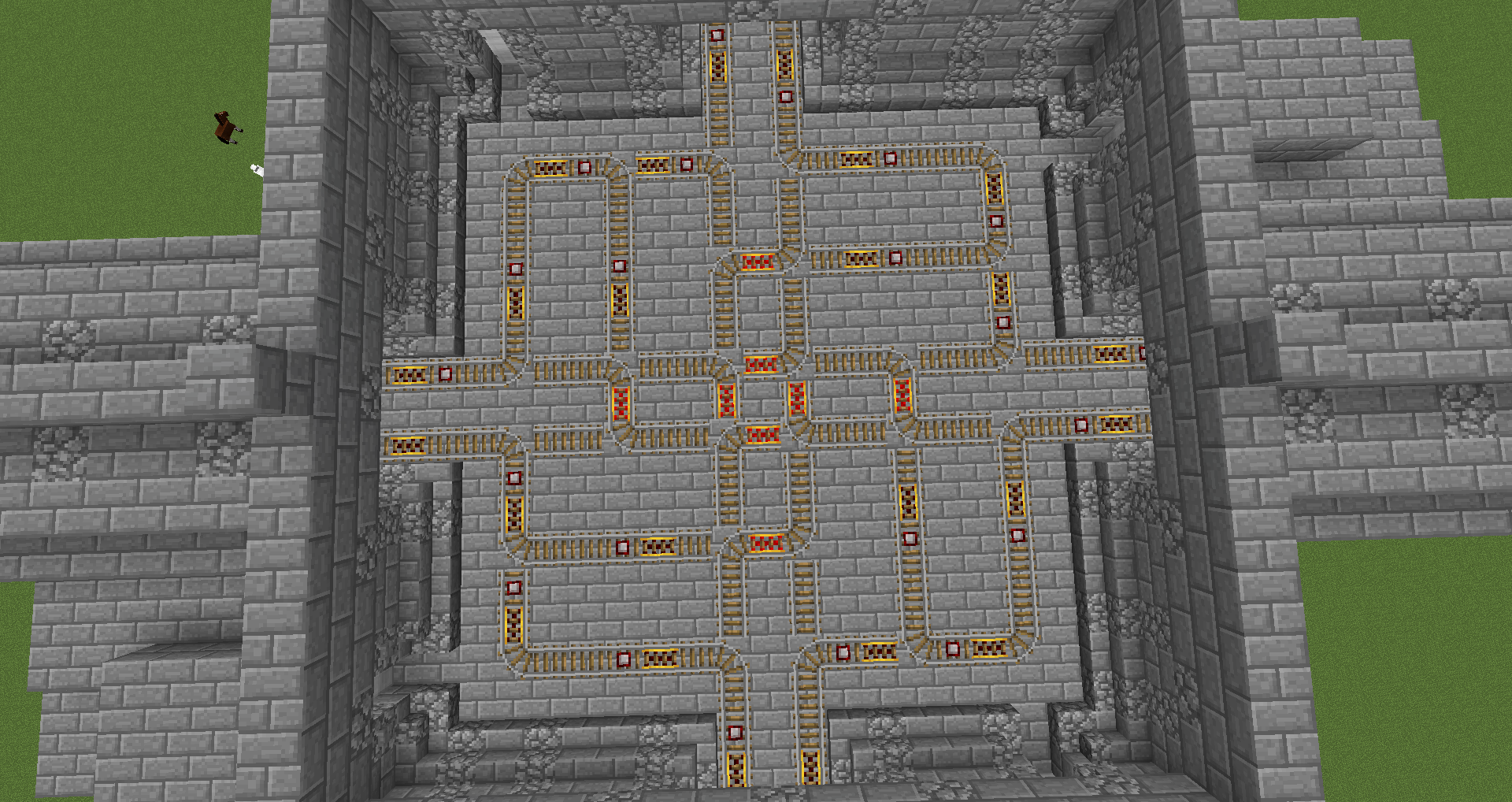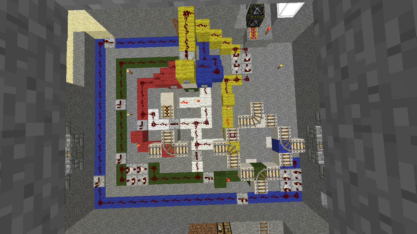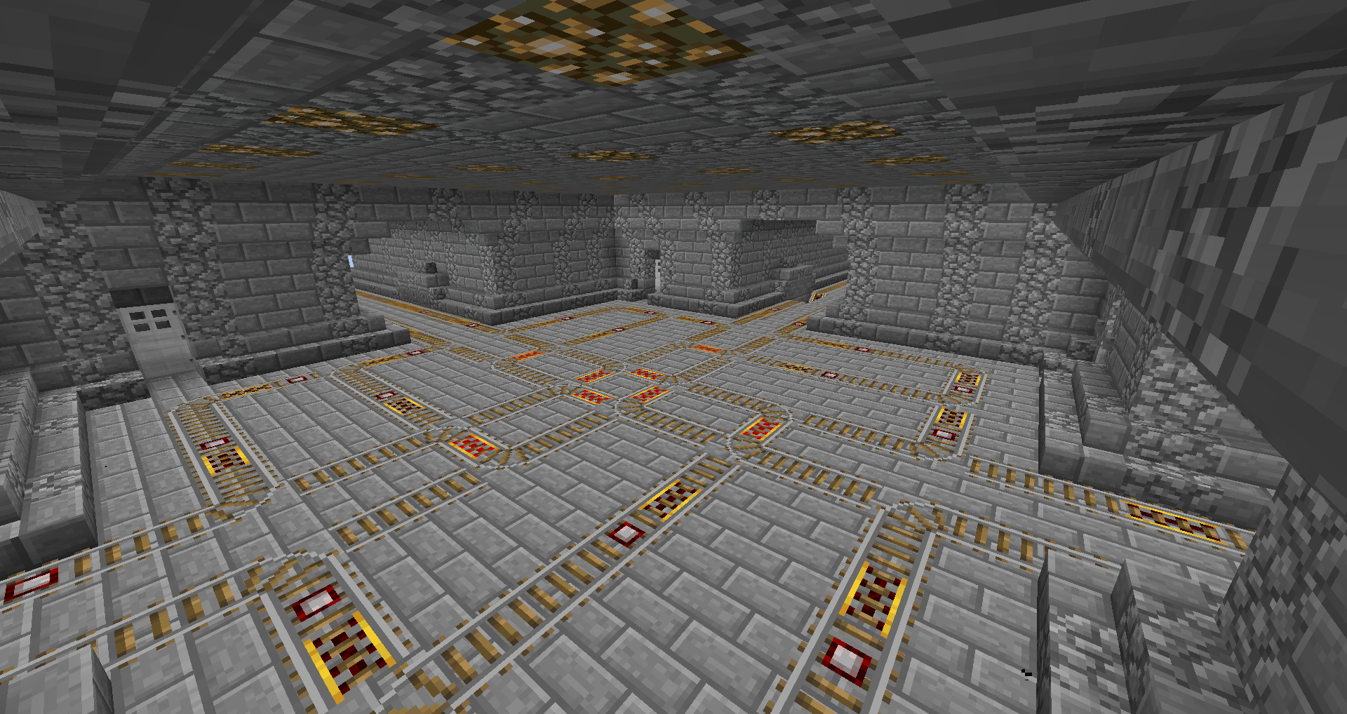 angvar, Большое спасибо за помощь Для повторения я выбрал однопутную станцию, так как из-за небольшой загруженности и других причин метро на техе однопутное. Алгоритм работы следующий: вагонетка приезжая на станцию с любого направления, попадает на приёмный путь где и останавливается, а при нажатию на кнопку едет в выбранном направлении. Т.е. пути приёмопередающие и равноправные. Благодаря твоим идеям, получилось так как я хотел - визуально-компактно, лаконично, и функционально В процессе решил проверить свои силы, и сделать всё на ванили. Возможно кому-то будет интересно: Спойлер Почти собранная станция без декоративных стен: Для большего удобства, цветом промаркировал какая линия редстоуна за что отвечает: желтая, зелёная, синяя, и красная отвечают за соответствующие стрелки, а белая отвечает за запуск рельс приёмного тупичка, (эта цепь зажигается при нажатии любой кнопки, правило ИЛИ) Цепочки компараторов поддерживают управляющий сигнал на стрелках, чтобы вагонетка успела проехать - обычного времени удержания кнопки нажатой, увы, недостаточно. Поставить ещё несколько факелов для запитывания энергорельс возле кольца оказалось нереально, поэтому пришлось использовать блоки красного камня. Ориентация по сторонам света на скринах: слева запад, справа восток. На скриншотах ниже есть небольшая неточность - на один блок левее "желтой" стрелки, красный провод лежащий на белой шерсти был впоследствии сдвинут на 1 блок вниз (на юг), чтобы его не запитывал блок красного камня. (окончательное расположение - как на 1-ом скриншоте). Она же без рельс и кнопок: