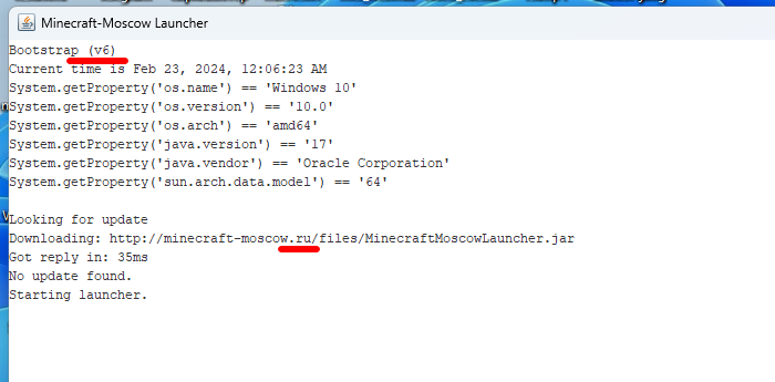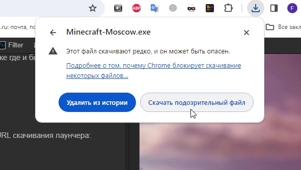 Друзья, обновился "запускатор" лаучнера. Крайне рекомендую обновить его у себя. Ссылка на него там же где и была, а для ленивых выложу прямые ссылки на него. https://www.minecraft-moscow.ru/files/Minecraft-Moscow.exe или версия без exe обёртки, если надо. https://www.minecraft-moscow.ru/files/Minecraft-Moscow.jar Если кому хочется убедиться, что скачана новая версия, то определить можно по версии v6 и по зоне в URL скачивания лаунчера: PS: .exe новый файл, с новыми контрольными суммами, по этому google считает его подозрительным. Если считаете это для себя опасным, хотя это точно такой же .jar, просто с иконкой и более простым запуском, то пользуйтесь .jar файлом. Со временем google перестанет считать наш .exe файл подозрительным, а jar файлы подозрительными он никогда не считает. UPD: Если скачка в Хроме не начинается, то смотрите скрин: