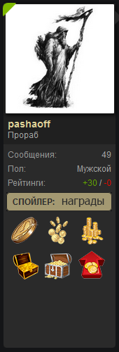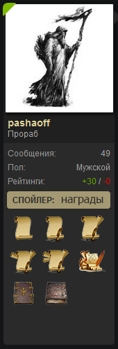 Я могу сделать такую таблицу, когда будут четко определены все критерии и названия (в скором времени сделаю прототип). Могу также периодически ее обновлять при добавлении штучных наград и отправлять вам для публикации. Я считаю, что такая таблица нужна для общего ориентирования игроков, ее можно разместить в отдельной теме форума, например и периодически обновлять. Я принципиально против того чтобы администрация разрешала или запрещала показ тех или иных достижений. А давать человеку возможность выбирать самую значимую награду считаю просто бессмысленной (касается прогрессирующих), потому-что большинство из них это есть ничто иное как прогресс в каком-то деле (прохождение уровней), один значок просто должен сменять другой поэтапно (выслуга лет, посты). В данном контексте имеет смысл только максимальный уровень. Или может быть я чего-то не знаю, может есть какие-то технические проблемы это осуществить? В конце концов можно разместить пиктограммы раскрываемых списков наград по категориям прямо на аватаре с краю в виде небольших кружков при нажатии на которые будет раскрываться категория и имеющиеся в ней награды (как штучные, так и максимальные прогрессирующие). Если нет наград, то пиктограммы просто не отображаются и никакие спойлеры не понадобятся. Сурисо неоднократно упоминал, что награда должна быть трудно зарабатываемой, но не невозможной (это по поводу штучных наград). Поэтому, если у игрока будет иконостас как у меня на скрине, что в этом такого? Активный полезный игрок, пусть другие видя это стремятся к его уровню, интересуются как можно этого достичь и достигают. А таблицу я сделаю, с категориями только определитесь точно.