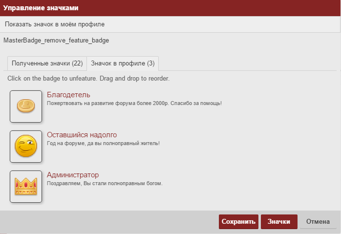 @pashaoff, ладно, я вижу что вы не понимаете смысл моих сообщений. Отвечу немного проще: как-то кардинально изменять систему никто не будет, это несколько дней переписывать и тестировать код. Который к тому же может накидать кучу ошибок, потому что всё что есть связано между собой. Попробую показать наглядно, на примере своего форума. Спойлер: Информация о пользователе Спойлер: Вкладка в профиле Спойлер: Полученные достижения Спойлер: Выбор значков для показа Спойлер: Отображаемые значки Это основная часть системы достижений. Помимо этого есть редактор уровней, различные топы и графики для любителей статистики и покорения всевозможных вершин во всём что только можно.