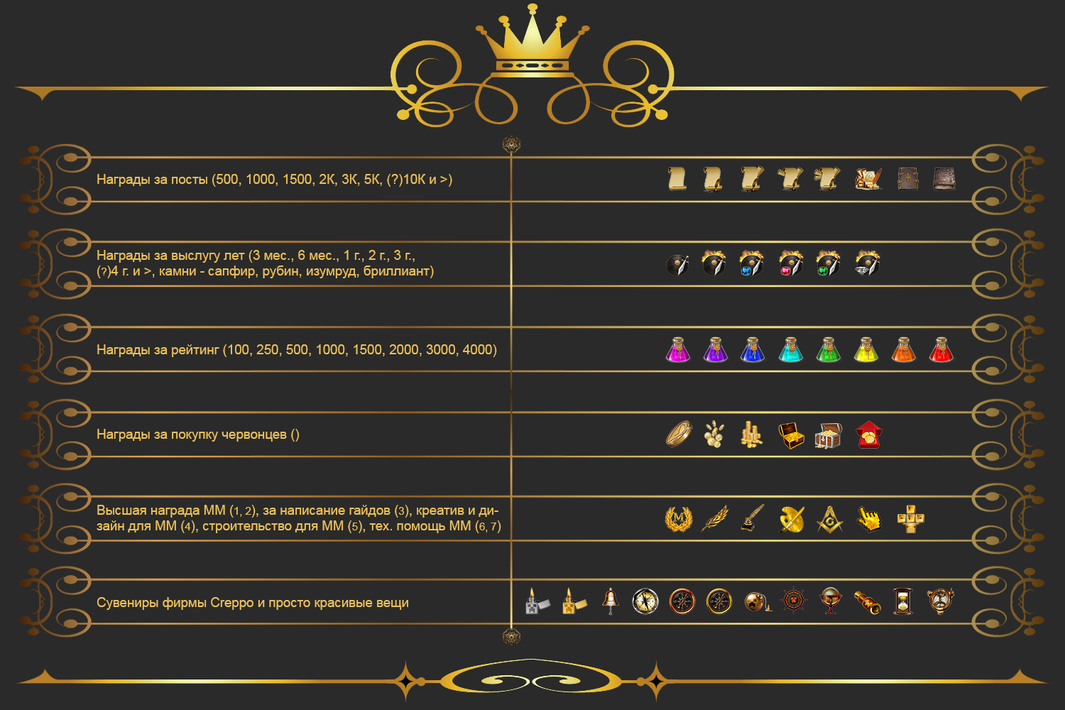 И, наконец, обещанная мной таблица. Вариант рабочий, не обессудьте). Четвертую строку еще немного доработаю, есть хорошие изображения и предлагаю ввести несколько наград за покупку червонцев по суммарному результату в конце года. Таким образом, каждый год у всех будет возможность заработать эти награды.