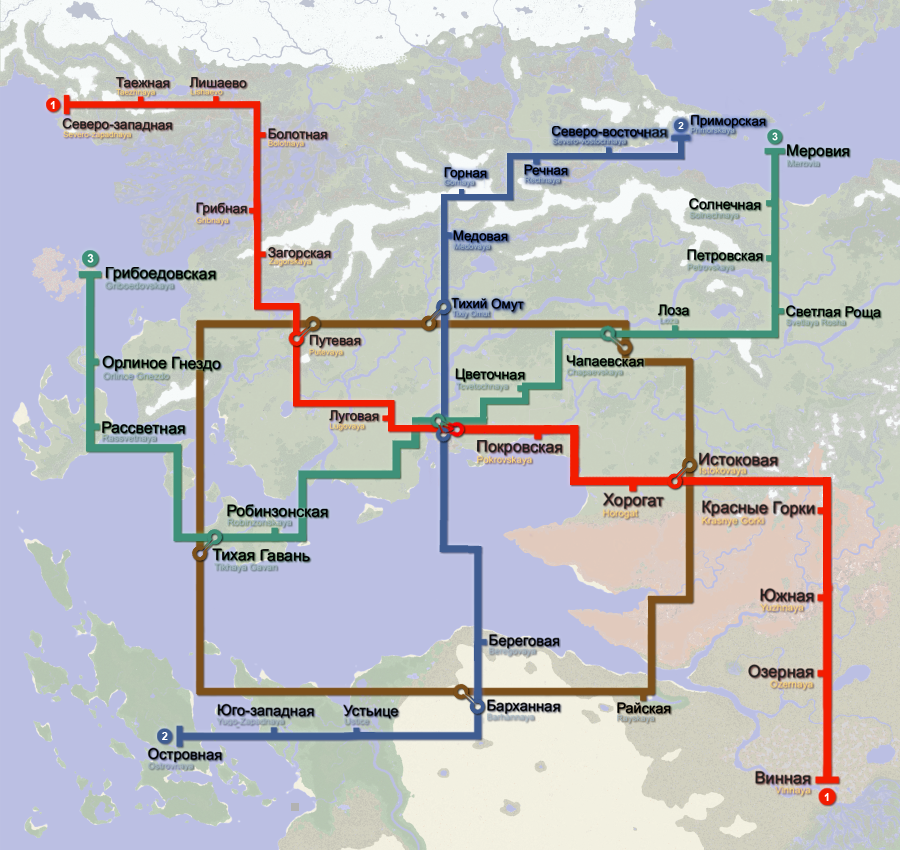 Мне кажется не очень рациональной такая карта веток. Слабый охват севера (на северо-востоке целый небольшой континент), да и по центральной части (Горная/Речная) как-то робко заходит -- там еще дофига карты наверх. + Думаю самый востребованный маршрут был бы со спауна в пустыню и джунгли (туда нет альтернатив по порталам), а вы задвинули это покрытие в конец очереди. Опять же, большая часть населения пасется на центральной равнине, но вы строите первой веткой красную, сводя сравнительно непопулярные юго-восток и северо-запад, а самого живого места охватывает не так много.