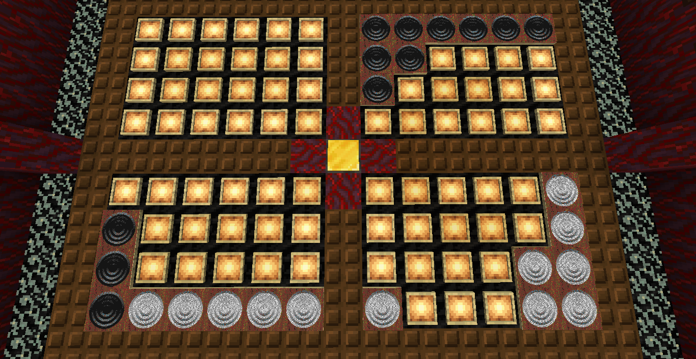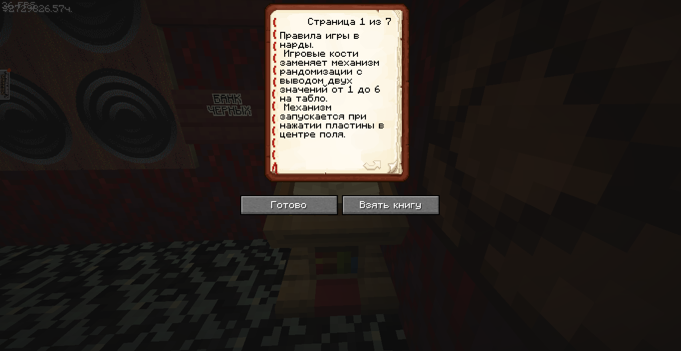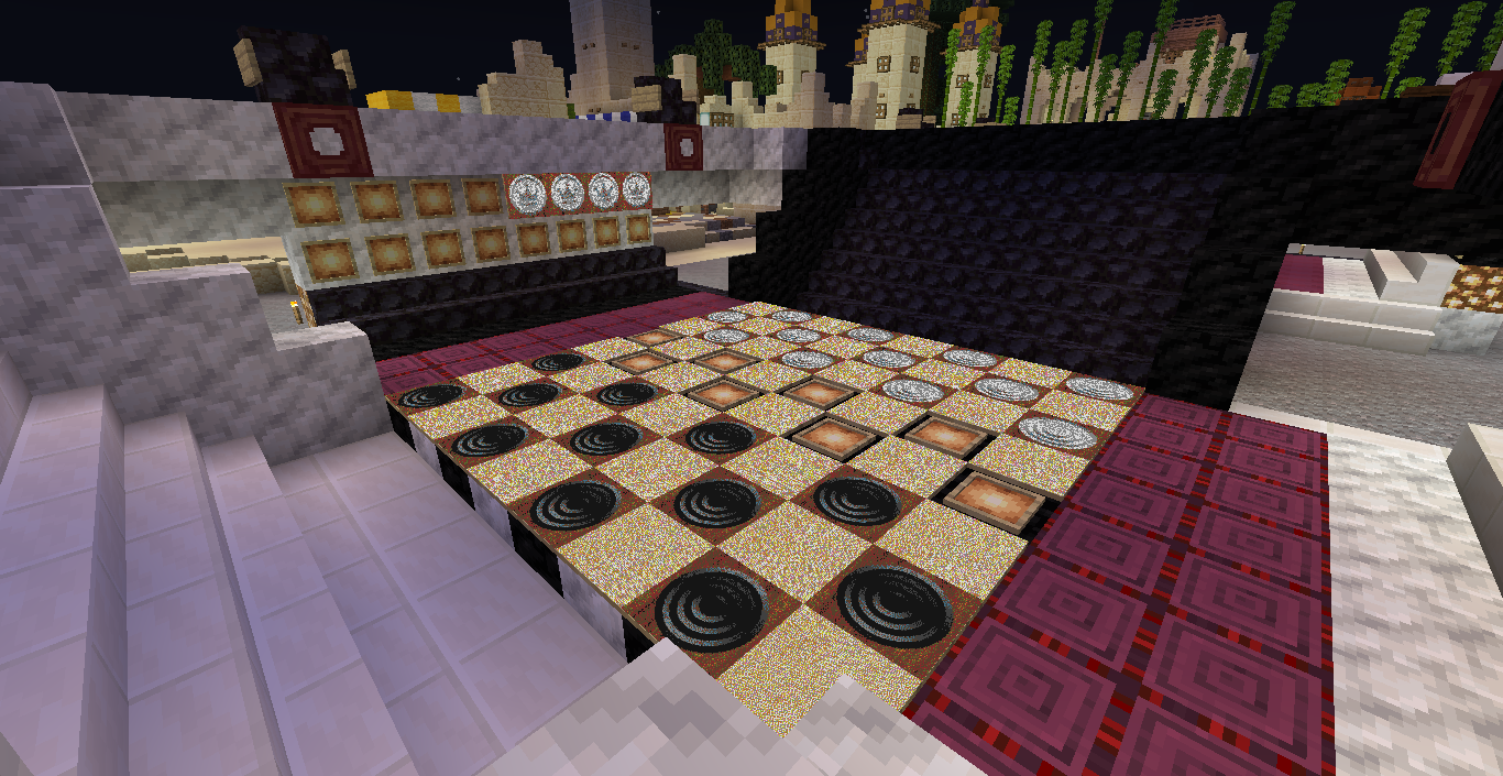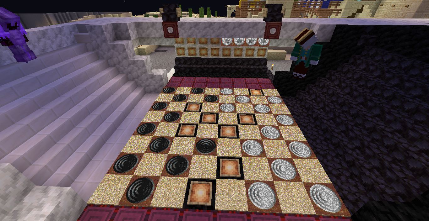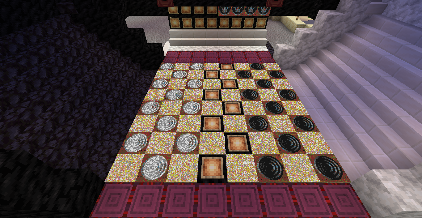Готово, город песков представляет новую мини-игру нарды! Правила игры в нарды. Игровые кости заменяет механизм рандомизации с выводом двух значений от 1 до 6 на табло. Механизм запускается при нажатии пластины в центре поля. Сигнал не стопорится - будьте внимательны.. Ход игрока состоит из двух перемещений шашек, согласно числовым значениям табло. Играть удобнее от третьего лица, переключив камеру кнопкой F5. При начале игры игроки определяют очередность хода и цвет своих шашек путем нажатия на пластину в центре поля. Игрок, получивший большее количество очков играет белыми и ходит первым. Последующие игры – первым ходит победитель прошлой игры. Каждый игрок играет 12-ю шашками своего цвета. Шашки расположены в банке на стене. Цель игры – провести все шашки с левого нижнего края против часовой стрелки до верхнего левого края и вывести с поля обратно в банк. На первом ходу игрок выставляет 2 шашки из банка, все последующие ходы не более 1 При невозможности выставить шашку из банка играются 2 шашки на поле. Пропускать ход нельзя, если есть возможность переместить шашки на поле, даже в ущерб своей позиции. Игрок может блокировать своими шашками не более 5 клеток подряд. Перекрывать 6 клеток и более подряд запрещено. Игровое поле ограничено 4 шашками в ряд (на голову) на одной клетке поля. Шашка, достигшая последней клетки, может быть возвращена из поля в банк в качестве 1 перемещения. Для этого необходимо, чтобы все шашки находились в последнем квадрате. Побеждает игрок, который первым провел все шашки через поле и вернул все шашки в банк. Для тех, кто играет впервые или уже забыл правила игры, по краям установлены кафедры с инструкцией. Хорошей игры! П.С. Для скептиков рандомайзера: как и в любых кубиках, одному из игроков будет везти чуть больше, другому чуть меньше в суммарном значении, но, тестируя в одиночке, убедился, что явного перекоса нет. Запись выпадающих очков прилагаю: нечетные - игроку 1, четные - игроку 2. 11 21 44 53 34 23 24 55 46 22 33 55 52 45 41 45 44 41 24 44 44 24 21 42 34 54 53 53 23 35 34 44 44 45 34 55 25 43 44 42 53 43 33 32 43 34 43 24 63 53 44 64 34 54 44 43 42 65 35 45 43 33 33 35 33 53 54 44 23 34 44 33 55 42 42 52 33 35 43 44 54 55 64 45 43 52 34 54 44 хода. 310 против 334 игрок 1 -24 24 25 35 44 54 33 33 52 33 23 54 34 23 33 35 54 43 44 63 55 34 52 53 23 33 12 54 55 52 15 53 25 54 23 44 41 42 21 44 55 43 11 23 23 41 45 46 45 35 34 32 42 52 24 43 24 44 52 25 14 24 45 24 43 34 34 64 33 53 23 35 34 42 35 55 52 35 44 23 23 45 23 33 43 21 44 51 44 44 хода. 316 против 293 игрок 1 +23 Так что решающее значение всё же будет иметь тактика и стратегия игры. И последнее: на сервере всё-таки возможны лаги, которые могут нарушить работу одного или обоих табло. Буду периодически проверять работу механизма, но если обнаружите явный сбой, когда например, табло долго не показывает значения больше одного или двух - зовите, пишите - все восстановим Жду всех в гости, всё так же песчаниковый портал со спауна. Зона мини игр справа от выхода из портала Шарифа. Шахматы, шашки, и, теперь, нарды.