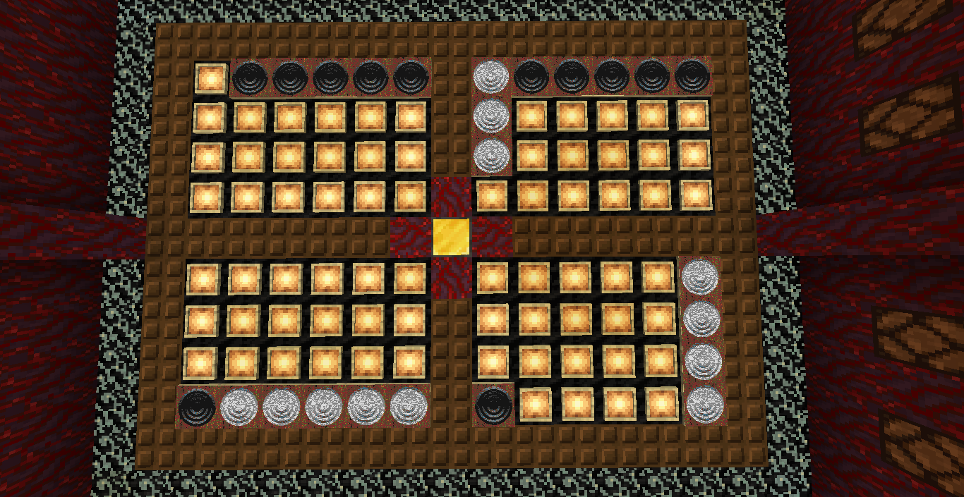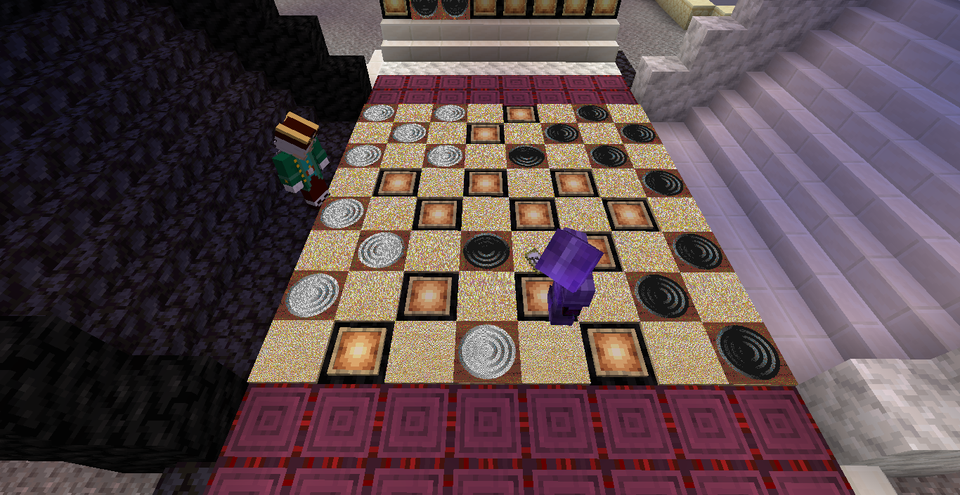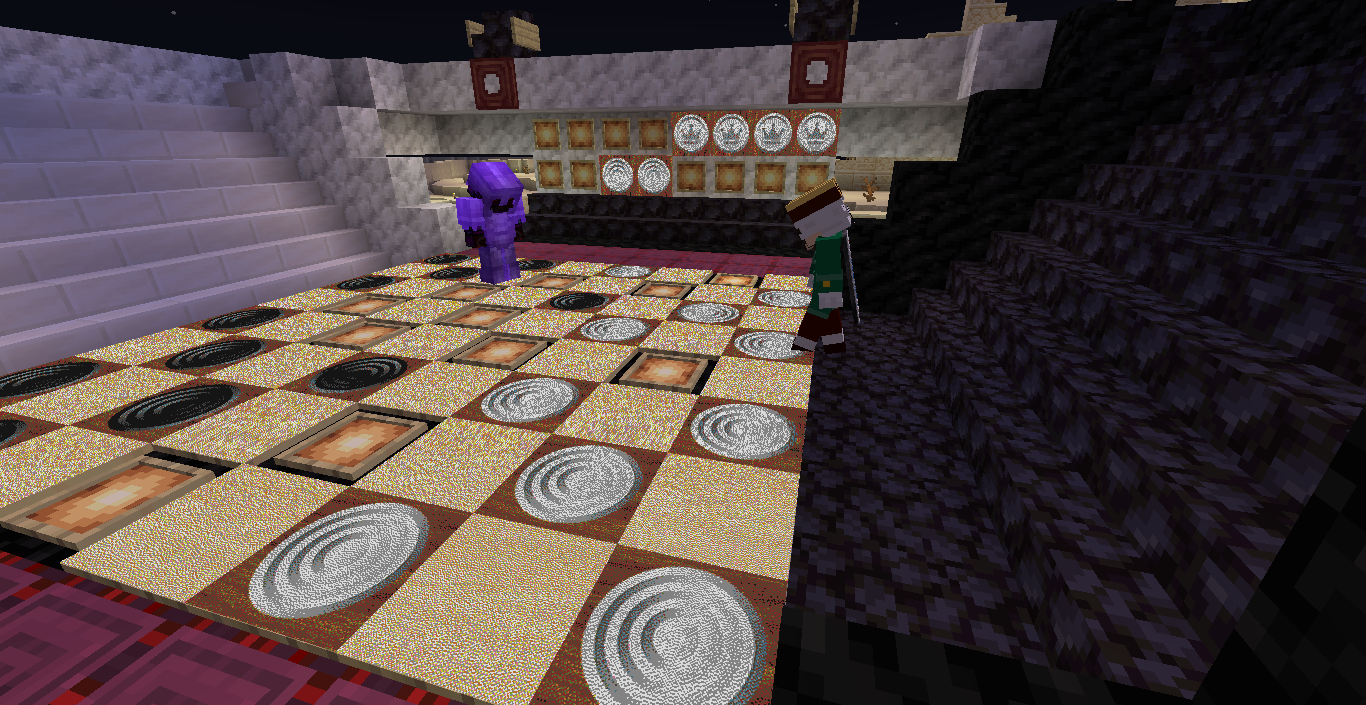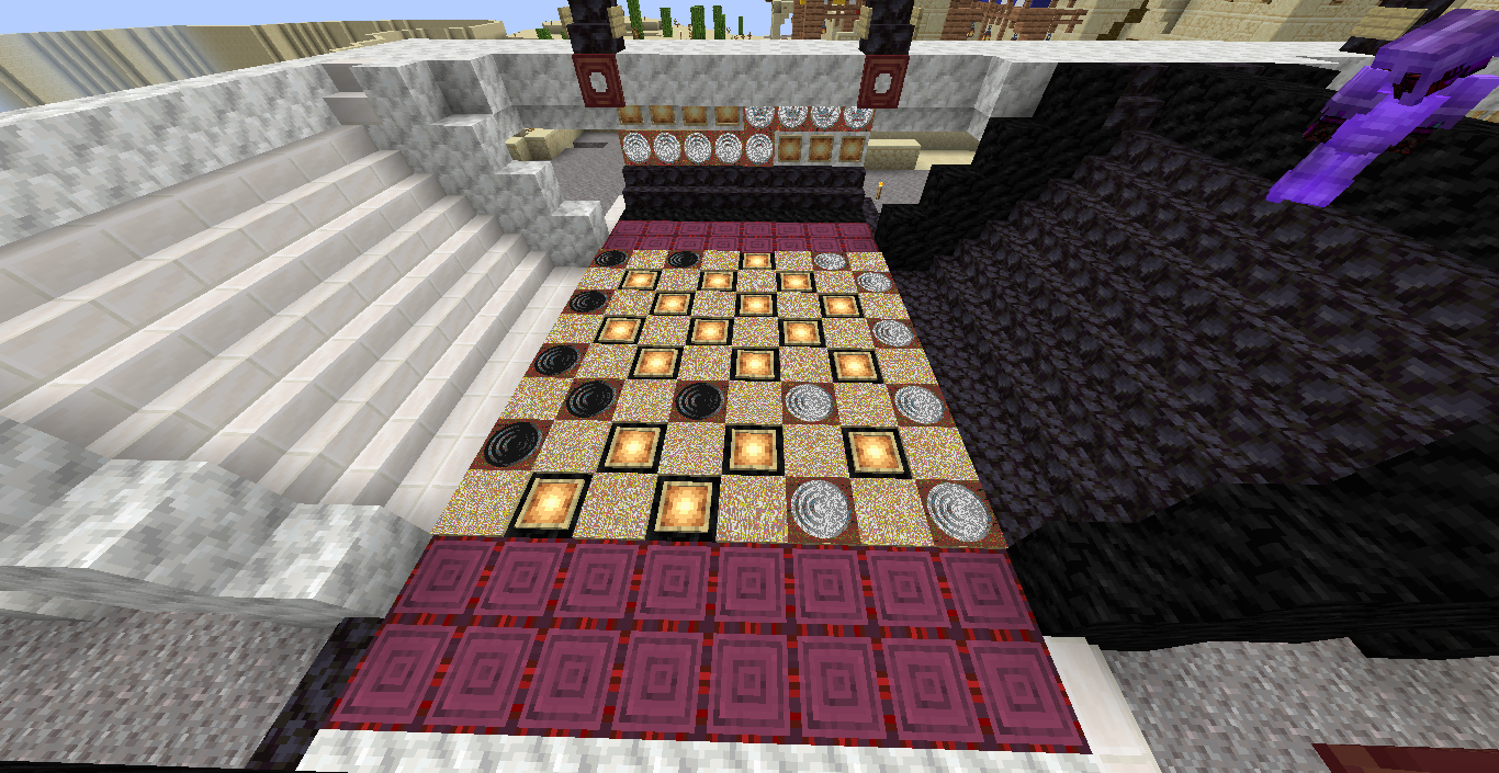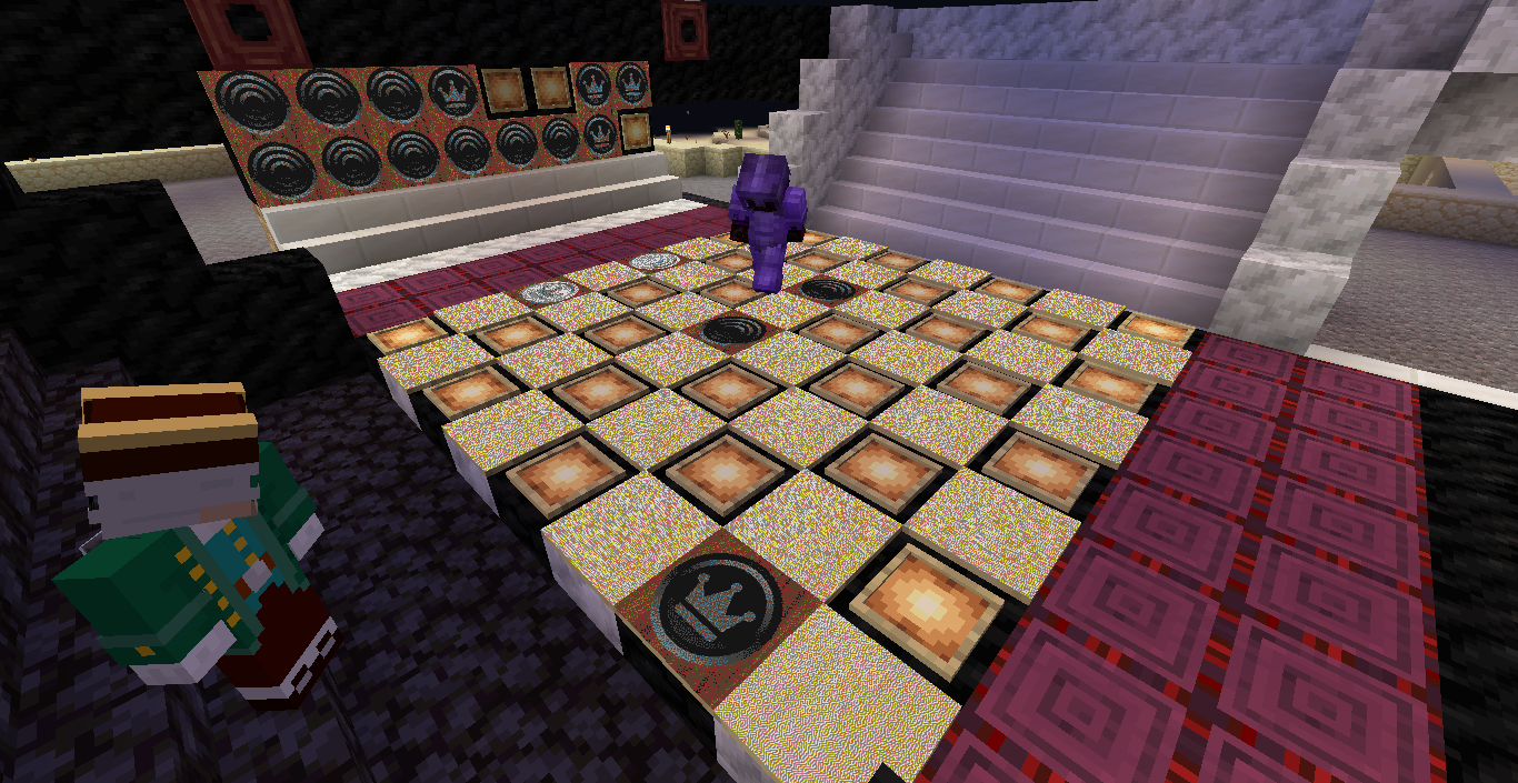 Готово, город песков представляет новую мини-игру нарды! Правила игры в нарды. Игровые кости заменяет механизм рандомизации с выводом двух значений от 1 до 6 на табло. Механизм запускается при нажатии пластины в центре поля. Сигнал не стопорится - будьте внимательны.. Ход игрока состоит из двух перемещений шашек, согласно числовым значениям табло. Играть удобнее от третьего лица, переключив камеру кнопкой F5. При начале игры игроки определяют очередность хода и цвет своих шашек путем нажатия на пластину в центре поля. Игрок, получивший большее количество очков играет белыми и ходит первым. Последующие игры – первым ходит победитель прошлой игры. Каждый игрок играет 12-ю шашками своего цвета. Шашки расположены в банке на стене. Цель игры – провести все шашки с левого нижнего края против часовой стрелки до верхнего левого края и вывести с поля обратно в банк. На первом ходу игрок выставляет 2 шашки из банка, все последующие ходы не более 1 При невозможности выставить шашку из банка играются 2 шашки на поле. Пропускать ход нельзя, если есть возможность переместить шашки на поле, даже в ущерб своей позиции. Игрок может блокировать своими шашками не более 5 клеток подряд. Перекрывать 6 клеток и более подряд запрещено. Игровое поле ограничено 4 шашками в ряд (на голову) на одной клетке поля. Шашка, достигшая последней клетки, может быть возвращена из поля в банк в качестве 1 перемещения. Для этого необходимо, чтобы все шашки находились в последнем квадрате. Побеждает игрок, который первым провел все шашки через поле и вернул все шашки в банк. Для тех, кто играет впервые или уже забыл правила игры, по краям установлены кафедры с инструкцией. Хорошей игры! П.С. Для скептиков рандомайзера: как и в любых кубиках, одному из игроков будет везти чуть больше, другому чуть меньше в суммарном значении, но, тестируя в одиночке, убедился, что явного перекоса нет. Запись выпадающих очков прилагаю: нечетные - игроку 1, четные - игроку 2. 11 21 44 53 34 23 24 55 46 22 33 55 52 45 41 45 44 41 24 44 44 24 21 42 34 54 53 53 23 35 34 44 44 45 34 55 25 43 44 42 53 43 33 32 43 34 43 24 63 53 44 64 34 54 44 43 42 65 35 45 43 33 33 35 33 53 54 44 23 34 44 33 55 42 42 52 33 35 43 44 54 55 64 45 43 52 34 54 44 хода. 310 против 334 игрок 1 -24 24 25 35 44 54 33 33 52 33 23 54 34 23 33 35 54 43 44 63 55 34 52 53 23 33 12 54 55 52 15 53 25 54 23 44 41 42 21 44 55 43 11 23 23 41 45 46 45 35 34 32 42 52 24 43 24 44 52 25 14 24 45 24 43 34 34 64 33 53 23 35 34 42 35 55 52 35 44 23 23 45 23 33 43 21 44 51 44 44 хода. 316 против 293 игрок 1 +23 Так что решающее значение всё же будет иметь тактика и стратегия игры. И последнее: на сервере всё-таки возможны лаги, которые могут нарушить работу одного или обоих табло. Буду периодически проверять работу механизма, но если обнаружите явный сбой, когда например, табло долго не показывает значения больше одного или двух - зовите, пишите - все восстановим Жду всех в гости, всё так же песчаниковый портал со спауна. Зона мини игр справа от выхода из портала Шарифа. Шахматы, шашки, и, теперь, нарды.