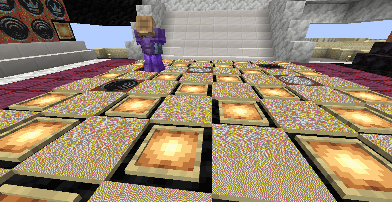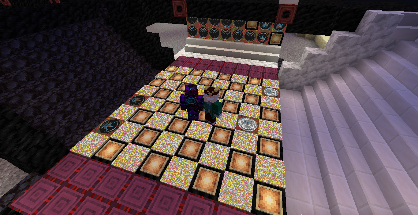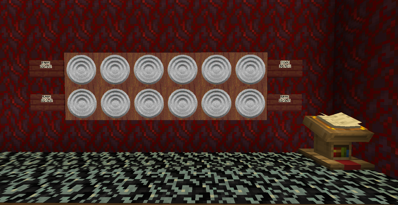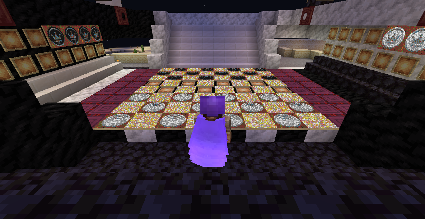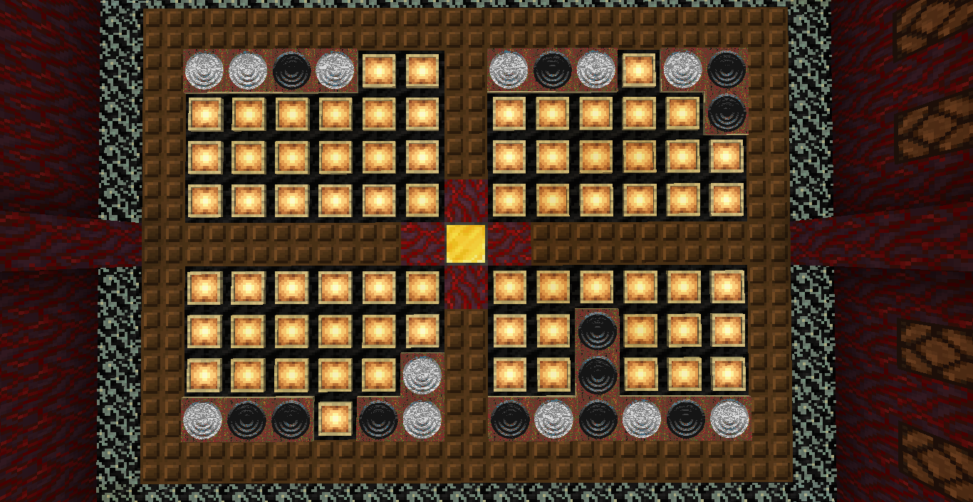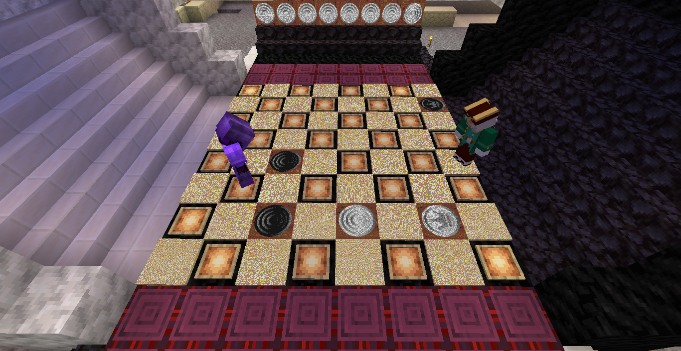 Готово, город песков представляет новую мини-игру нарды! Правила игры в нарды. Игровые кости заменяет механизм рандомизации с выводом двух значений от 1 до 6 на табло. Механизм запускается при нажатии пластины в центре поля. Сигнал не стопорится - будьте внимательны.. Ход игрока состоит из двух перемещений шашек, согласно числовым значениям табло. Играть удобнее от третьего лица, переключив камеру кнопкой F5. При начале игры игроки определяют очередность хода и цвет своих шашек путем нажатия на пластину в центре поля. Игрок, получивший большее количество очков играет белыми и ходит первым. Последующие игры – первым ходит победитель прошлой игры. Каждый игрок играет 12-ю шашками своего цвета. Шашки расположены в банке на стене. Цель игры – провести все шашки с левого нижнего края против часовой стрелки до верхнего левого края и вывести с поля обратно в банк. На первом ходу игрок выставляет 2 шашки из банка, все последующие ходы не более 1 При невозможности выставить шашку из банка играются 2 шашки на поле. Пропускать ход нельзя, если есть возможность переместить шашки на поле, даже в ущерб своей позиции. Игрок может блокировать своими шашками не более 5 клеток подряд. Перекрывать 6 клеток и более подряд запрещено. Игровое поле ограничено 4 шашками в ряд (на голову) на одной клетке поля. Шашка, достигшая последней клетки, может быть возвращена из поля в банк в качестве 1 перемещения. Для этого необходимо, чтобы все шашки находились в последнем квадрате. Побеждает игрок, который первым провел все шашки через поле и вернул все шашки в банк. Для тех, кто играет впервые или уже забыл правила игры, по краям установлены кафедры с инструкцией. Хорошей игры! П.С. Для скептиков рандомайзера: как и в любых кубиках, одному из игроков будет везти чуть больше, другому чуть меньше в суммарном значении, но, тестируя в одиночке, убедился, что явного перекоса нет. Запись выпадающих очков прилагаю: нечетные - игроку 1, четные - игроку 2. 11 21 44 53 34 23 24 55 46 22 33 55 52 45 41 45 44 41 24 44 44 24 21 42 34 54 53 53 23 35 34 44 44 45 34 55 25 43 44 42 53 43 33 32 43 34 43 24 63 53 44 64 34 54 44 43 42 65 35 45 43 33 33 35 33 53 54 44 23 34 44 33 55 42 42 52 33 35 43 44 54 55 64 45 43 52 34 54 44 хода. 310 против 334 игрок 1 -24 24 25 35 44 54 33 33 52 33 23 54 34 23 33 35 54 43 44 63 55 34 52 53 23 33 12 54 55 52 15 53 25 54 23 44 41 42 21 44 55 43 11 23 23 41 45 46 45 35 34 32 42 52 24 43 24 44 52 25 14 24 45 24 43 34 34 64 33 53 23 35 34 42 35 55 52 35 44 23 23 45 23 33 43 21 44 51 44 44 хода. 316 против 293 игрок 1 +23 Так что решающее значение всё же будет иметь тактика и стратегия игры. И последнее: на сервере всё-таки возможны лаги, которые могут нарушить работу одного или обоих табло. Буду периодически проверять работу механизма, но если обнаружите явный сбой, когда например, табло долго не показывает значения больше одного или двух - зовите, пишите - все восстановим Жду всех в гости, всё так же песчаниковый портал со спауна. Зона мини игр справа от выхода из портала Шарифа. Шахматы, шашки, и, теперь, нарды.