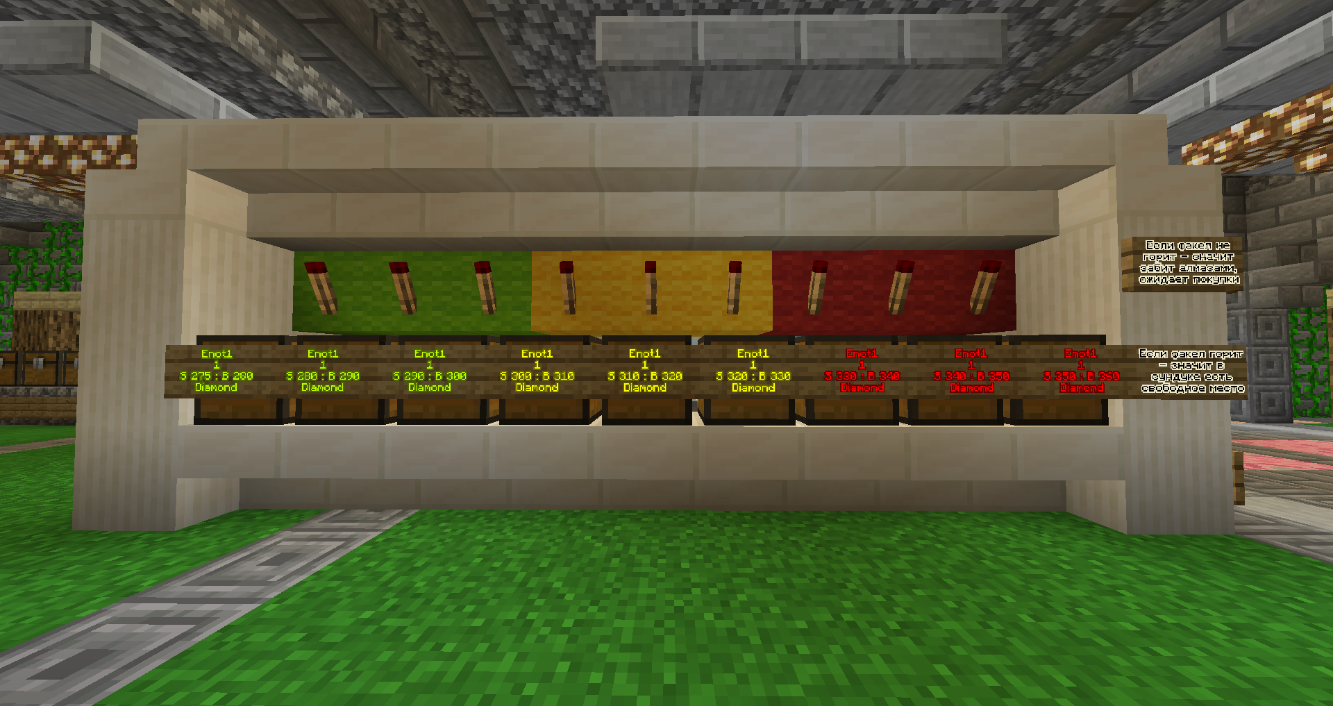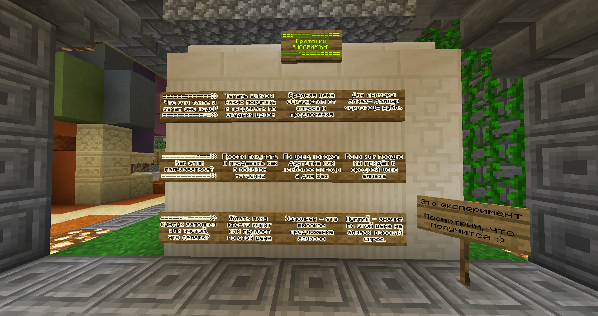 Эту идею мне подкинул Fraik_rus в теме админшопа. Итак, если по методичке: Биржа — это специальная площадка, на которой люди заключают сделки и обмениваются деньгами, товарами, ценными бумагами или производными контрактами. Под последними понимается обязательство купить или продать какой‑то актив, когда его цена достигнет определенного уровня. В целом биржа работает почти так же, как обычный продуктовый рынок, то есть всё решает баланс спроса и предложения: чем выше спрос на тот или иной товар, тем выше его цена. Так как магазин игроков пока отдыхает, хотелось сделать что-то похожее средствами, которые доступны в игре. Главная цель - чтобы цена товар менялась и можно было как покупать, так и продавать его по средней сформировавшейся цене. Для эксперимента был выбран алмаз, так как это основной актив в игре. Выглядит сам "агрегат" биржи вот так: Девять сундуков, девять разных цен. от 275 (цена админскупа) до 360. Самая низкая цена для покупки 280. Самая высокая для продажи 350. Красные факелы для того чтобы понимать есть ли место в сундуке или нет. Если факел не горит, значит сундук заполнен. Зелёная зона низких цен, жёлтая - промежуточных и красная - высоких. Сбоку также есть краткое пояснение для игроков: По идее, если игроки будет его использовать, мы сможем прийти к какой-то средней цене, по которой будут покупать и продавать больше всего. "Где найти?" Биржа стоит в магазине Эдема (золотой портал на спавне) спуск вниз. Благодарю jackvlads за предоставленную возможность! ) Интересно что из этого получится и как быстро вы меня разорите Призываю всех сделать хотя бы пару "транзакций" даже просто ради опыта, купить или продать алмаз )